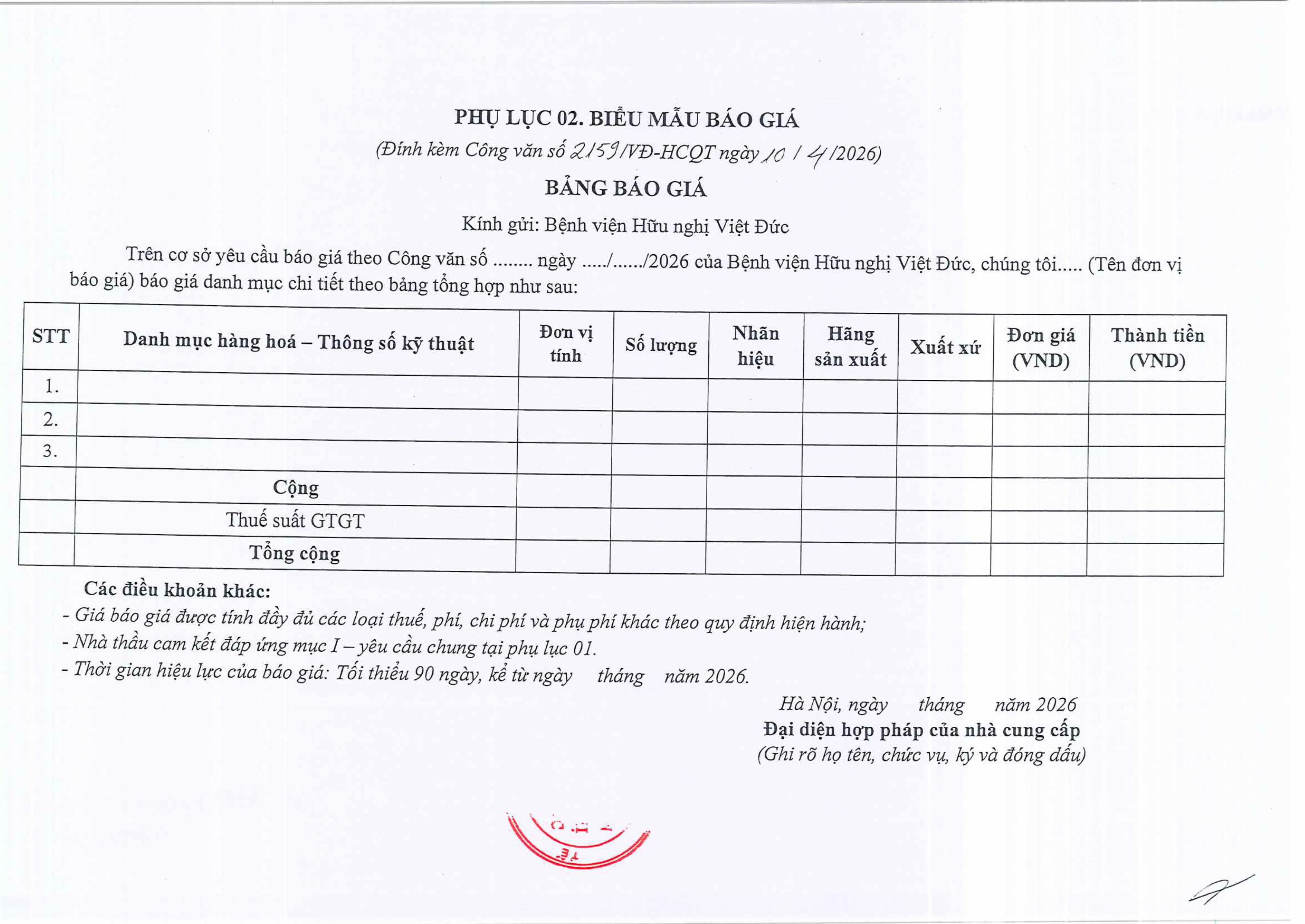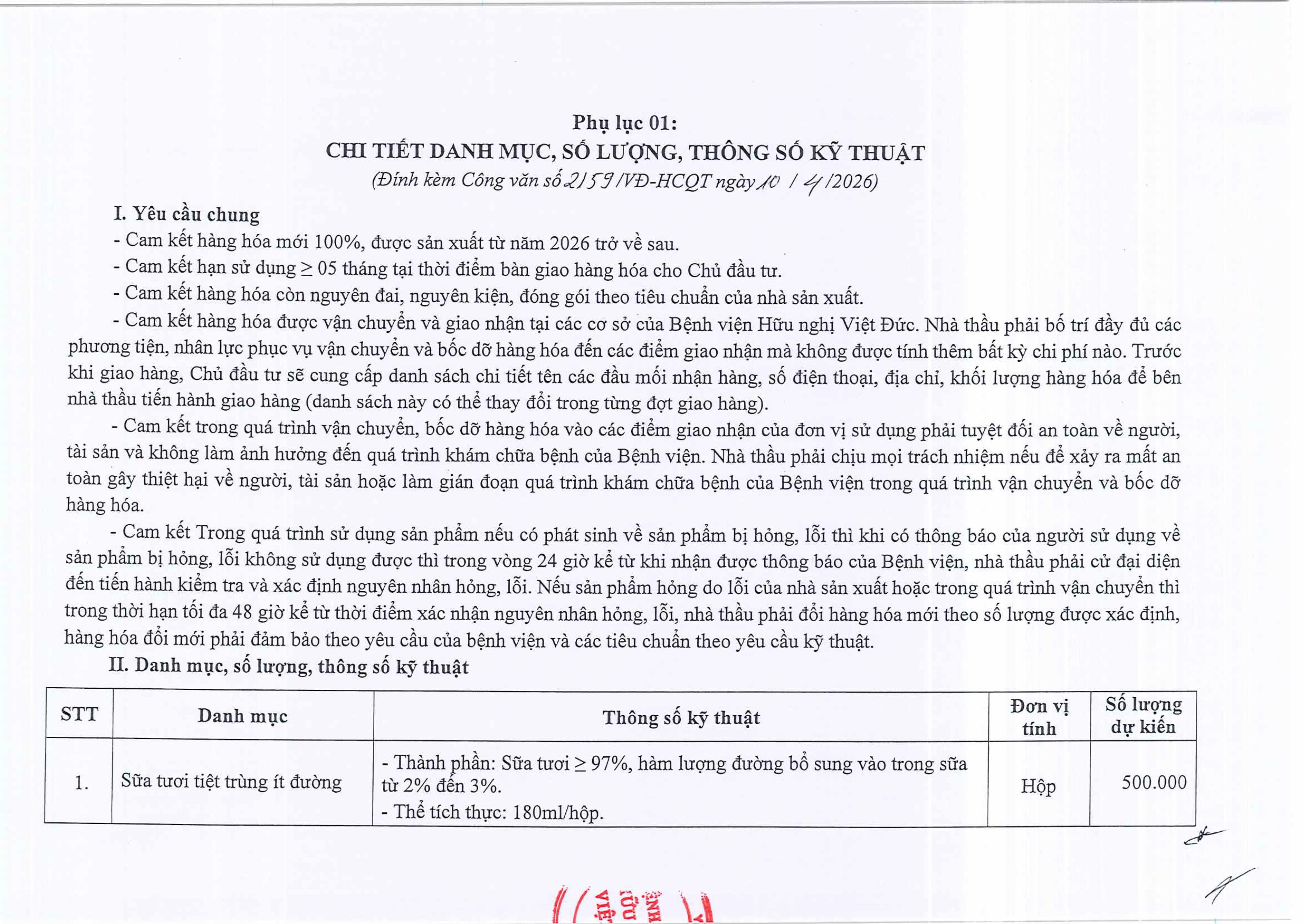 Hiện nay, Bệnh viện Hữu nghị Việt Đức đang có nhu cầu mua sữa tươi tiệt trùng ít đường. Để có thêm cơ sở tham khảo giá sữa tươi tiệt trùng ít đường trên thị trường, Bệnh viện Hữu nghị Việt Đức kính mời các đơn vị, doanh nghiệp tham gia chào giá, chi tiết cụ thể như sau:
