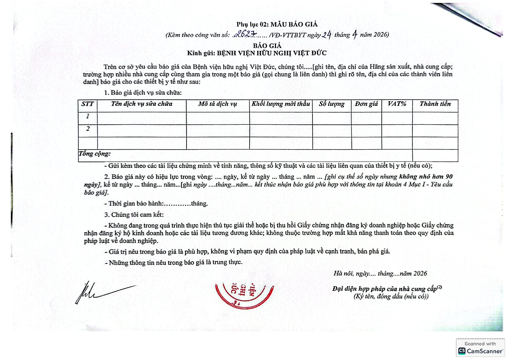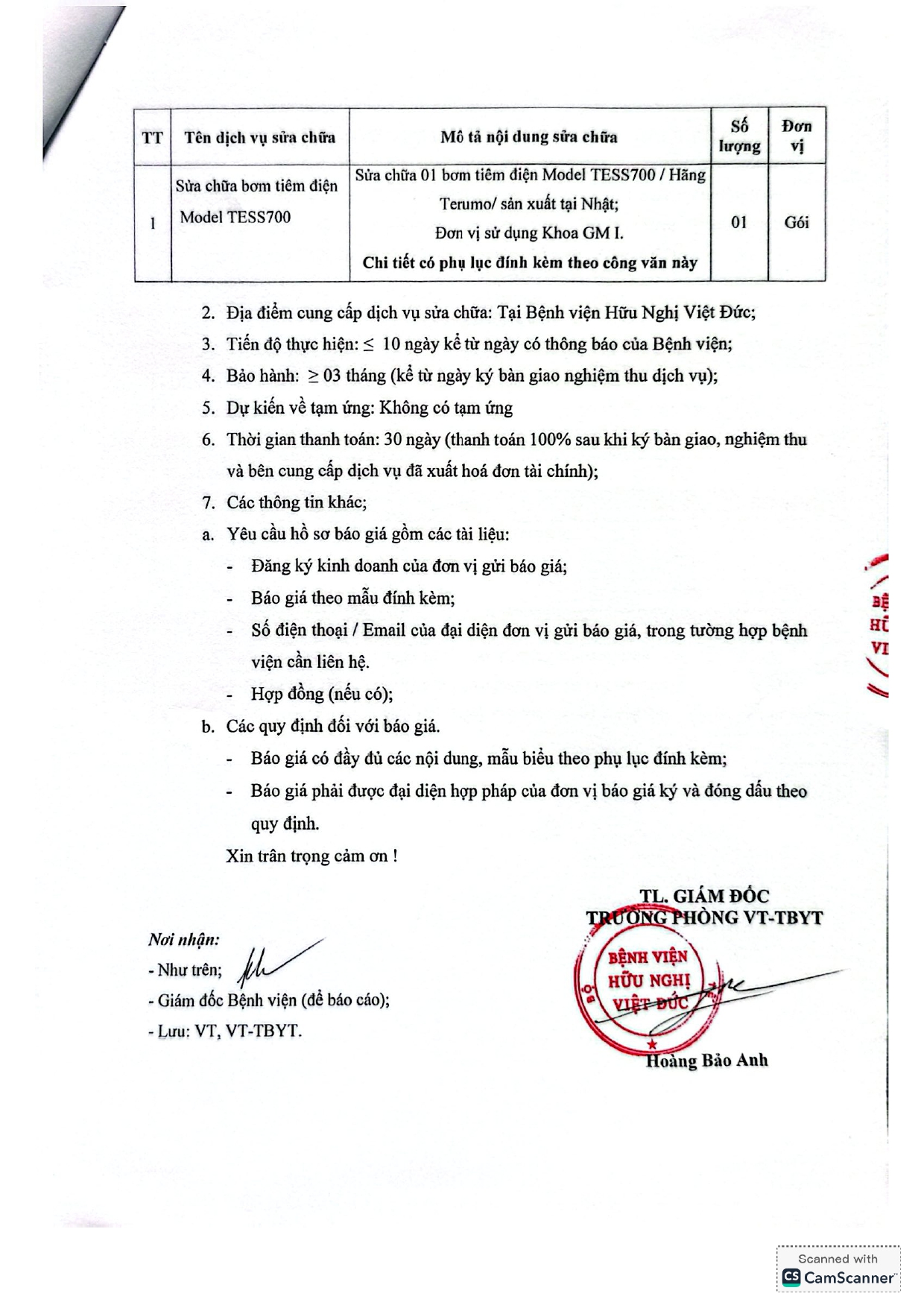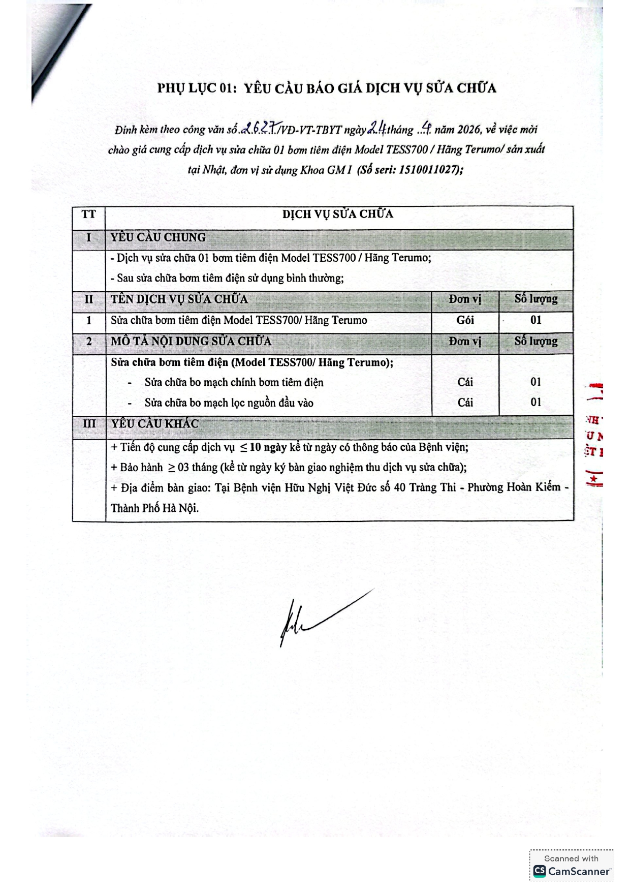 Bệnh viện Hữu Nghị Việt Đức đang có nhu cầu tiếp nhận báo giá để tham khảo xây dựng giá gói thầu làm cơ sở tổ chức lựa chọn nhà thầu cho gói thầu: Cung cấp dịch vụ sửa chữa 01 bơm tiêm điện Model TESS700 / Hãng Terumo/ sản xuất tại Nhật, đơn vị sử dụng Khoa GM I với nội dung cụ thể như sau:
