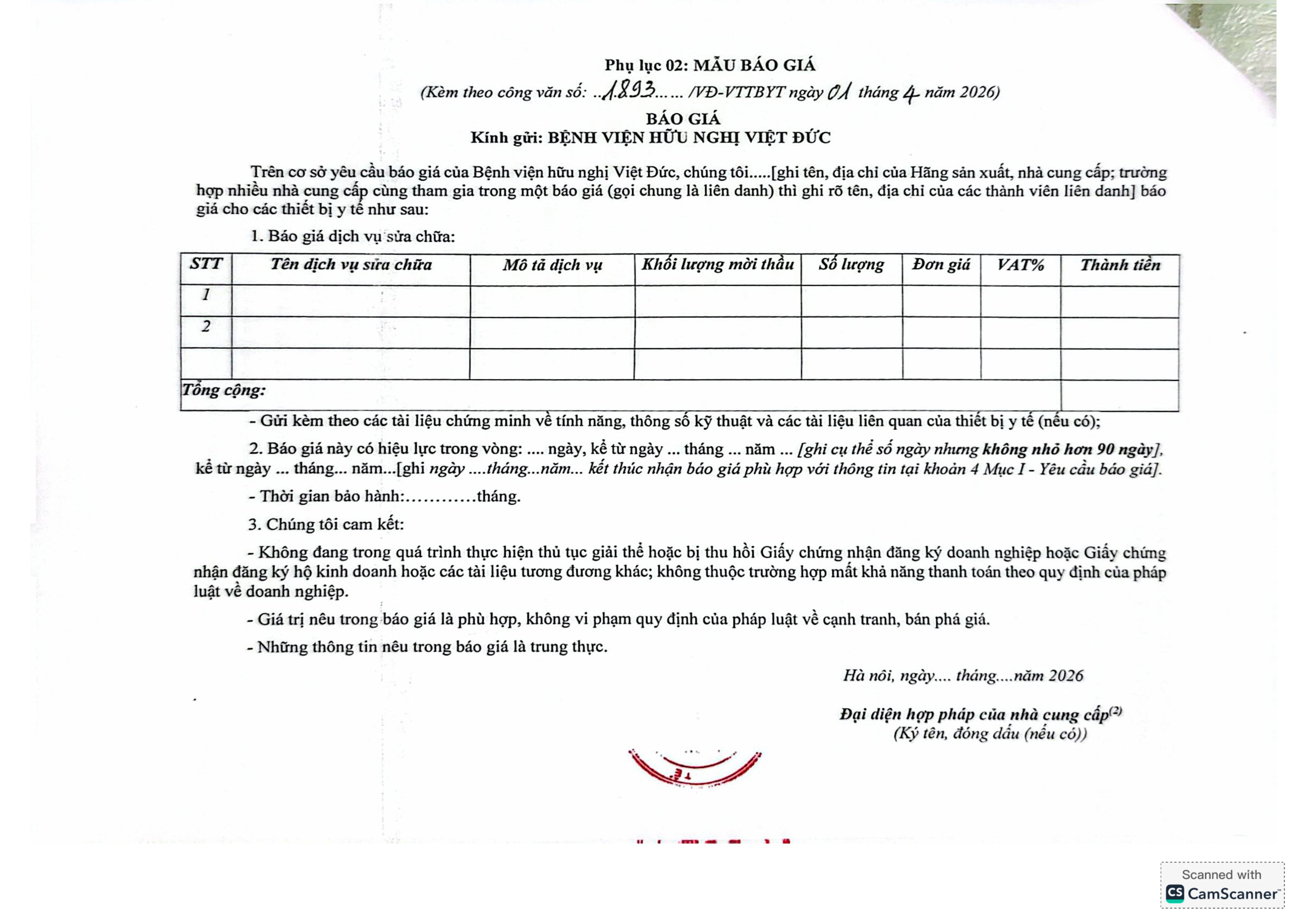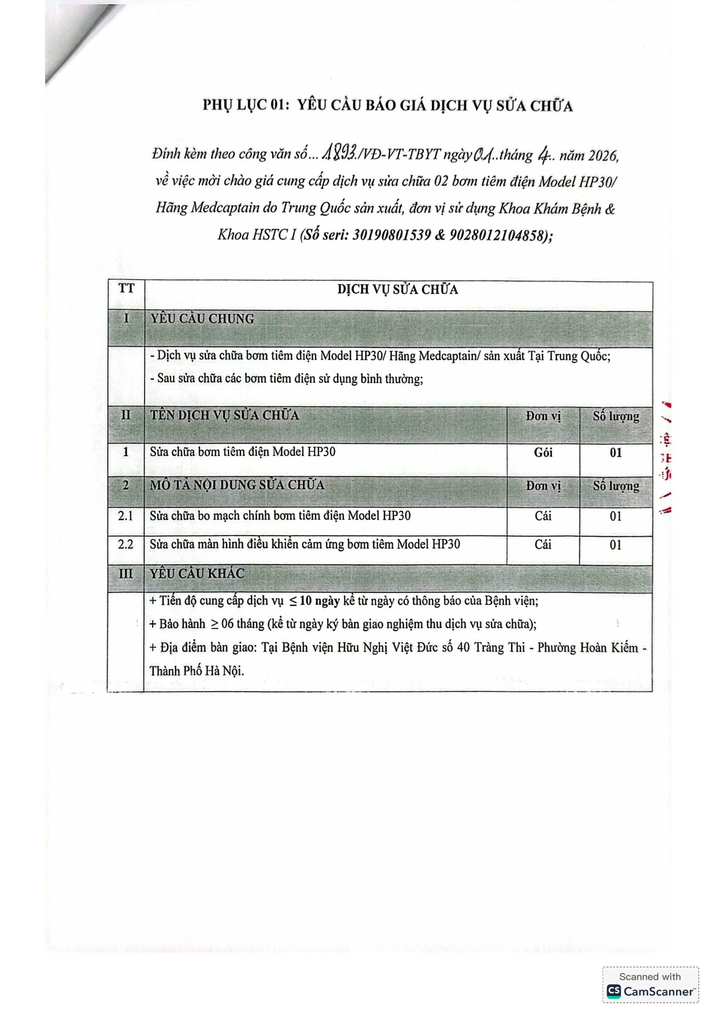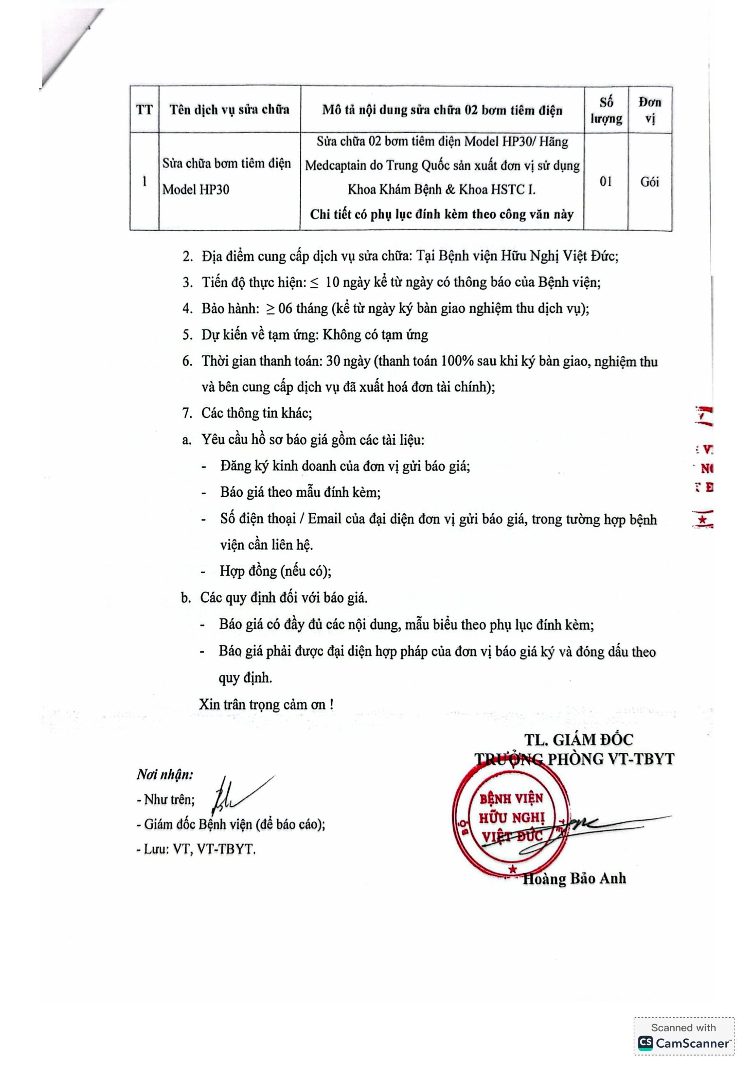 Bệnh viện Hữu Nghị Việt Đức đang có nhu cầu tiếp nhận báo giá để tham khảo xây dựng giá gói thầu làm cơ sở tổ chức lựa chọn nhà thầu cho gói thầu: Cung cấp dịch vụ sửa chữa 02 bơm tiêm điện Model HP30/ Hãng Medcaptain/ do Trung Quốc sản xuất, đơn vị sử dụng Khoa Khám Bệnh & Khoa HSTC I với nội dung cụ thể như sau: