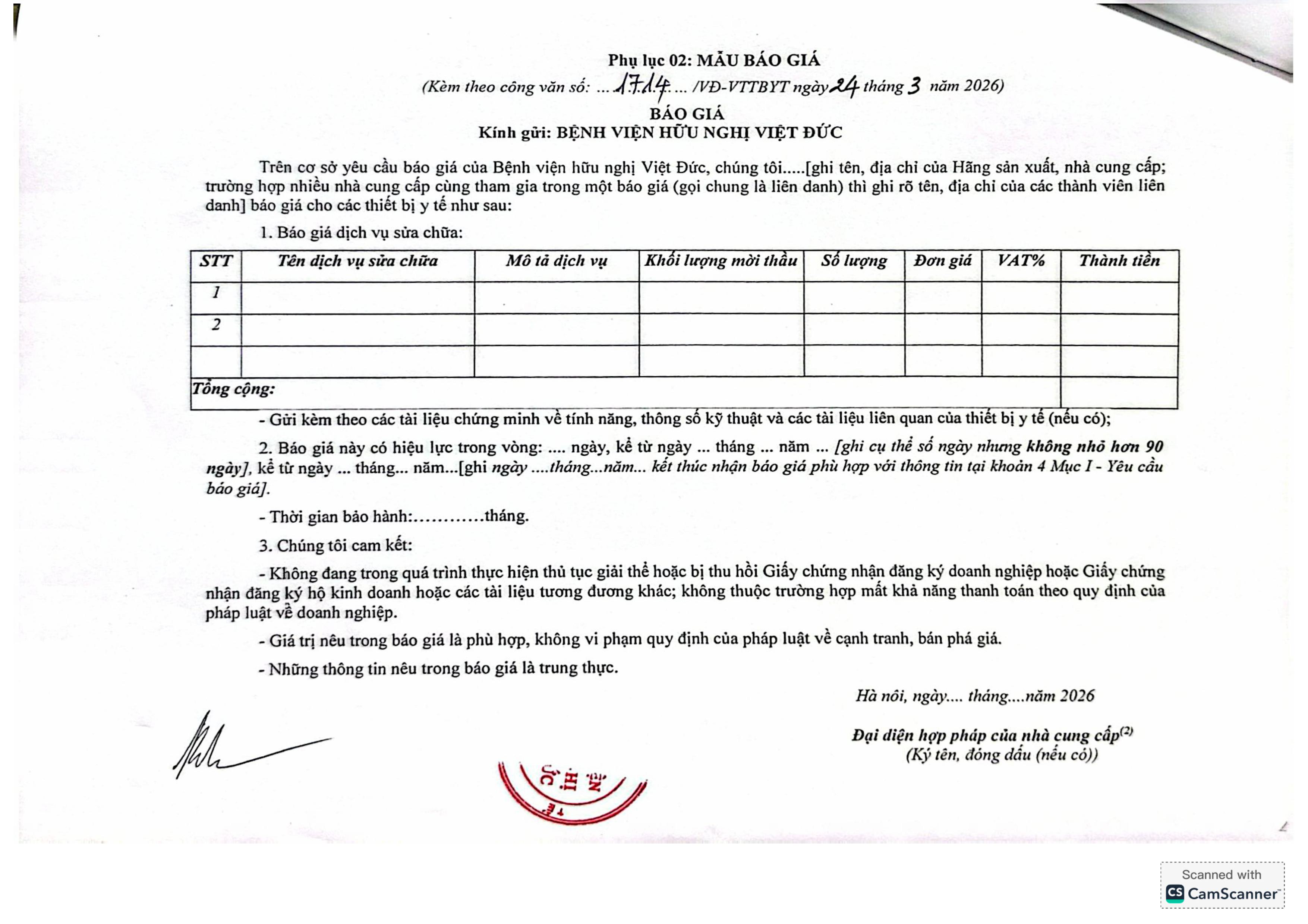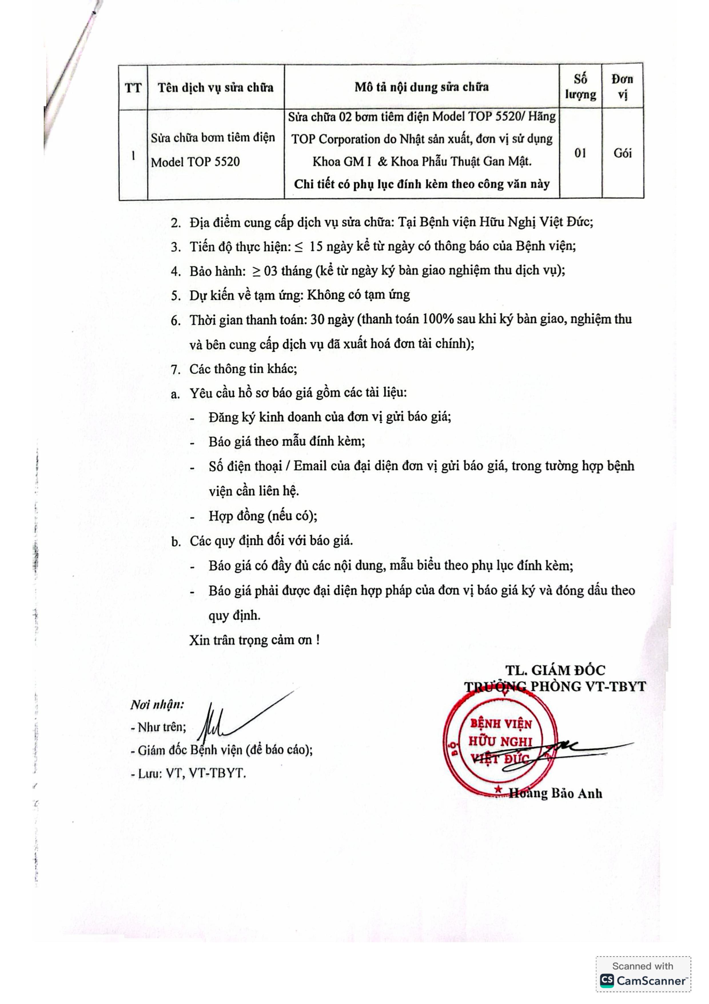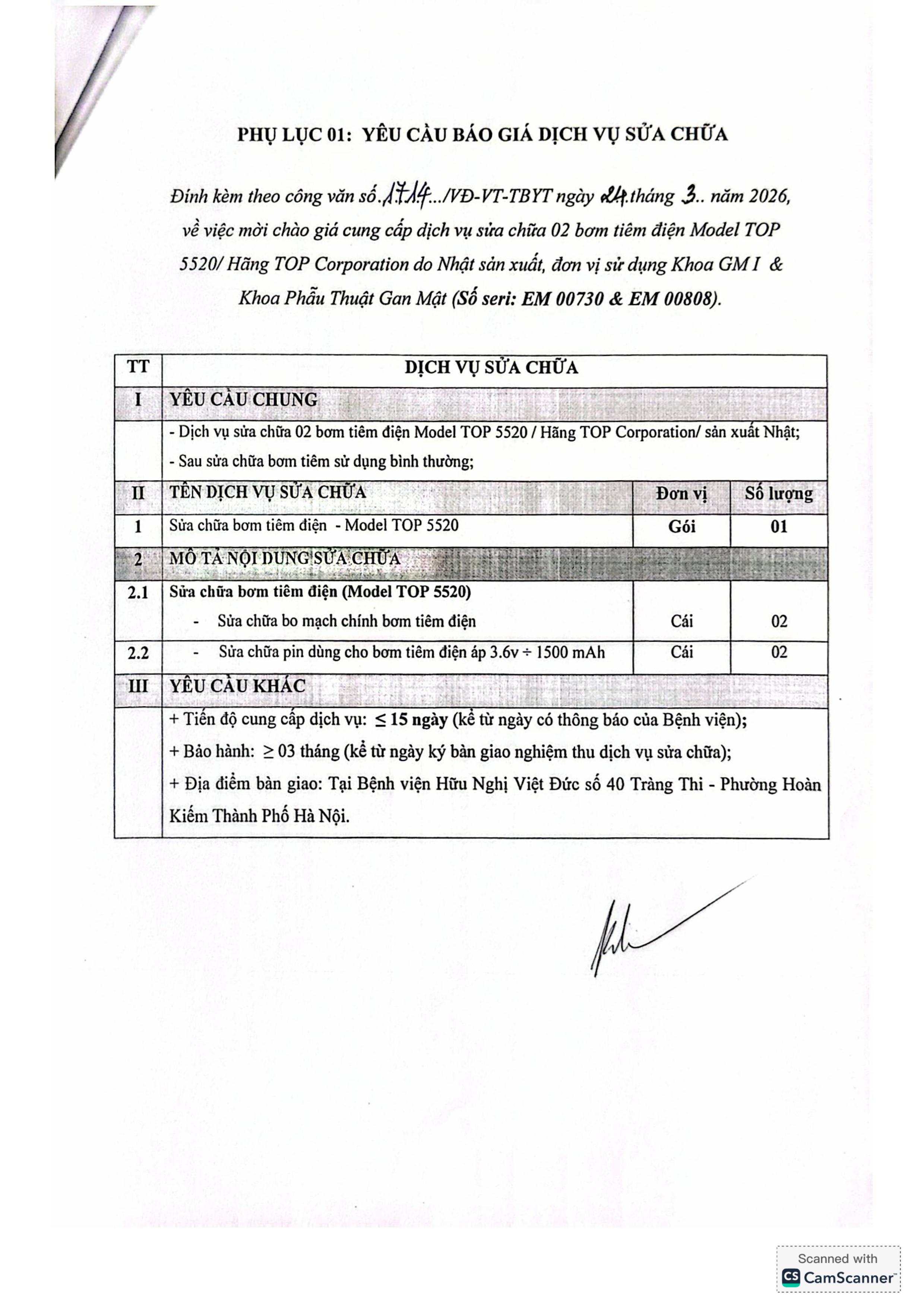 Bệnh viện Hữu Nghị Việt Đức đang có nhu cầu tiếp nhận báo giá để tham khảo xây dựng giá gói thầu làm cơ sở tổ chức lựa chọn nhà thầu cho gói thầu: Cung cấp dịch vụ sửa chữa 02 bơm tiêm điện Model TOP 5520/ Hãng TOP Corporation do Nhật sản xuất, đơn vị sử dụng Khoa GM I & Khoa Phẫu Thuật Gan Mật với nội dung cụ thể như sau: