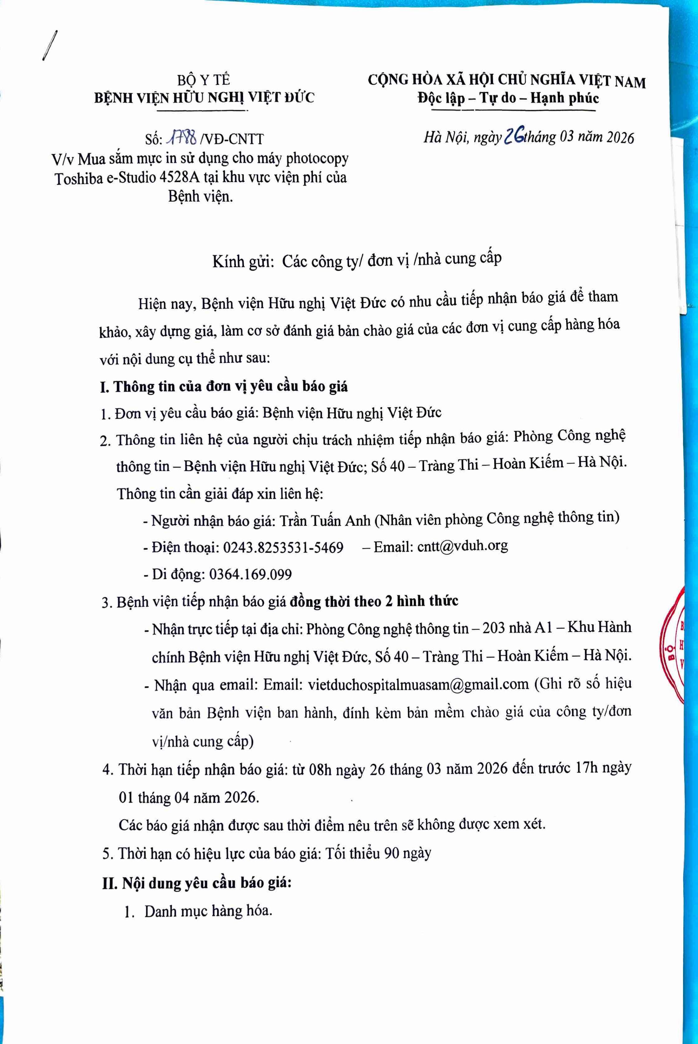 Bệnh viện Hữu nghị Việt Đức mời báo giá phục vụ tổ chức “Hội nghị khoa học quốc tế Bệnh viện Hữu nghị Việt Đức năm 2025”