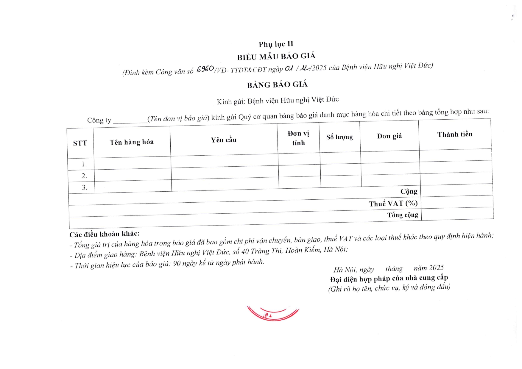 Hiện nay, Bệnh viện Hữu nghị Việt Đức có nhu cầu tiếp nhận báo giá để tham khảo, xây dựng giá, làm cơ sở tổ chức lựa chọn đơn vị cung cấp dịch vụ in chứng chỉ, vỏ chứng chỉ phục vụ công tác đào tạo các lớp kết thúc tháng 12 năm 2025, Quý I năm 2026 của Bệnh viện với nội dung cụ thể như sau: