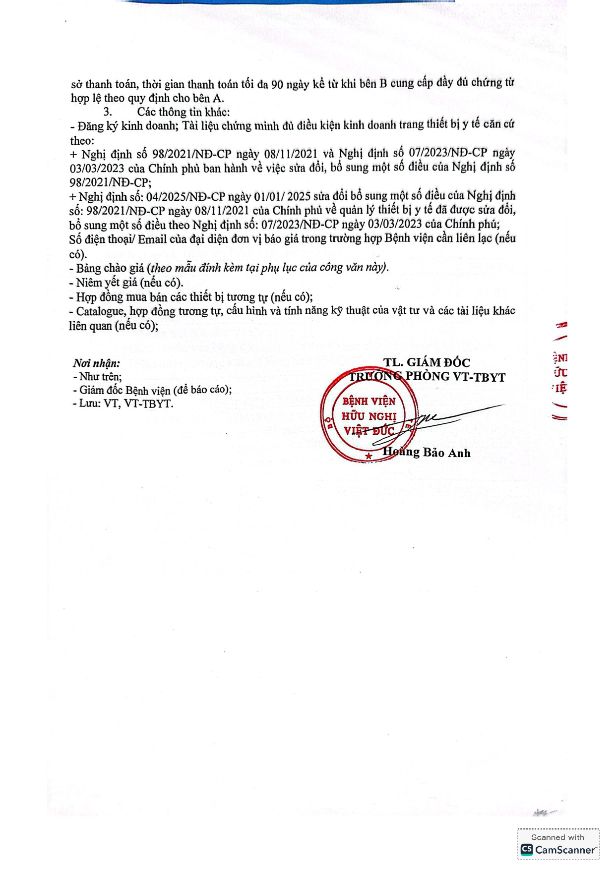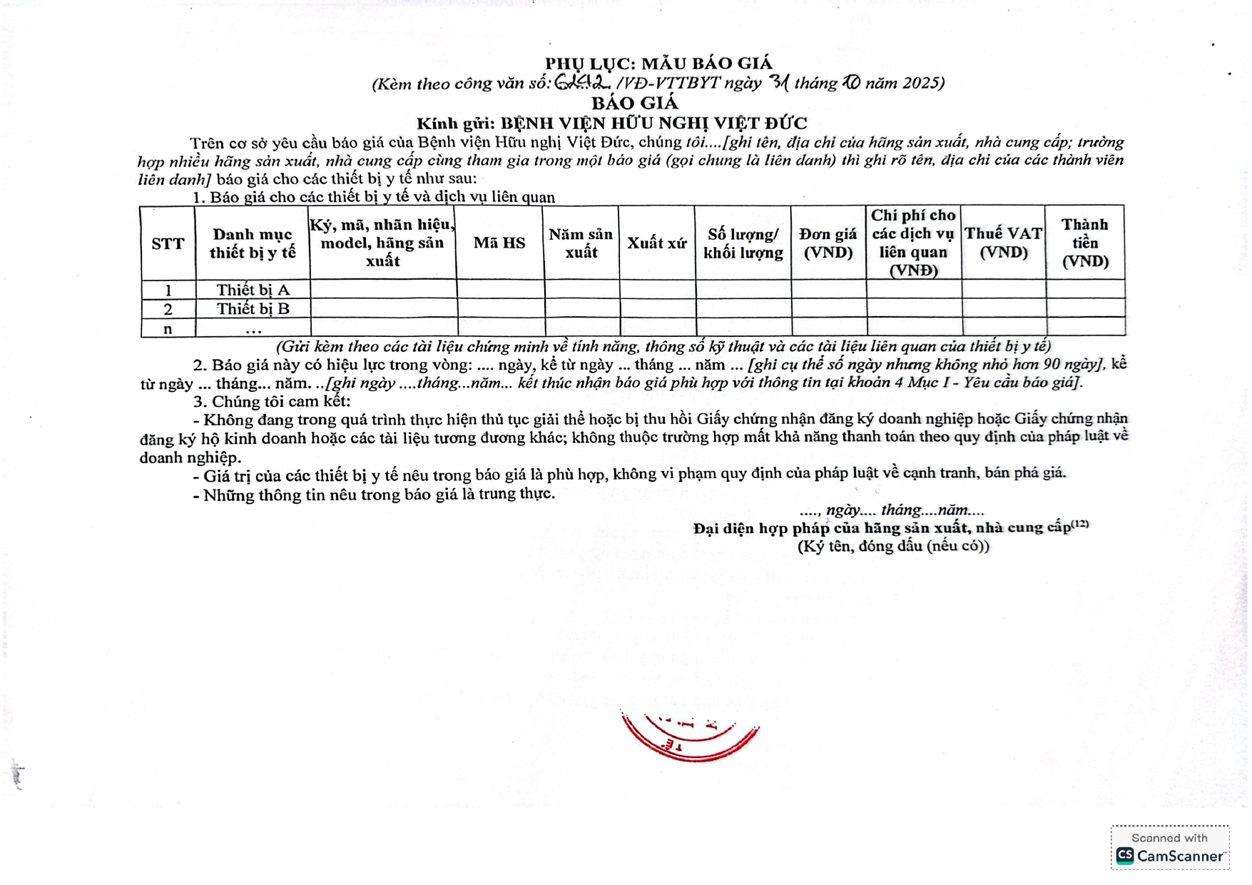 Bệnh viện Hữu nghị Việt Đức có nhu cầu tiếp nhận báo giá để tham khảo, xây dựng giá gói thầu, làm cơ sở tổ chức lựa chọn nhà thầu cho hồ sơ mua sắm linh kiện, phụ kiện, vật tư thay thế sử dụng cho trang thiết bị y tế với nội dung cụ thể như sau: