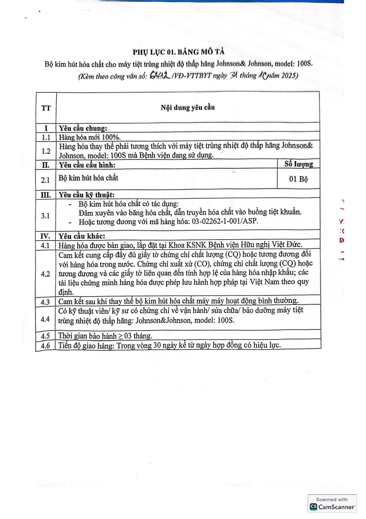 Bệnh viện Hữu nghị Việt Đức mời chào báo giá bộ kim hút hóa chất cho máy tiệt trùng nhiệt độ thấp hãng Johnson& Johnson, model: 100S
