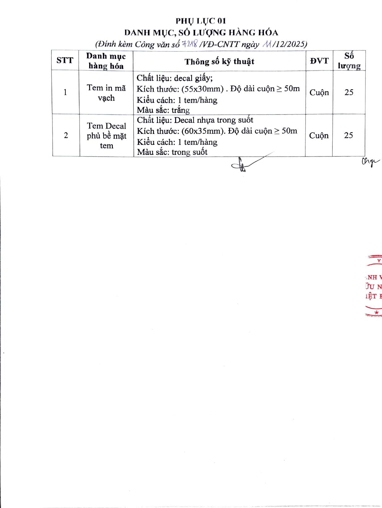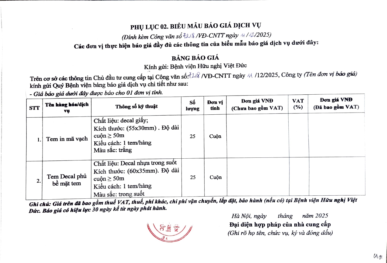 Hiện nay, Bệnh viện Hữu nghị Việt Đức có nhu cầu mua sắm các mặt hàng phục vụ in tem tài sản cố định, để có cơ sở tham khảo giá dịch vụ trên thị trường, Bệnh viện Hữu Nghị Việt Đức kính mời các Doanh nghiệp/Tổ chức/Đơn vị kinh doanh có khả năng cung cấp báo giá hàng hóa (chi tiết danh mục, số lượng được giới thiệu tại phụ lục 01 kèm theo):