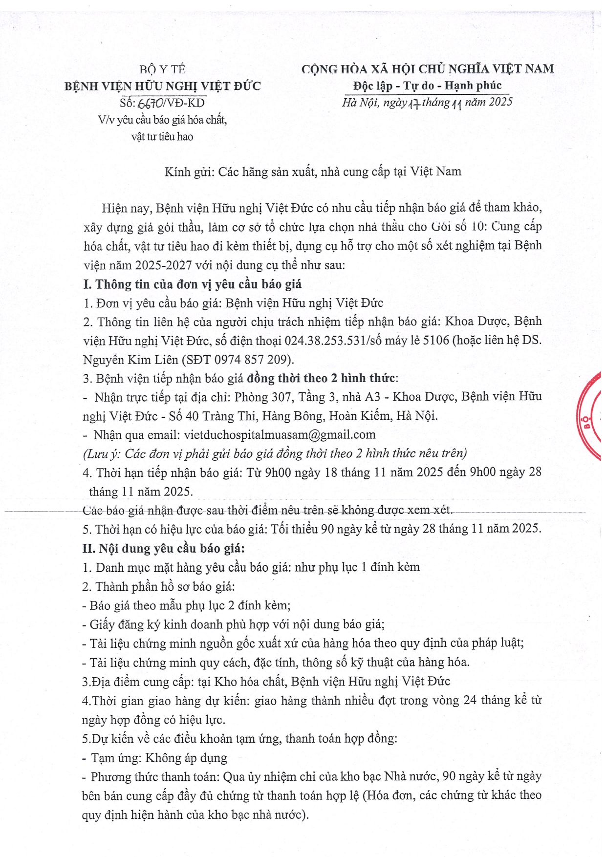Hiện nay, Bệnh Viện Hữu Nghị Việt Đức đang có nhu cầu mua mới 01 bóng phát tia X – Quang (lắp cho máy Model: TiTan 2000 Dual plus /Hãng: VIKOMES / Năm sử dụng 2018 – Số máy: 30009010415) tại Khoa CĐHA dãy nhà C2 phòng 128. Để có cơ sở xây dựng giá dự toán, Bệnh Viện Hữu nghị Việt Đức mời các đơn vị, doanh nghiệp kinh doanh có khả năng cung cấp 01 bóng phát tia X – Quang trên dùng tại phòng khám cấp cứu chi tiết theo phụ lục 2 đính kèm theo công văn này.