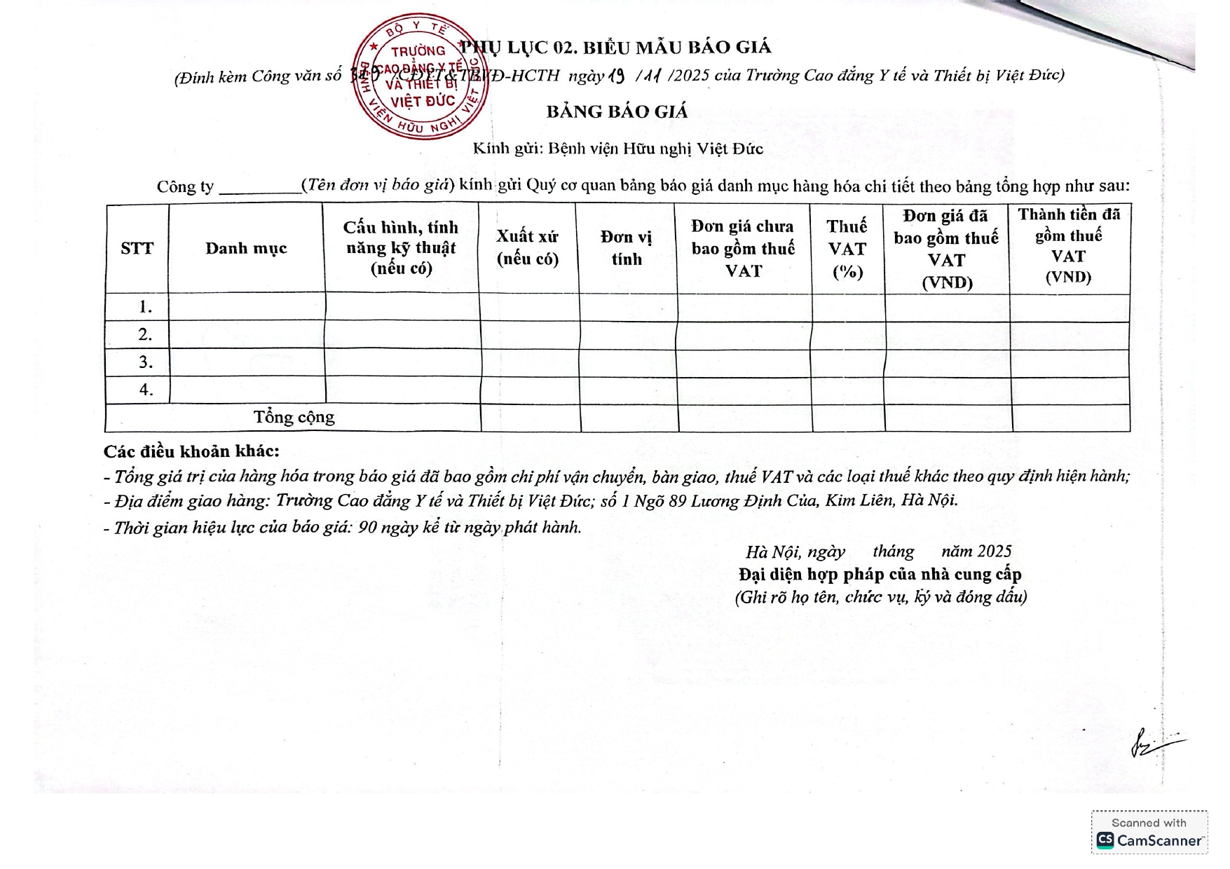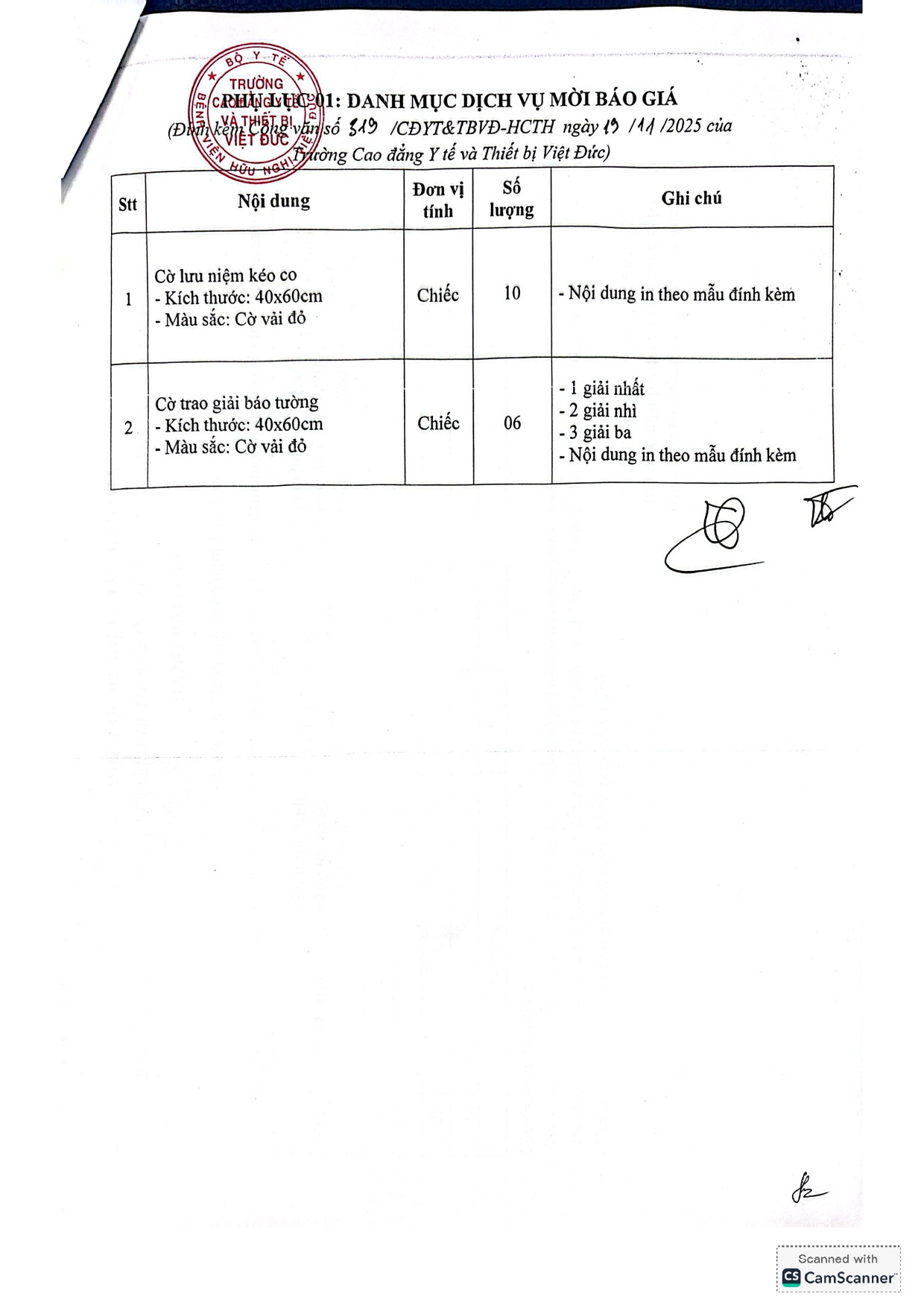 Hiện nay, Bệnh viện Hữu nghị Việt Đức có nhu tiếp nhận báo giá lựa chọn nhà cung cấp cờ trao giải phục vụ hoạt động chào mừng 20/11 ngày Nhà giáo Việt Nam tại Trường Cao đẳng Y tế và Thiết bị Việt Đức với nội dung cụ thể như sau: