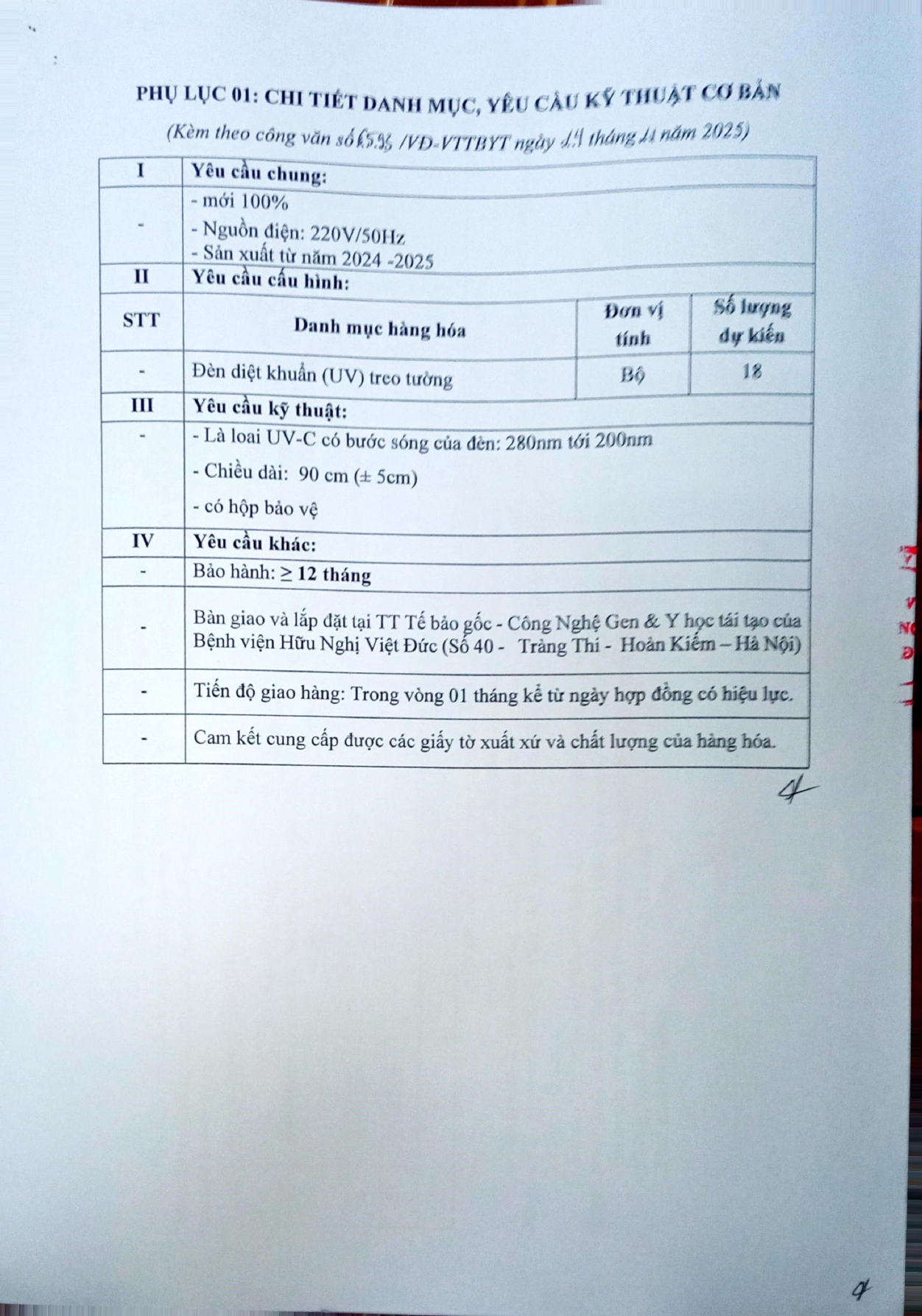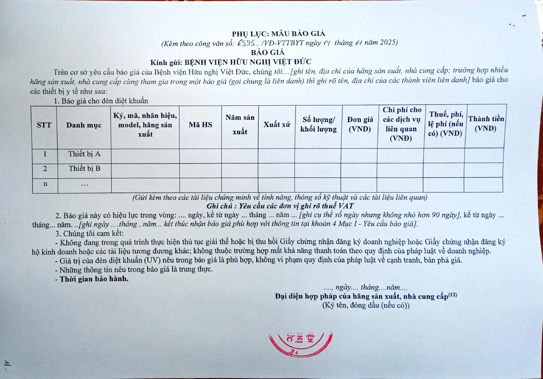 Bệnh viện Hữu nghị Việt Đức có nhu cầu tiếp nhận báo giá để tham khảo, xây dựng giá gói thầu, làm cơ sở tổ chức lựa chọn nhà cung cấp đèn diệt khuẩn với nội dung cụ thể như sau: