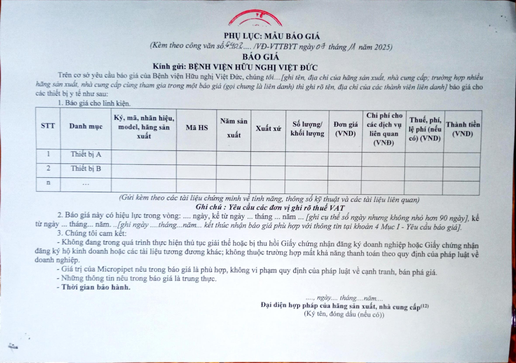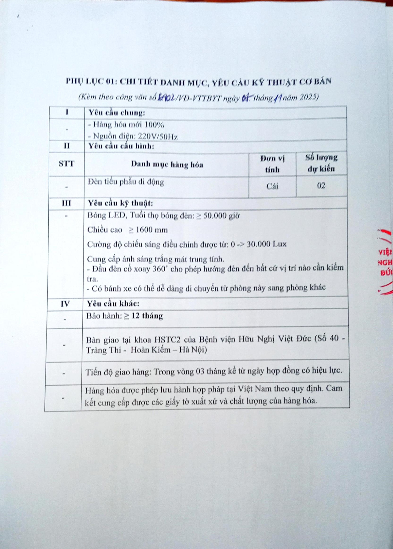 Bệnh viện Hữu nghị Việt Đức có nhu cầu tiếp nhận báo giá để tham khảo, xây dựng giá gói thầu, làm cơ sở tổ chức lựa chọn nhà cung cấp đèn tiểu phẫu với nội dung cụ thể như sau: