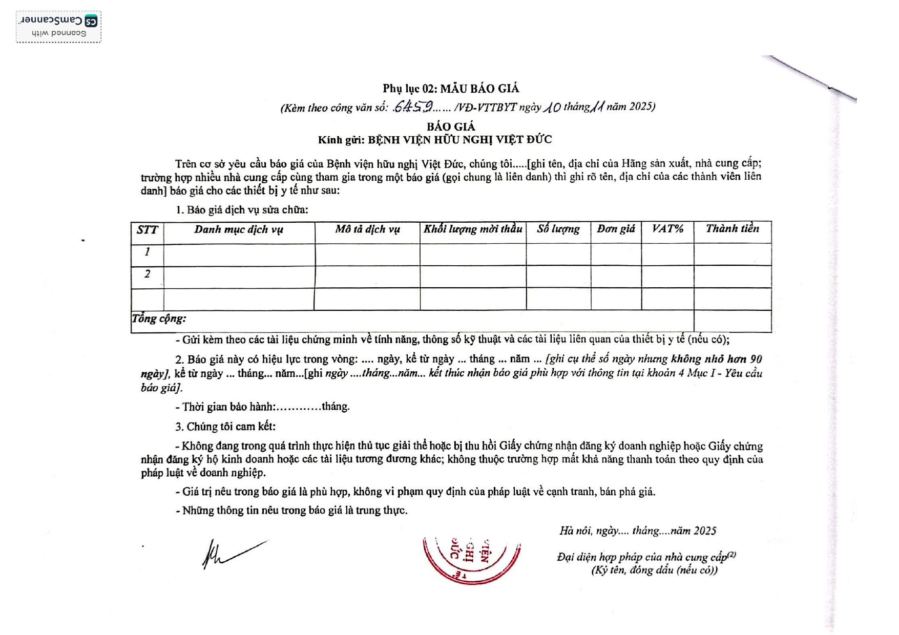 Bệnh viện Hữu Nghị Việt Đức đang có nhu cầu tiếp nhận báo giá để tham khảo xây dựng giá gói thầu làm cơ sở tổ chức lựa chọn nhà thầu cho gói thầu: Cung cấp dịch vụ sửa chữa 04 bơm tiêm điện Model HP30/ Hãng Medcaptain tại các Khoa/ Phòng với nội dung cụ thể như sau: