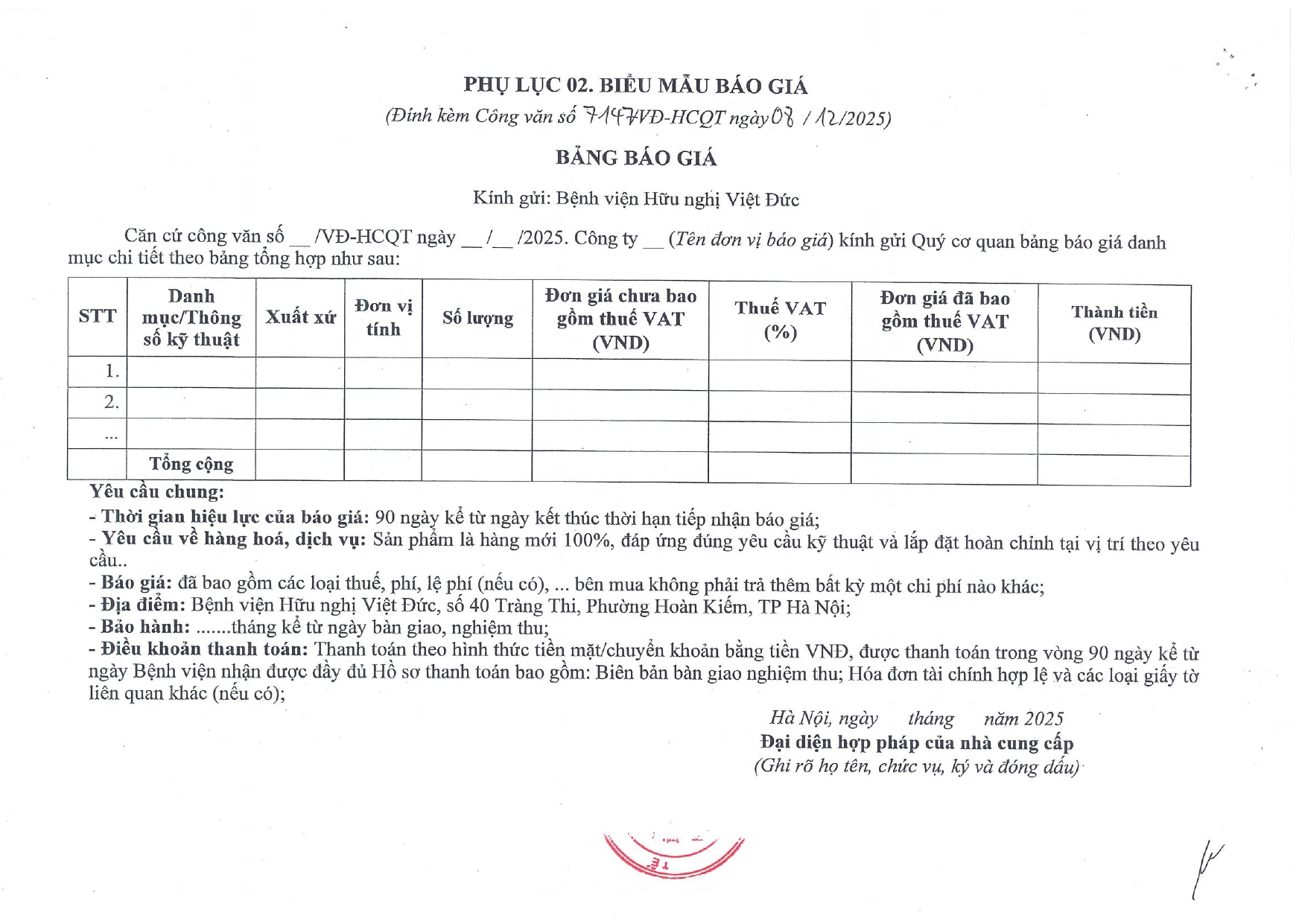Hiện nay, Bệnh viện Hữu nghị Việt Đức có nhu cầu mua sắm, thay thế bộ nguồn sạc điện cho ắc-quy của Máy phát điện dự phòng công suất 1000kVA số 1 tại Bệnh viện. Để có cơ sở xây dựng dự toán và thực hiện hồ sơ mua sắm theo đúng quy định hiện hành, Bệnh viện Hữu nghị Việt Đức kính mời Quý đơn vị quan tâm tham gia báo giá, với nội dung cụ thể như sau: