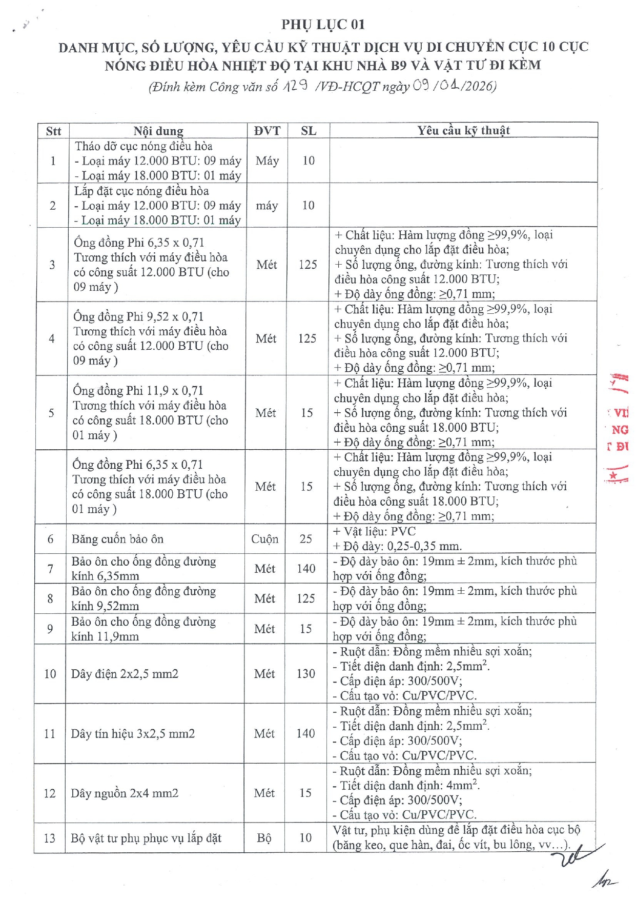 Hiện nay, Bệnh viện Hữu nghị Việt Đức có nhu cầu di chuyển 10 cục nóng điều hòa nhiệt độ tại khu nhà B9 của Bệnh viện. Để có cơ sở tham khảo giá dịch vụ di chuyển cục nóng điều hòa nhiệt độ và vật tư đi kèm trên thị trường, Bệnh viện Hữu nghị Việt Đức kính mời các đơn vị có khả năng cung cấp đến khảo sát và tham gia báo giá với nội dung cụ thể như sau: