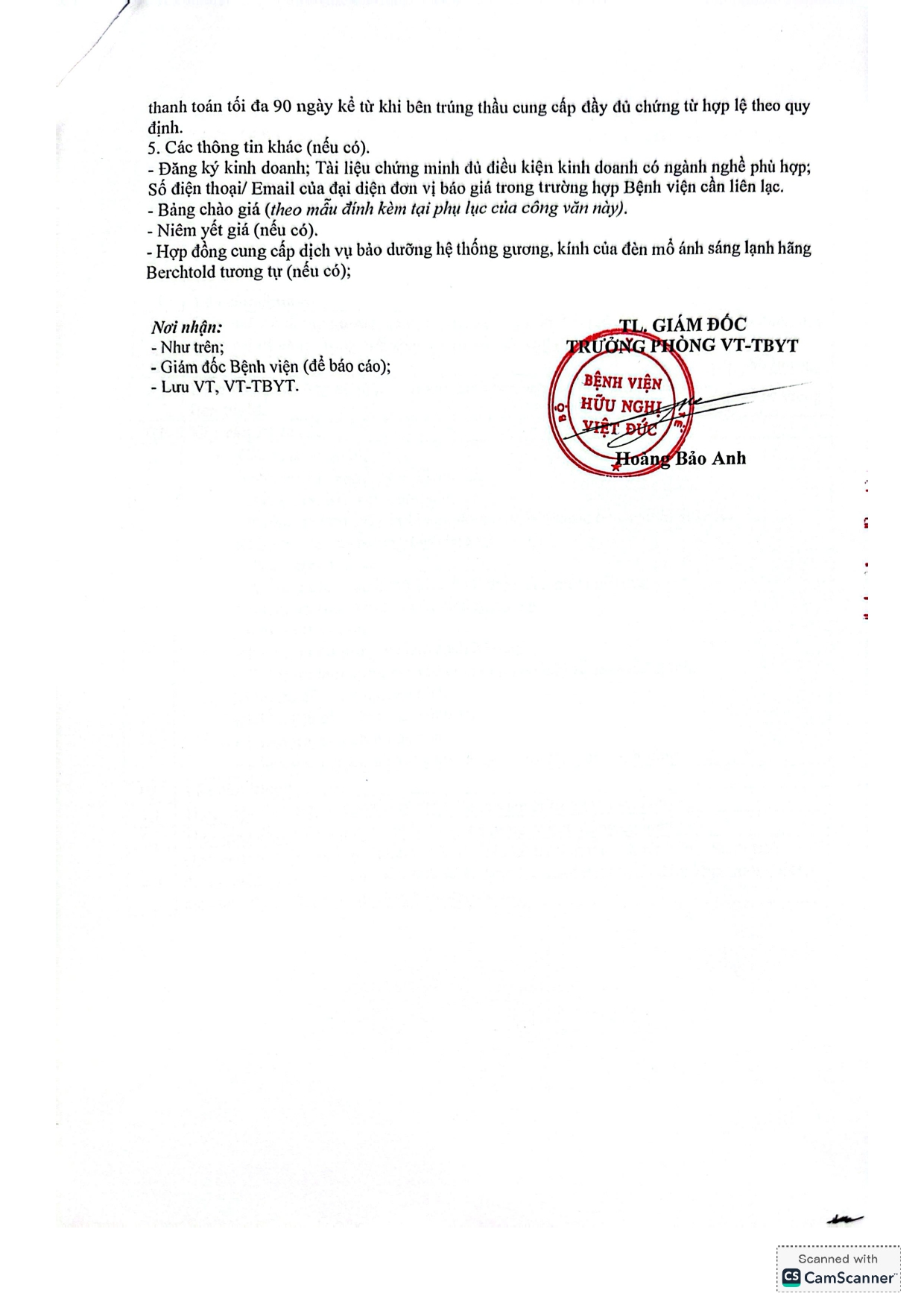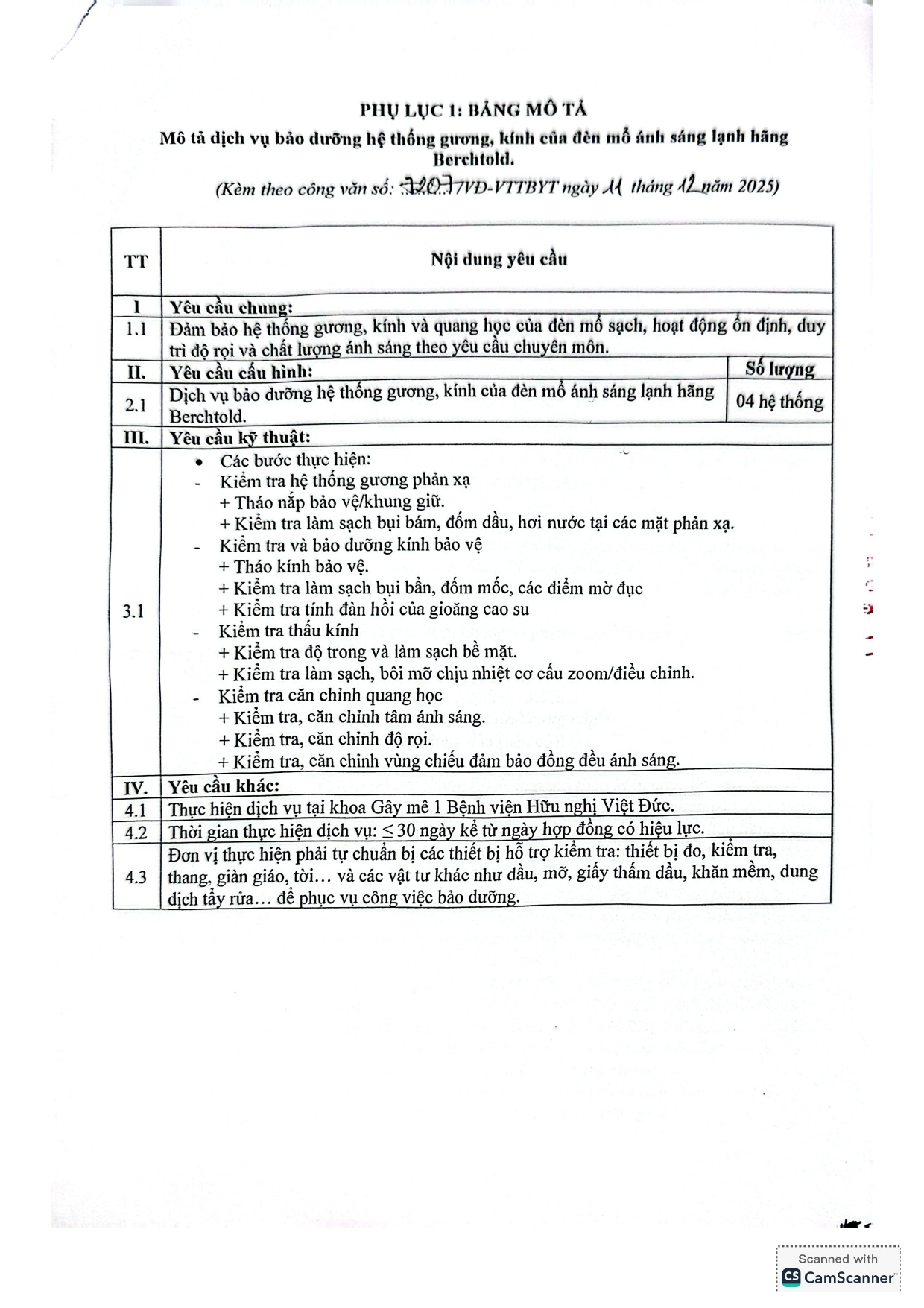 Bệnh viện Hữu nghị Việt Đức mời chào báo giá dịch vụ bảo dưỡng hệ thống gương, kính của đèn mổ ánh sáng lạnh hãng Berchtold