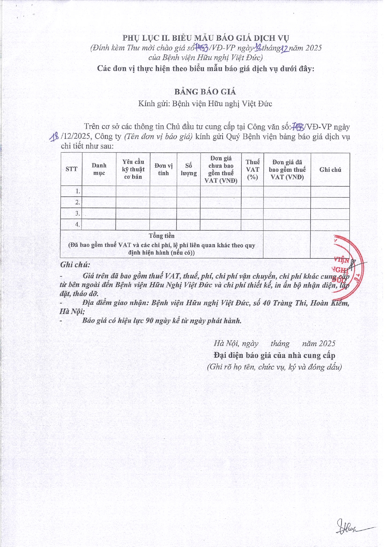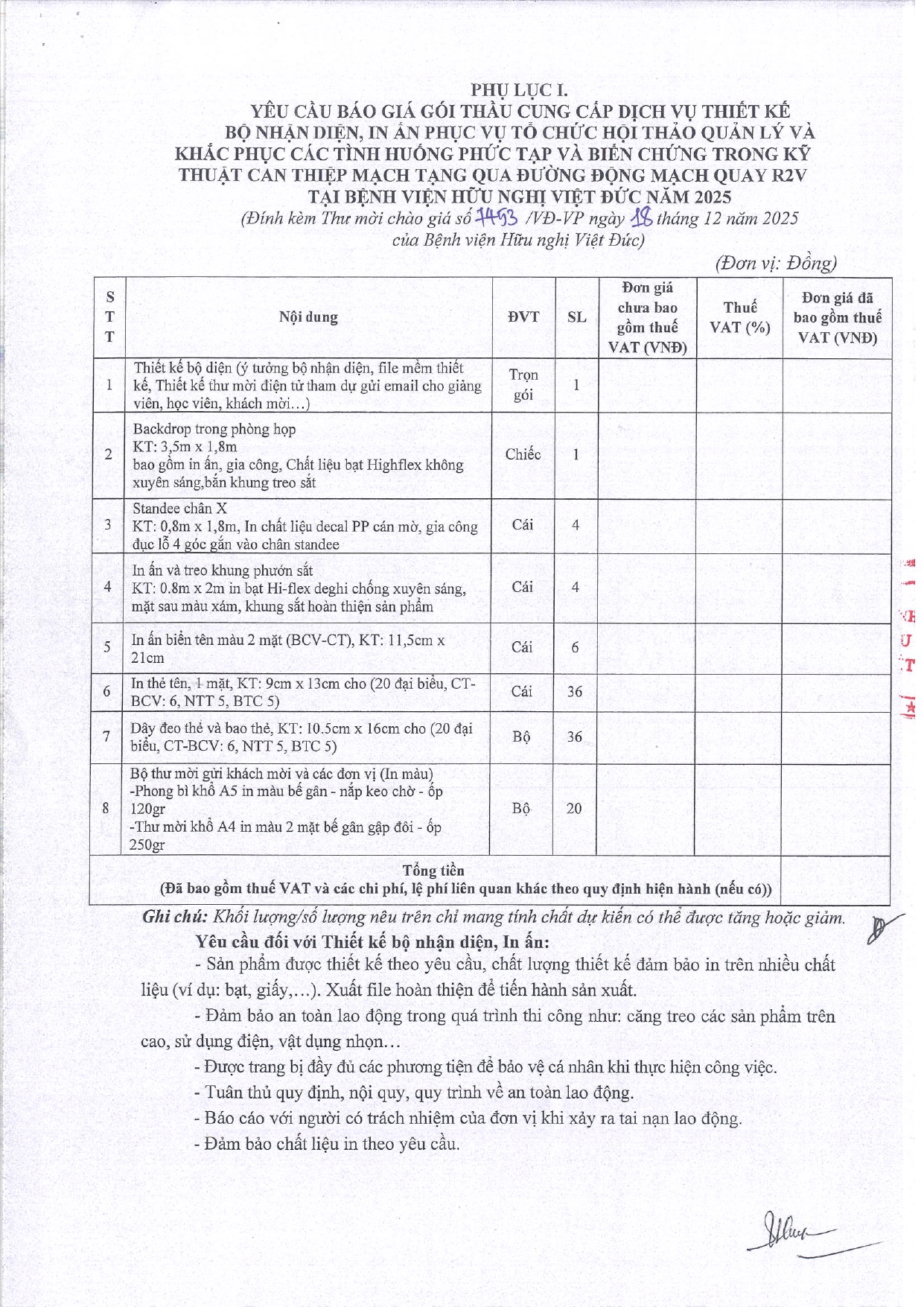 Hiện nay, Bệnh viện Hữu nghị Việt Đức có nhu cầu tiếp nhận báo giá để tham khảo, xây dựng giá gói thầu, làm cơ sở tổ chức lựa chọn nhà thầu cho gói thầu cung cấp dịch vụ thiết kế bộ nhận diện, in ấn phục vụ tổ chức Hội thảo quản lý và khắc phục các tình huống phức tạp và biến chứng trong kỹ thuật can thiệp mạch tạng qua đường động mạch quay R2V tại Bệnh viện Hữu nghị Việt Đức năm 2025, với nội dung cụ thể như sau: