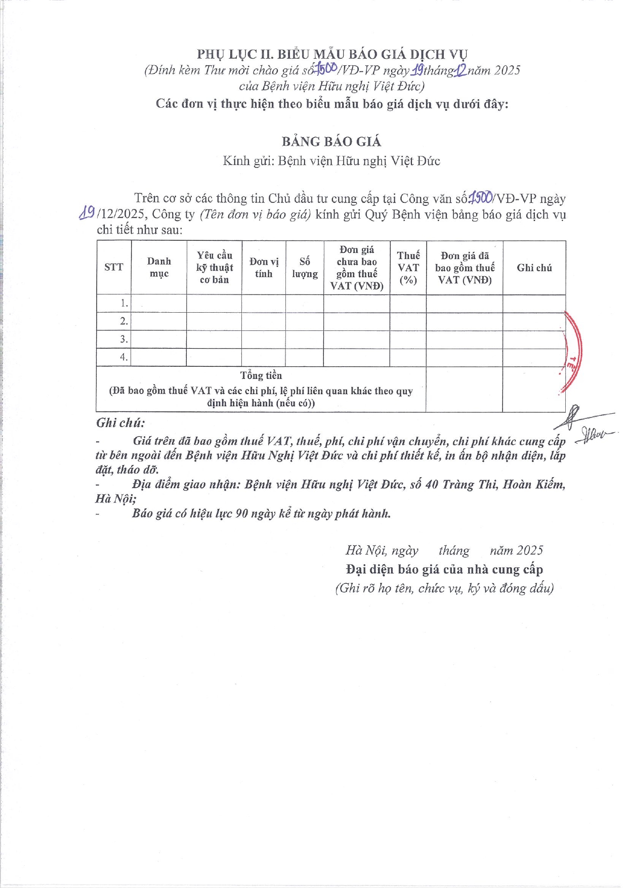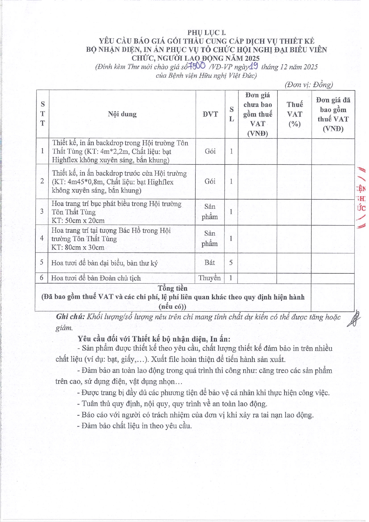 Hiện nay, Bệnh viện Hữu nghị Việt Đức có nhu cầu tiếp nhận báo giá để tham khảo, xây dựng giá gói thầu, làm cơ sở tổ chức lựa chọn nhà thầu cho gói thầu cung cấp dịch vụ thiết kế bộ nhận diện, in ấn và Hoa tươi trang trí khánh tiết phục vụ tổ chức hội nghị đại biểu viên chức, người lao động năm 2025, với nội dung cụ thể như sau: