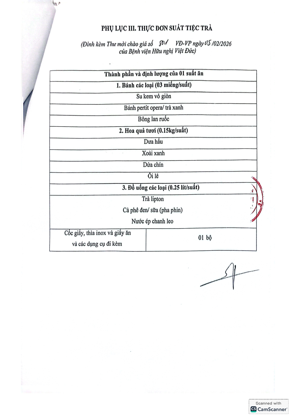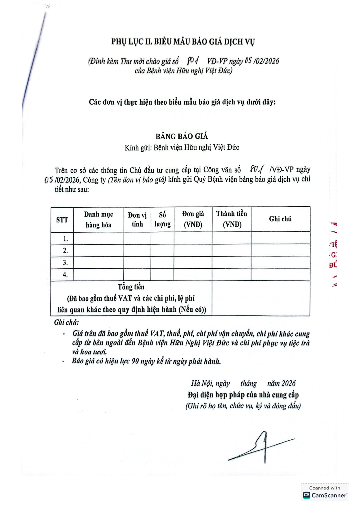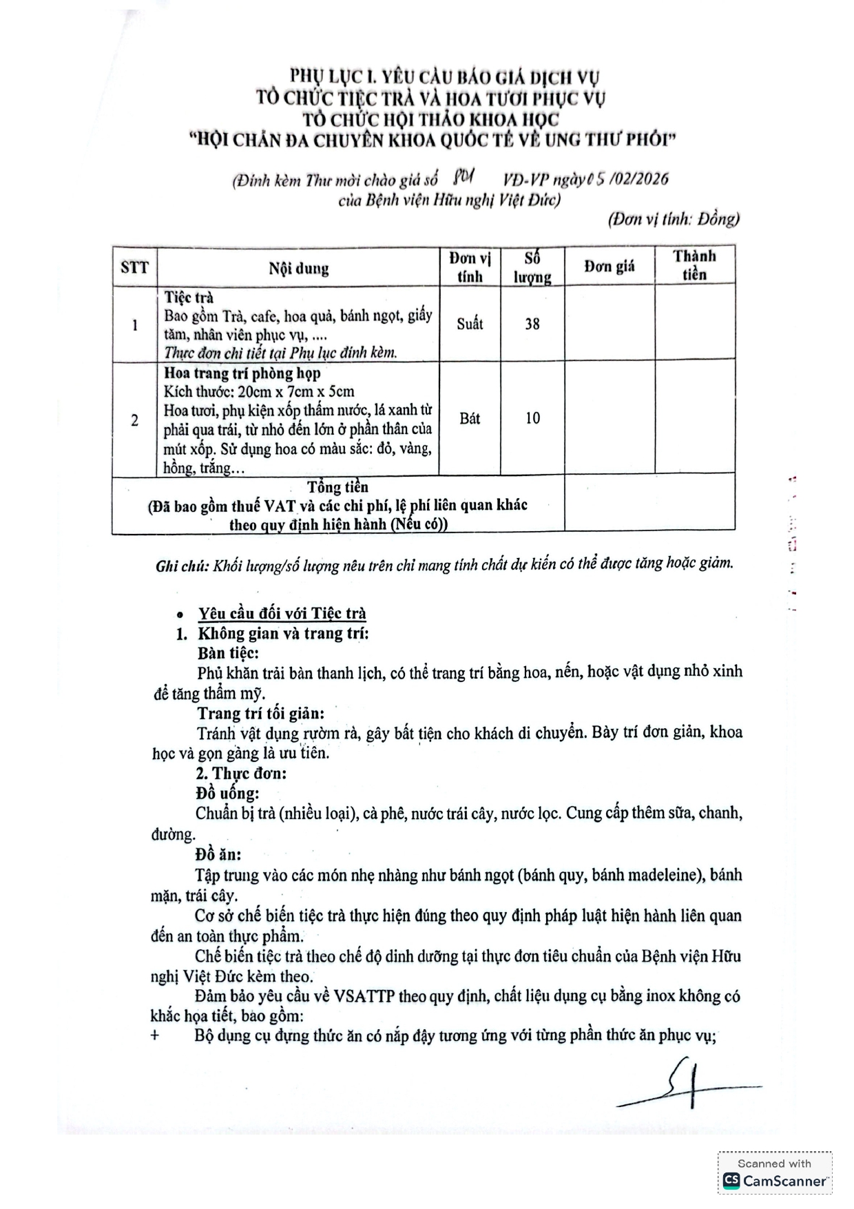 Hiện nay, Bệnh viện Hữu nghị Việt Đức có nhu cầu tiếp nhận báo giá để cung cấp dịch vụ tiệc trà và hoa tươi phục vụ tổ chức Hội thảo khoa học “Hội chẩn đa chuyên khoa quốc tế về ung thư phổi” ngày 04/03/2026 tại Bệnh viện Hữu nghị Việt Đức, với nội dung cụ thể như sau: