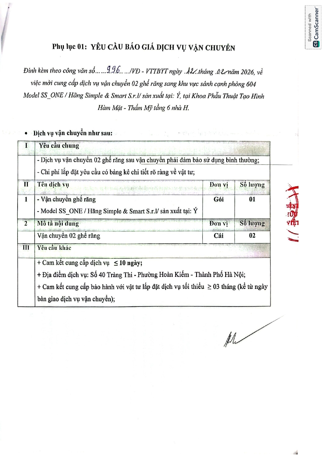 Bệnh viện Hữu nghị Việt Đức có nhu cầu tiếp nhận báo giá để tham khảo, xây dựng giá gói thầu: Dịch vụ vận chuyển 02 ghế răng sang khu vực sảnh cạnh phòng 604 Model SS_ ONE / Hãng Simple & Smart S.r.l/ sản xuất tại: Ý, tại Khoa Phẫu Thuật Tạo Hình Hàm Mặt Thẩm Mỹ tầng 6 nhà H với nội dung cụ thể như sau: