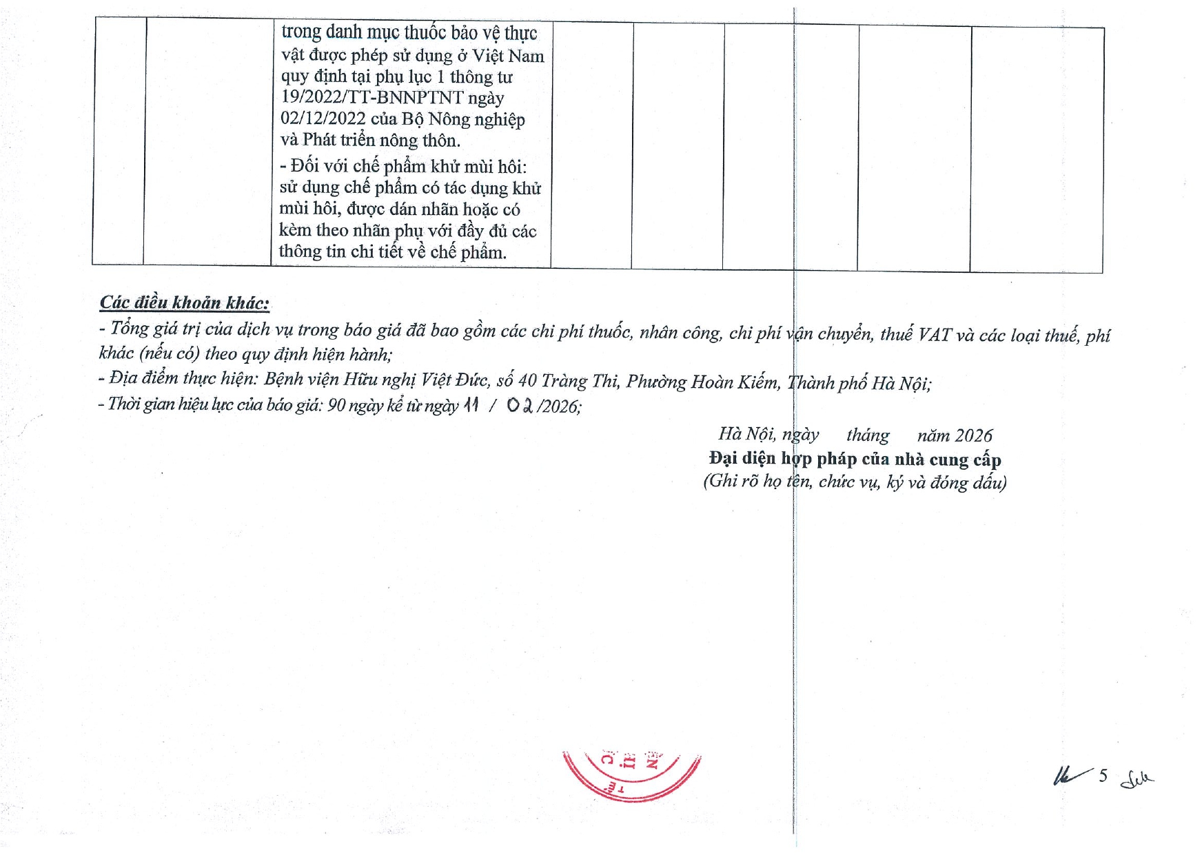 Nhằm phục vụ công tác kiểm soát dịch hại trong khuôn viên Bệnh viện, hiện nay Bệnh viện Hữu nghị Việt Đức có nhu cầu thực hiện dịch vụ diệt muỗi, diệt chuột. Để có cơ sở tham khảo giá trên thị trường, Bệnh viện trân trọng kính mời các đơn vị, doanh nghiệp có khả năng cung cấp dịch vụ gửi báo giá theo nội dung sau: