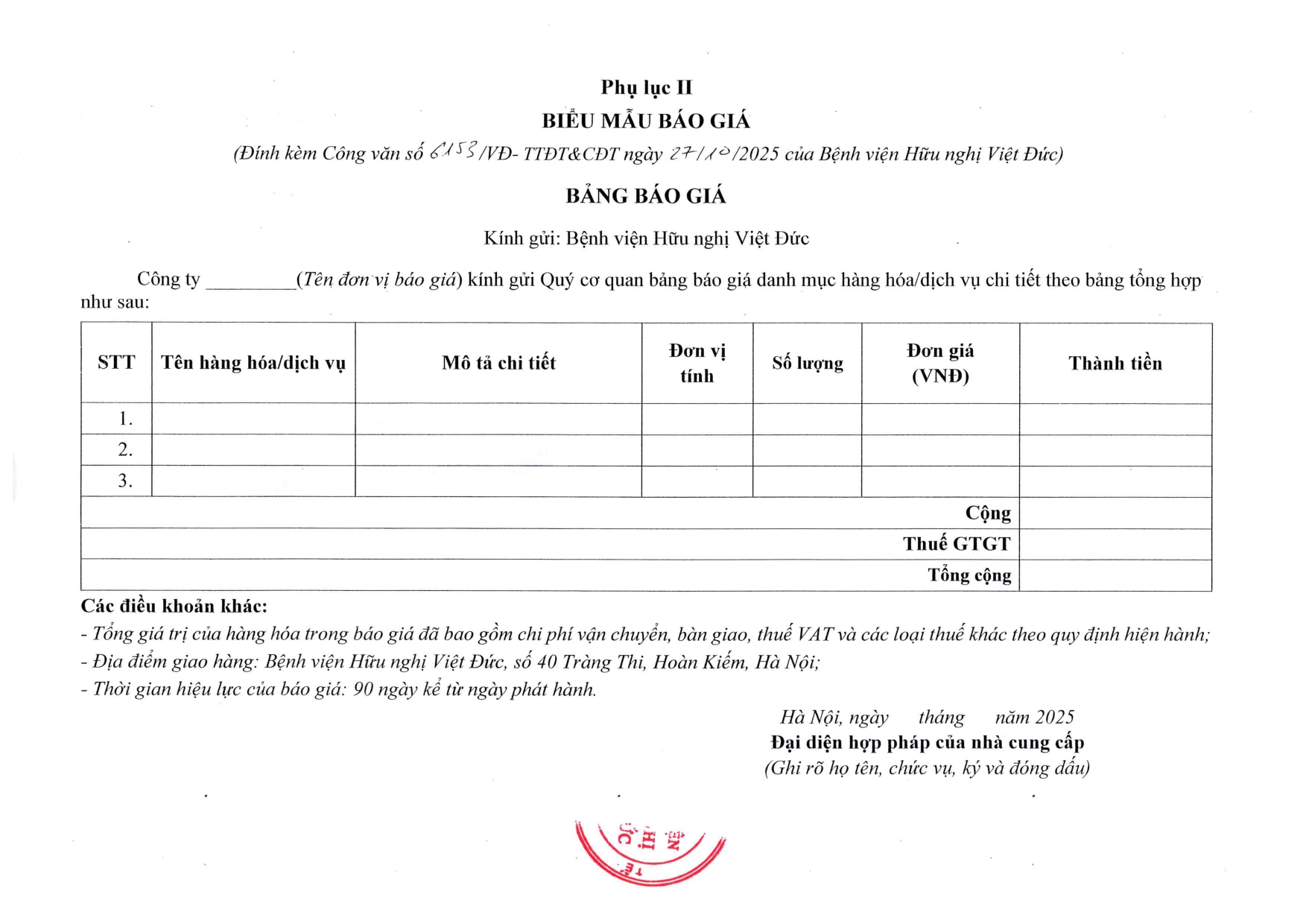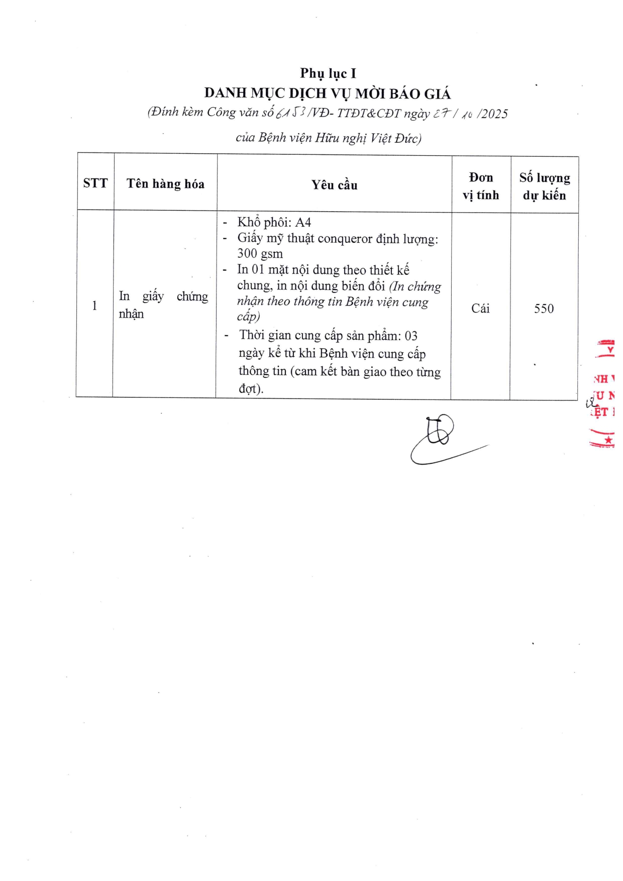 Hiện nay, Bệnh viện Hữu nghị Việt Đức có nhu cầu tiếp nhận báo giá để tham khảo, xây dựng giá, làm cơ sở tổ chức lựa chọn nhà cung cấp dịch vụ in giấy chứng nhận phục vụ Hội nghị khoa học quốc tế Bệnh viện Hữu nghị Việt Đức năm 2025 với nội dung cụ thể như sau: