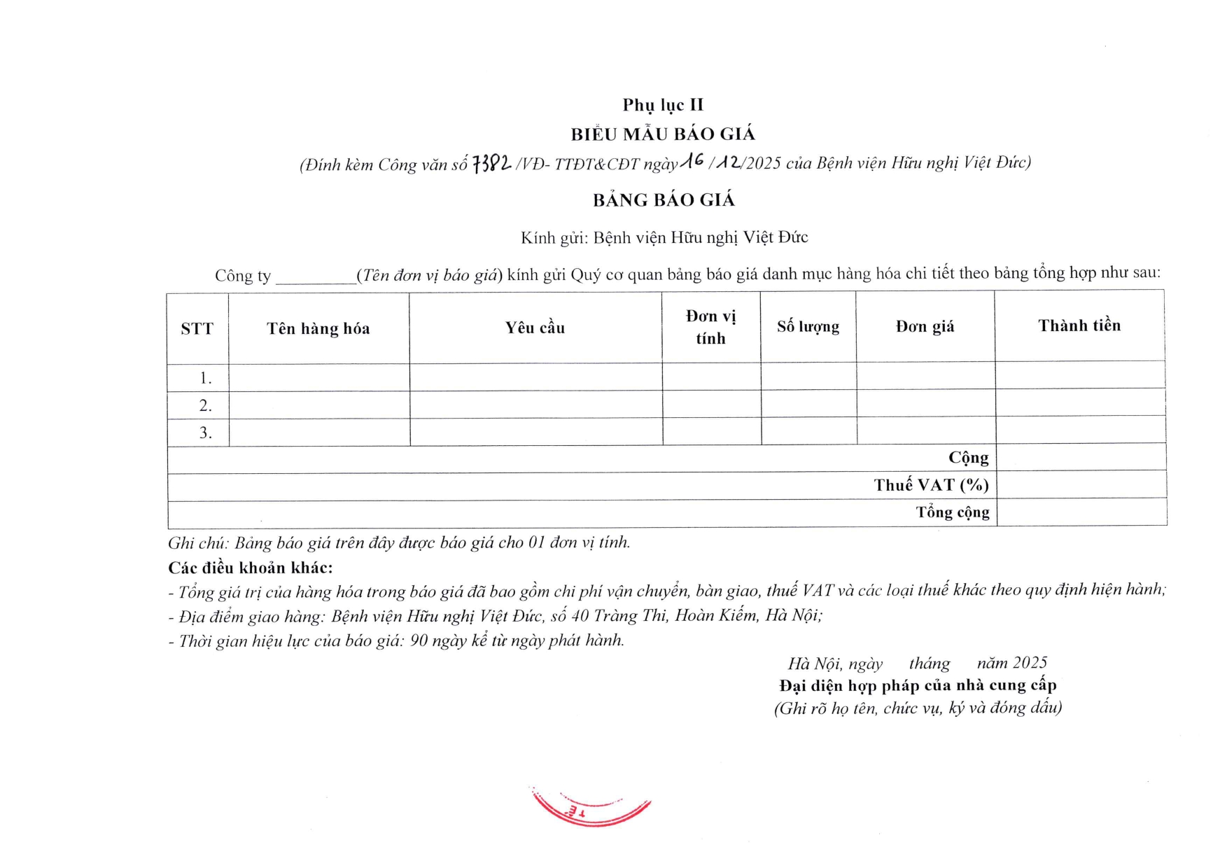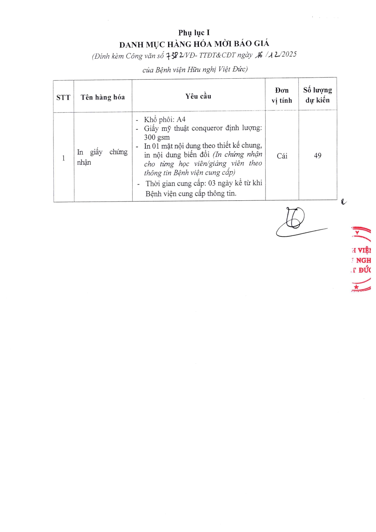 Bệnh viện Hữu nghị Việt Đức mời chào báo giá in giấy chứng nhận