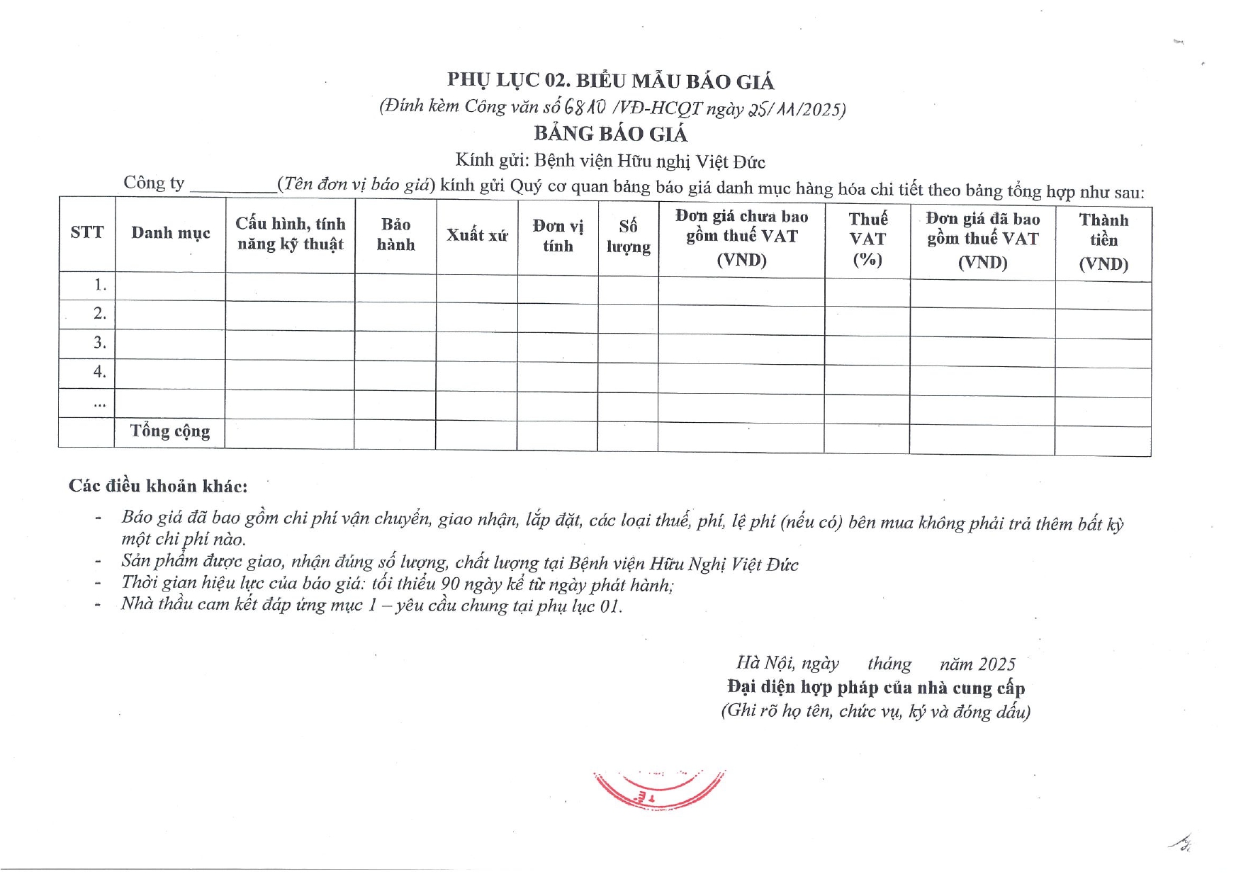 Hiện nay, Bệnh viện Hữu nghị Việt Đức có nhu cầu Lắp đặt biển cột hướng dẫn phương tiện tại cổng số 7 và số 8 của bệnh viện. Để có cơ sở tham khảo giá cung cấp và lắp đặt biển cột hướng dẫn phương tiện kính mời các đơn vị có khả năng cung cấp và lắp đặt mặt hàng trên tham gia khảo sát và báo giá với nội dung cụ thể như sau: