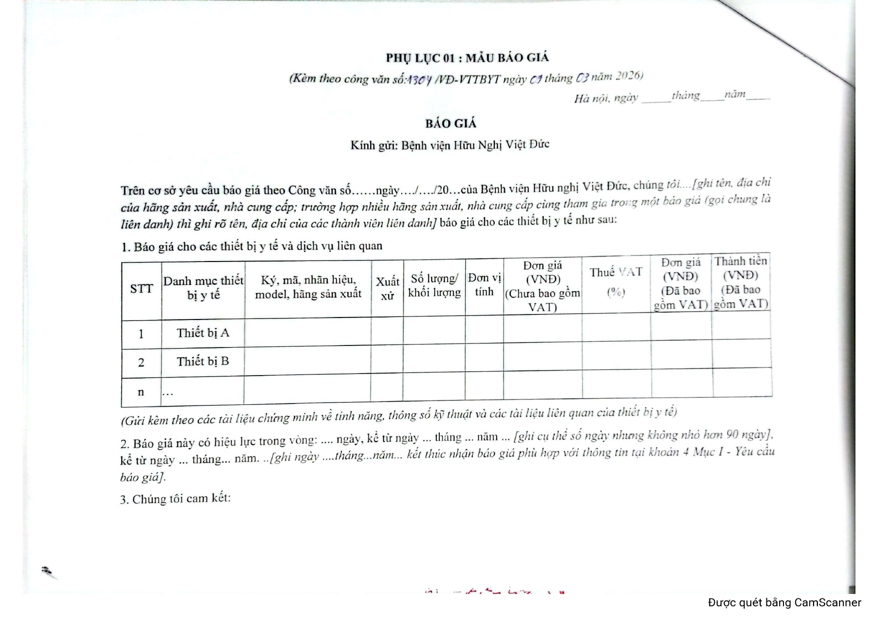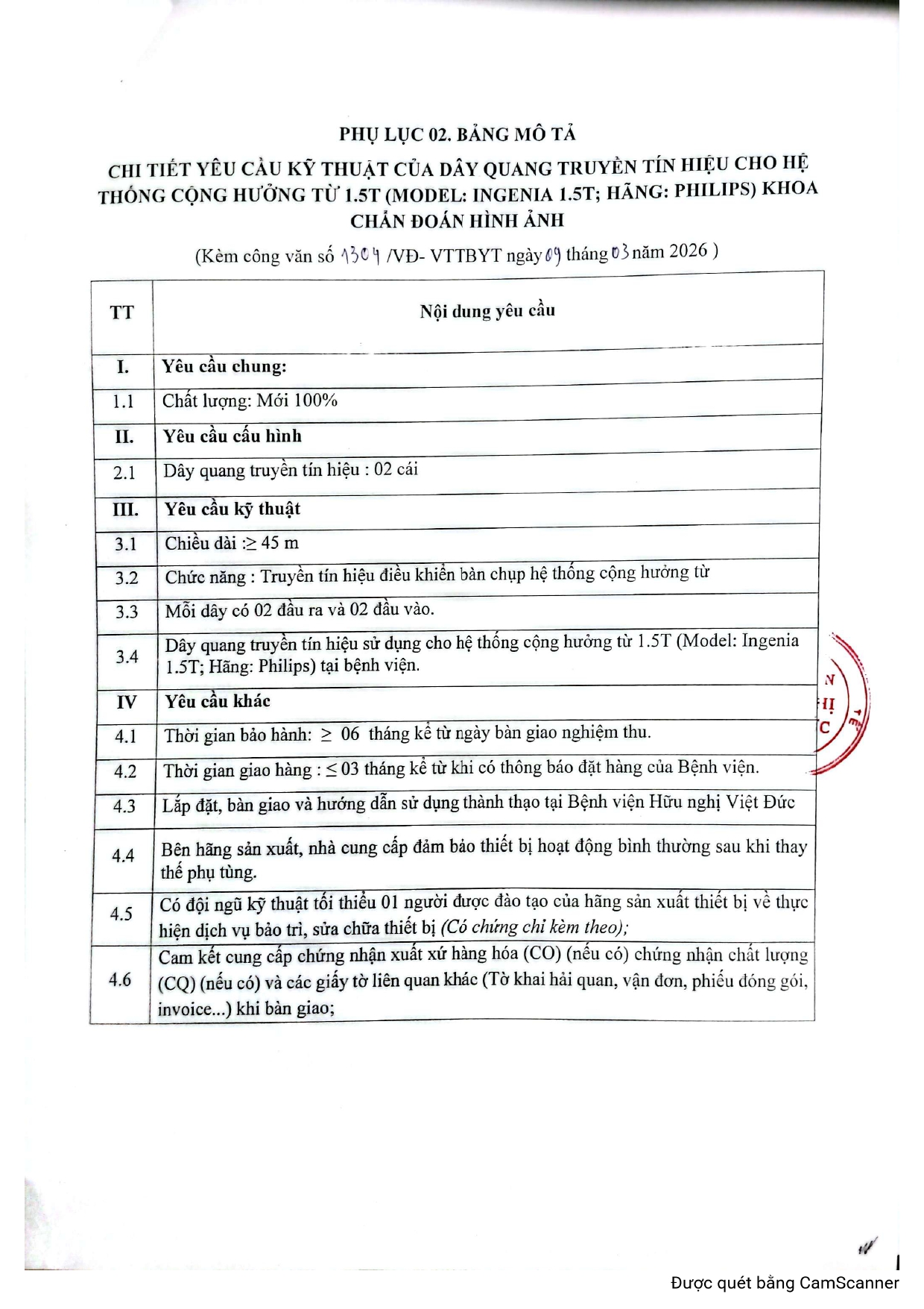 Bệnh viện Hữu nghị Việt Đức có nhu cầu tiếp nhận báo giá để tham khảo, xây dựng giá gói thầu, làm cơ sở tổ chức lựa chọn nhà thầu cho gói thầu mua sắm dây quang truyền tín hiệu cho hệ thống cộng hưởng từ 1.5T (Model: Ingenia 1.5T; Hãng: Philips) khoa Chẩn đoán hình ảnh của Bệnh viện Hữu Nghị Việt Đức với nội dung cụ thể như sau: