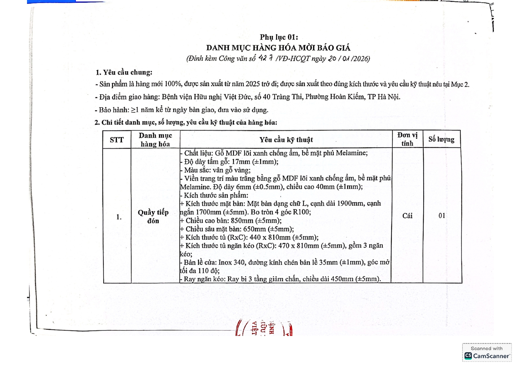 Hiện nay, Bệnh viện Hữu nghị Việt Đức có nhu cầu tiếp nhận báo giá để tham khảo, xây dựng giá gói thầu, làm cơ sở tổ chức lựa chọn nhà thầu cho gói thầu Mua sắm quầy tiếp đón cho khoa Gây mê I tại Bệnh viện với nội dung cụ thể như sau: