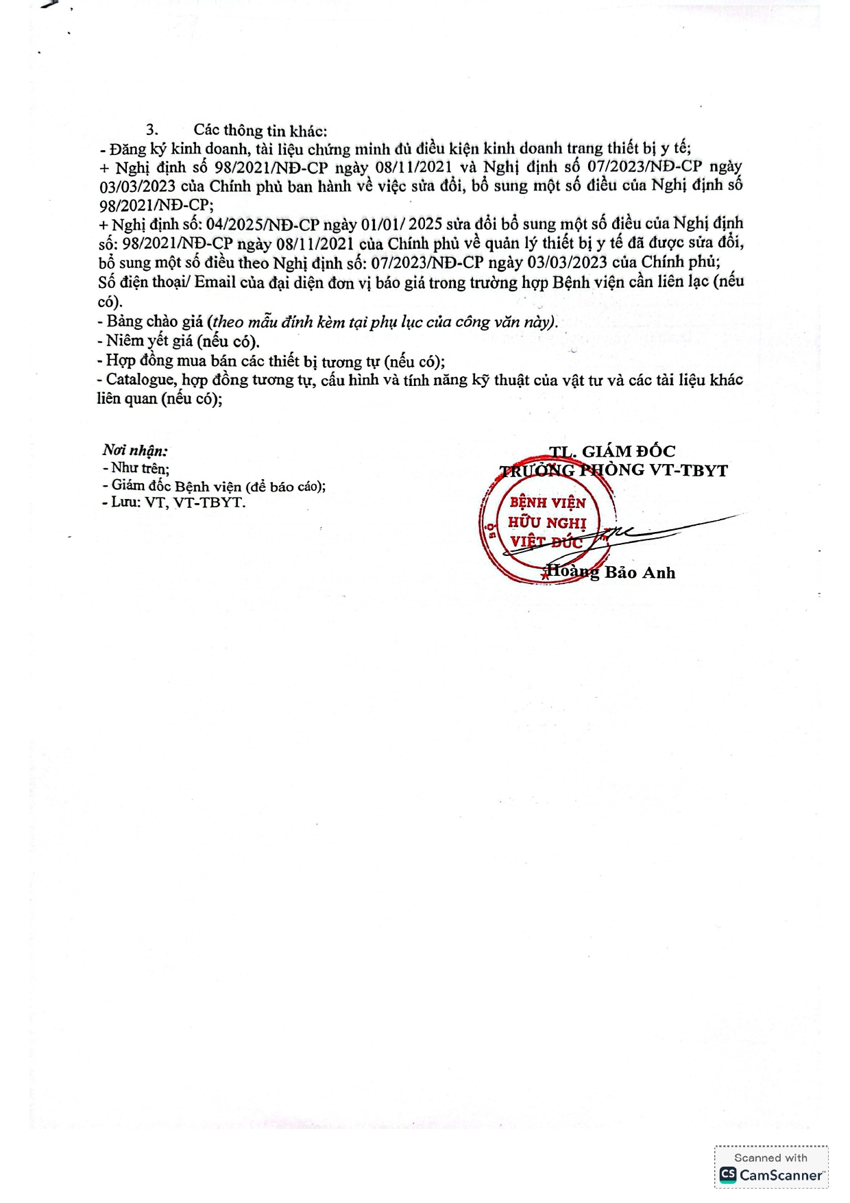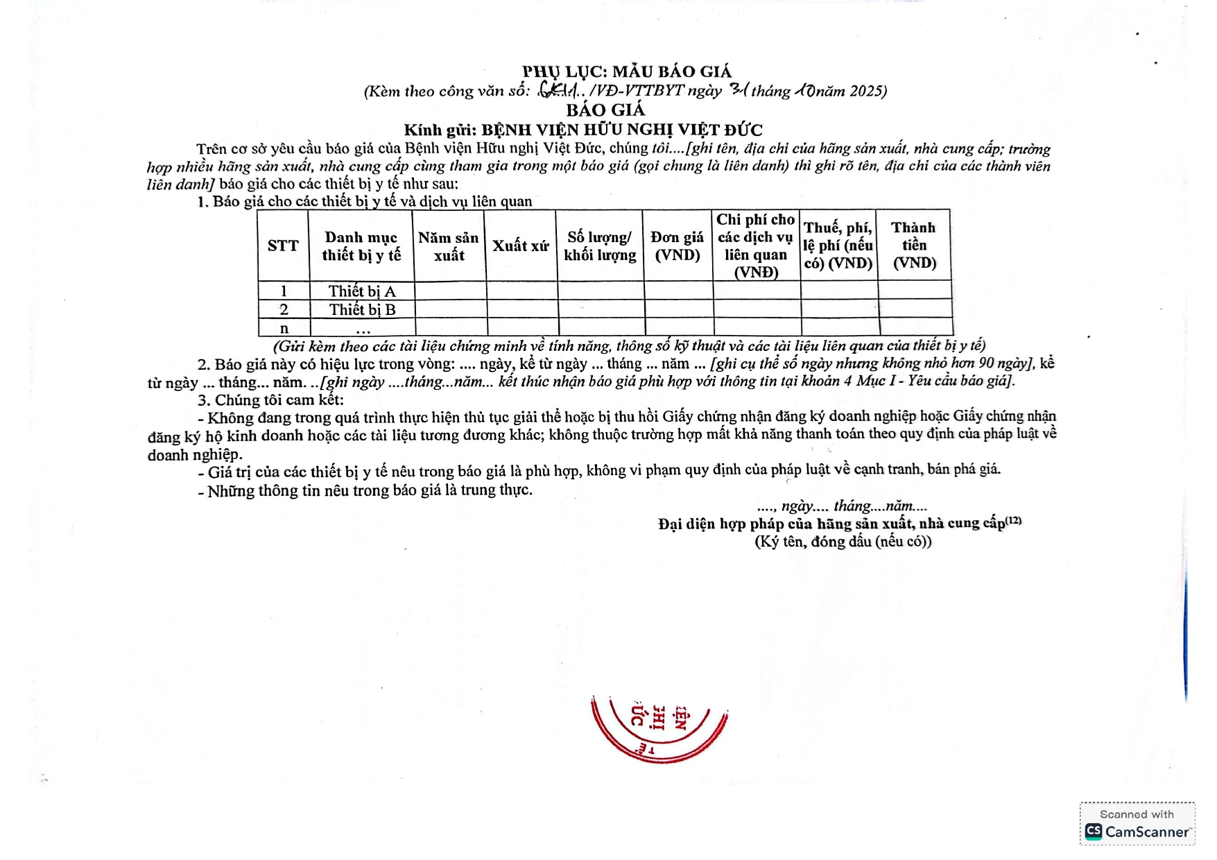 Bệnh viện Hữu nghị Việt Đức có nhu cầu tiếp nhận báo giá để tham khảo, xây dựng giá gói thầu, làm cơ sở tổ chức lựa chọn nhà thầu cho hồ sơ mua sắm linh kiện, phụ kiện, vật tư thay thế sử dụng cho trang thiết bị y tế với nội dung cụ thể như sau: