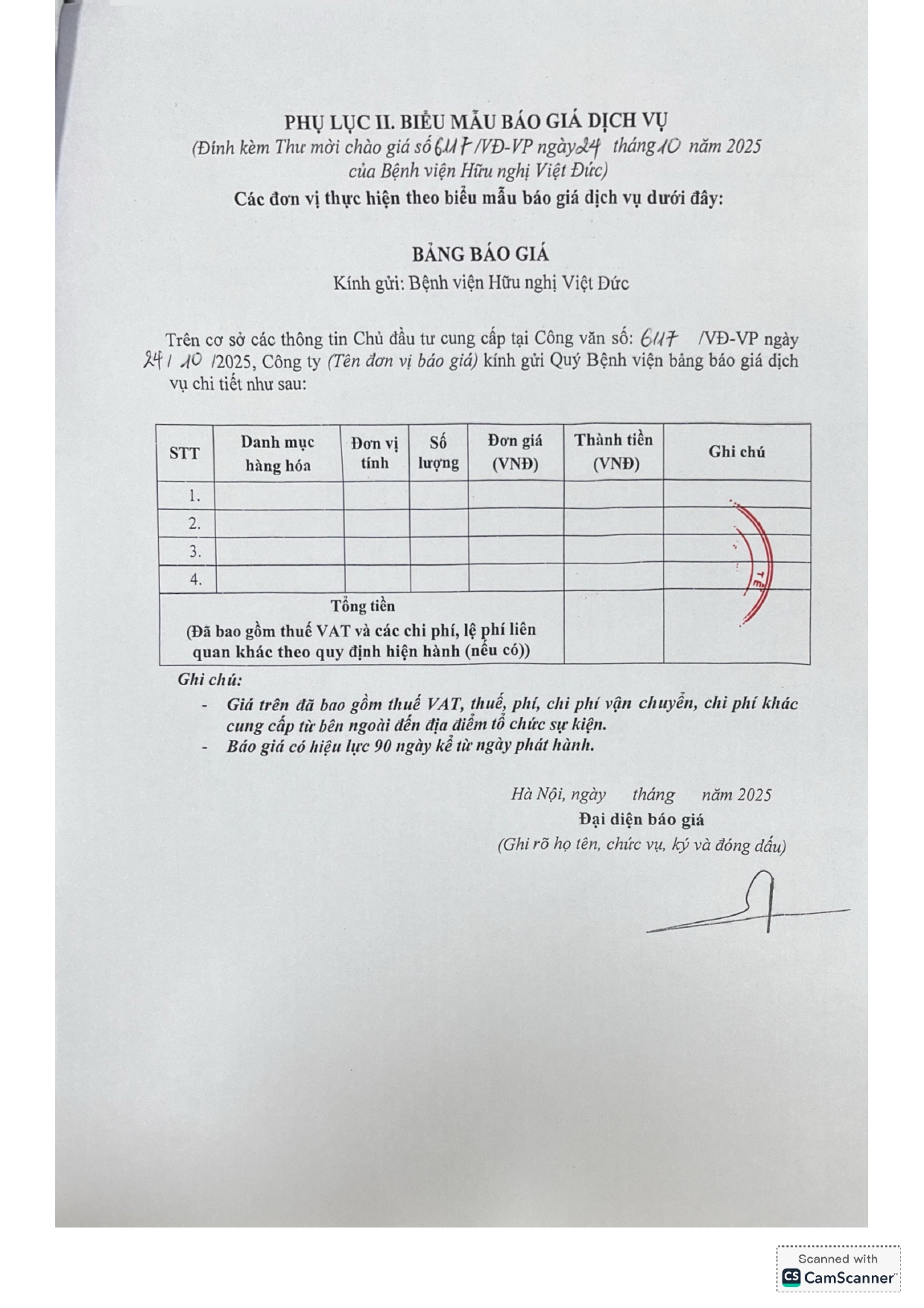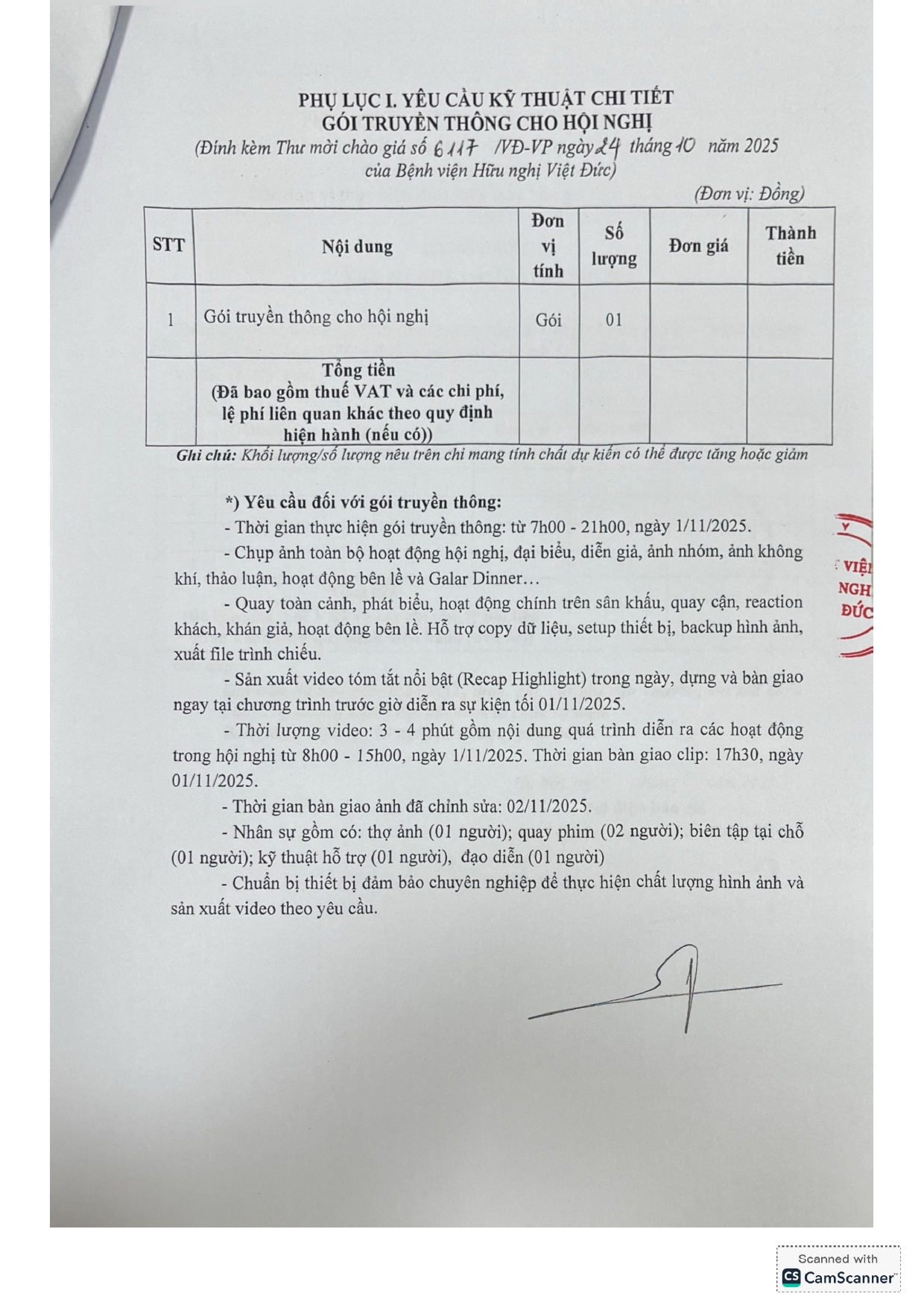 Hiện nay, Bệnh viện Hữu nghị Việt Đức có nhu cầu tiếp nhận báo giá để phục vụ tổ chức “Hội nghị khoa học quốc tế Bệnh viện Hữu nghị Việt Đức năm 2025” ngày 31/10/2025 tại Bệnh viện Hữu nghị Việt Đức và ngày 01/11/2025 tại khách sạn tại Hà Nội, với nội dung cụ thể như sau: