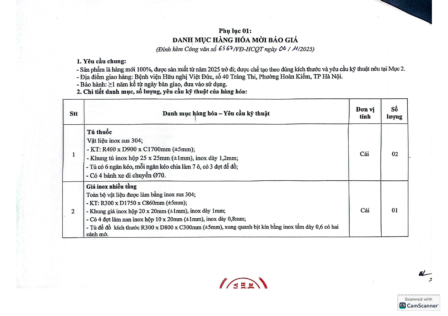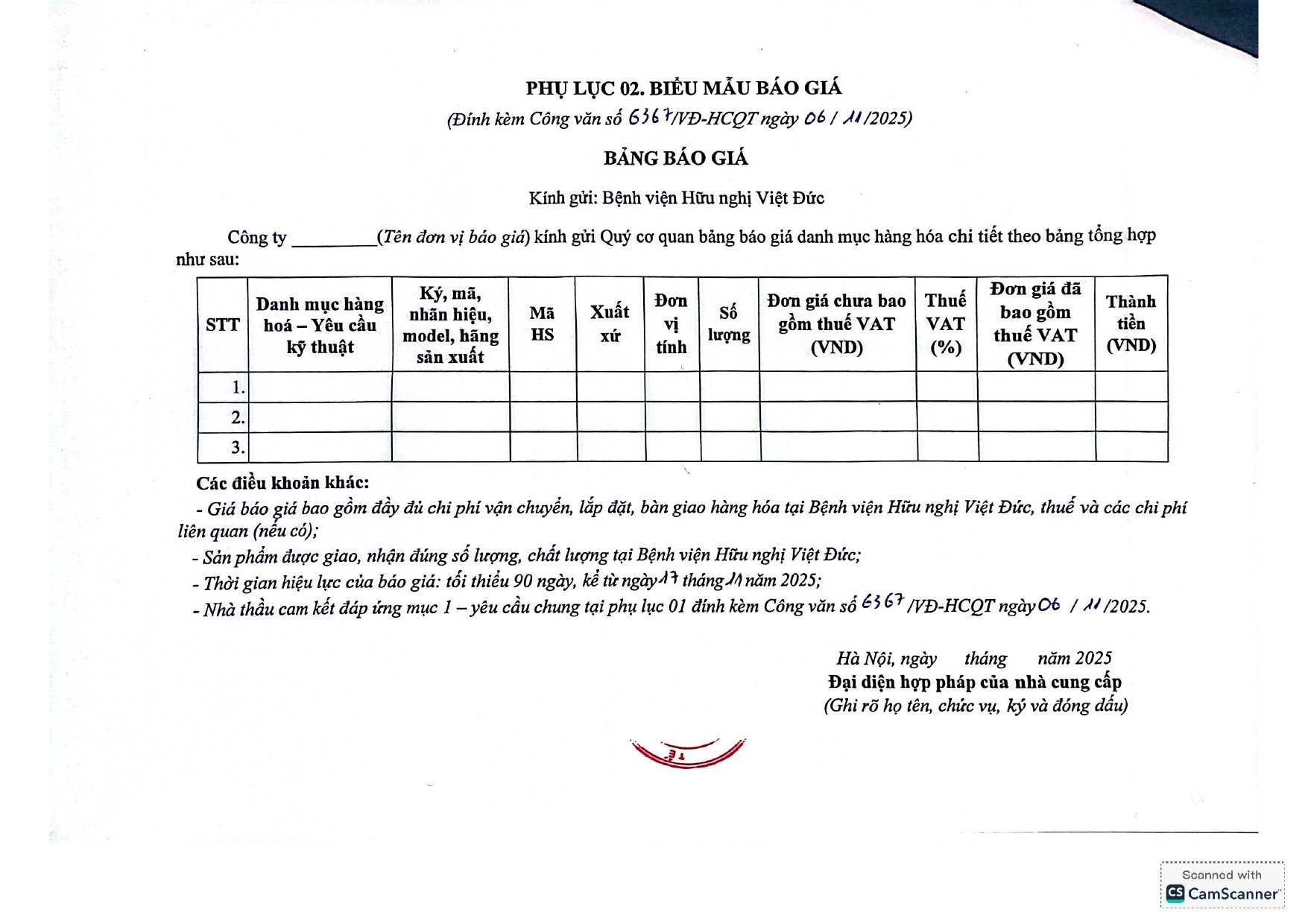 Hiện nay, Bệnh viện Hữu nghị Việt Đức có nhu cầu mua sắm trang thiết bị phục vụ công tác chuyên môn cho các khoa, để có cơ sở tham khảo giá các hàng hóa trên thị trường, Bệnh viện Hữu nghị Việt Đức kính mời các đơn vị có khả năng cung cấp, báo giá hàng hóa với nội dung cụ thể như sau:
