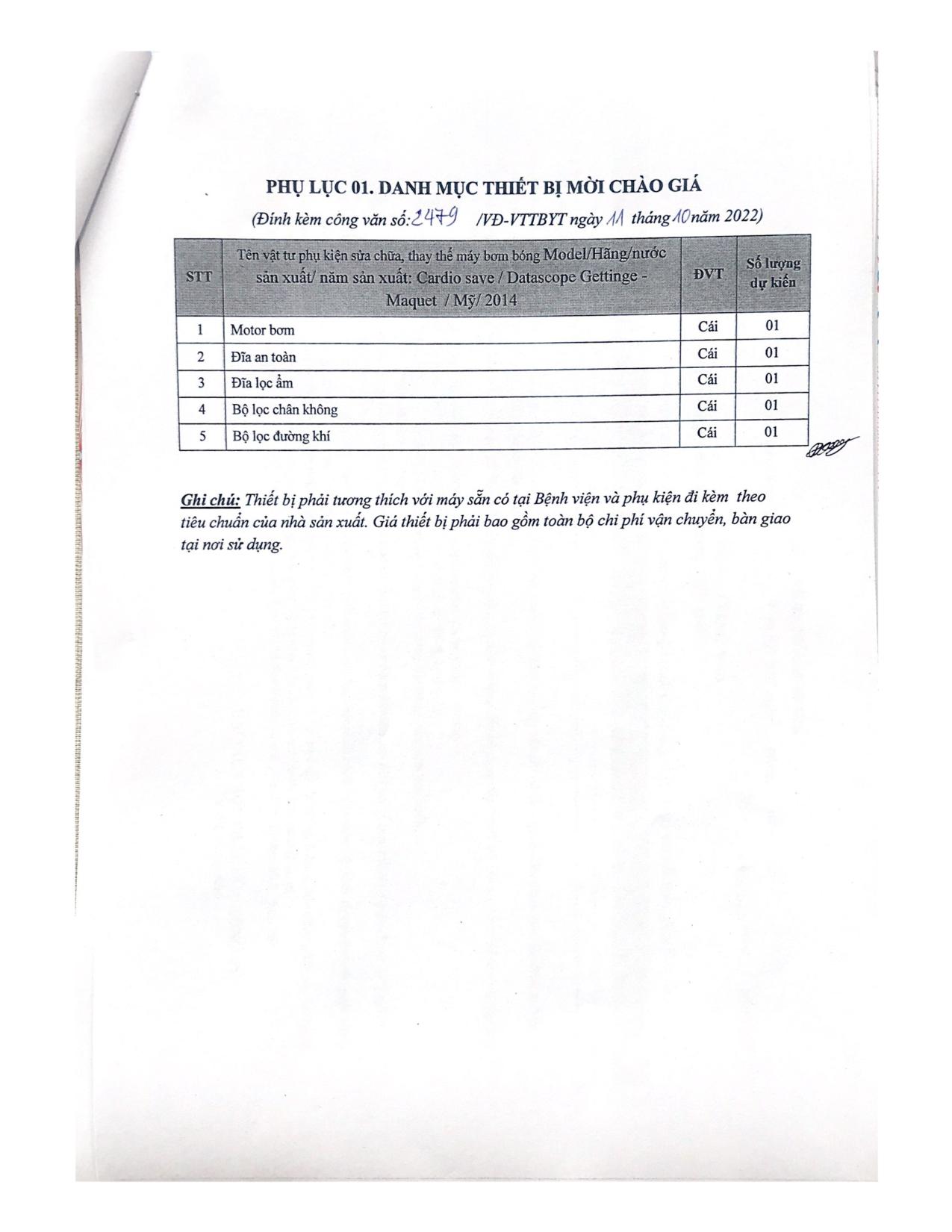 Hiện nay, Bệnh viện Hữu nghị Việt Đức đang có nhu cầu mua vật tư phục vụ sử chữa máy bơm bóng đối xung Model/Hãng/nước sản xuất/ năm sản xuất: Cardio save / Datascope Gettinge – Maquet / Mỹ/ 2014 cụ thể như sau: