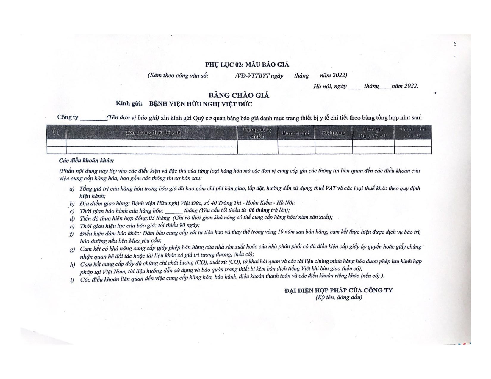 Bệnh viện Hữu nghị Việt Đức mời chào báo giá trang thiết bị y tế