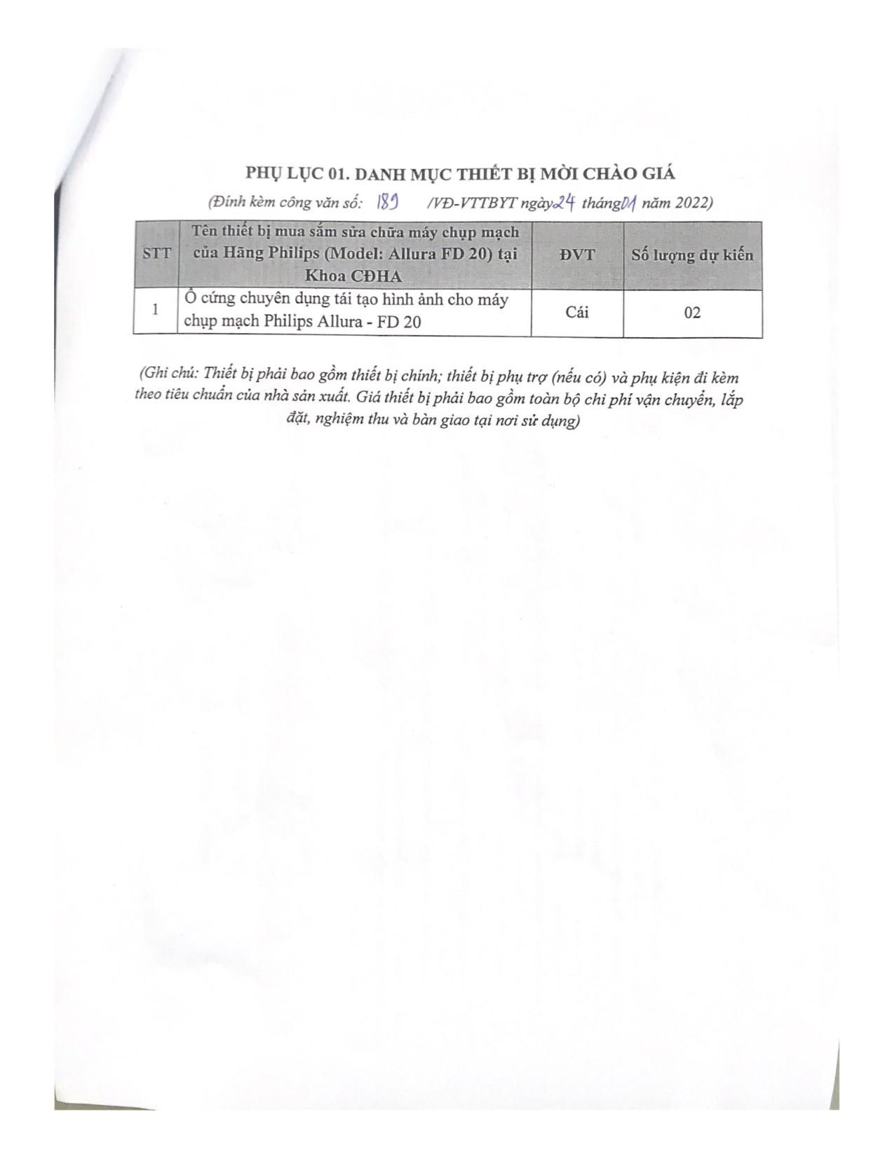 Hiện nay, Bệnh Viện Hữu Nghị Việt Đức đang có nhu cầu mua sắm 01 ổ cứng chuyên dụng dùng cho máy chụp mạch của Hãng Philips (Model: Allura FD 20) tại Khoa CĐHA của Bệnh viện, để có thêm cơ sở tham khảo giá ổ cứng chuyên dụng dùng cho máy chụp mạch phục vụ sửa chữa máy. Bệnh Viện Hữu Nghị Việt Đức kính mời các đơn vị, doanh nghiệp kinh doanh có khả năng cung cấp chào giá ổ cứng chuyên dụng dùng cho máy chụp mạch (theo danh mục trang thiết bị theo phụ lục đính kèm).