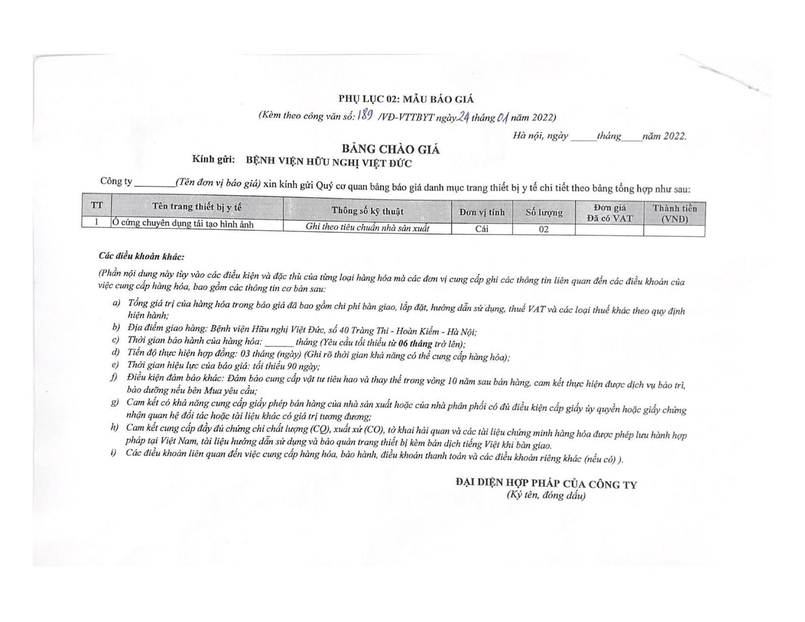 Bệnh viện Hữu nghị Việt Đức mời chào báo giá trang thiết bị y tế