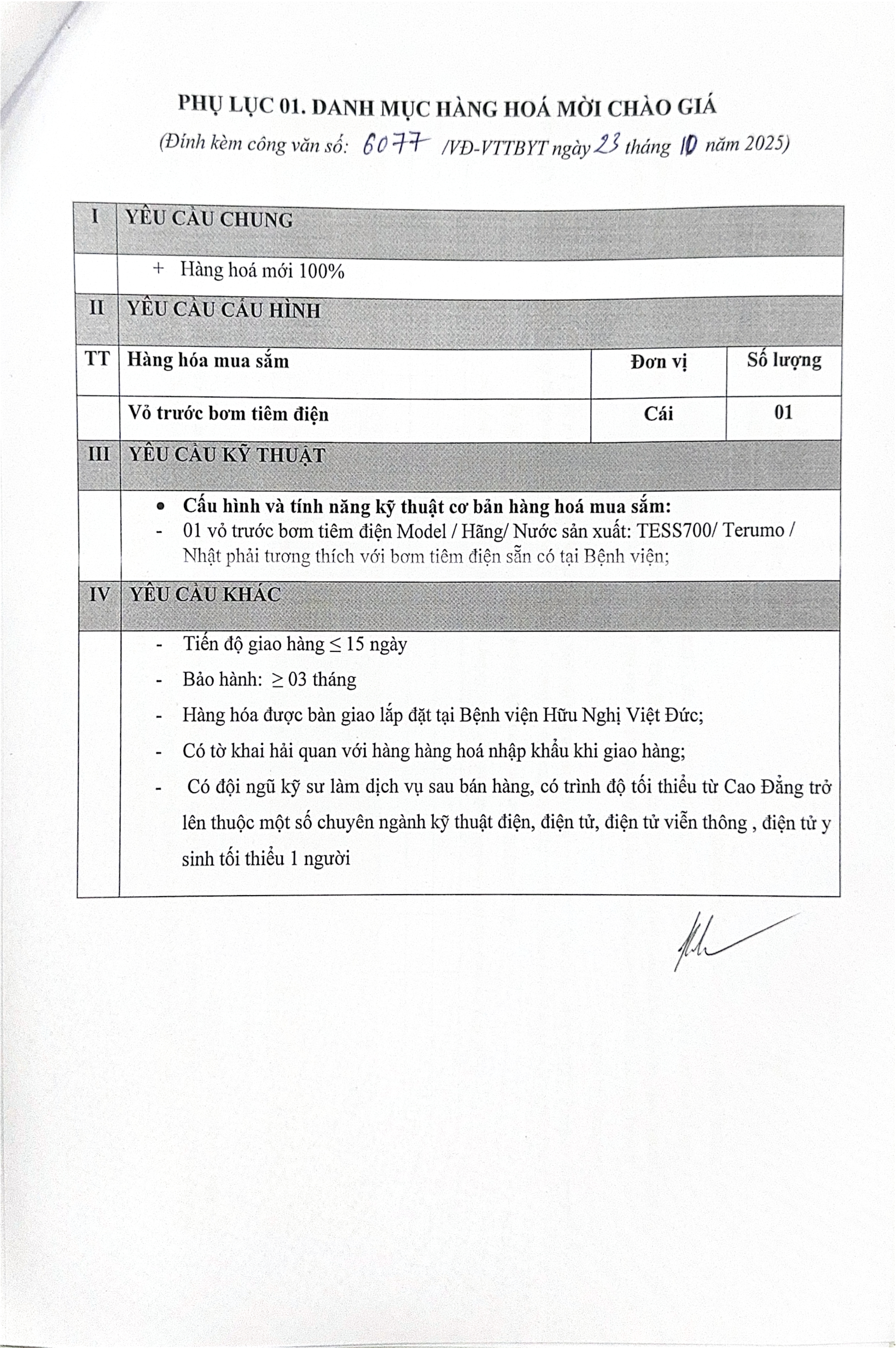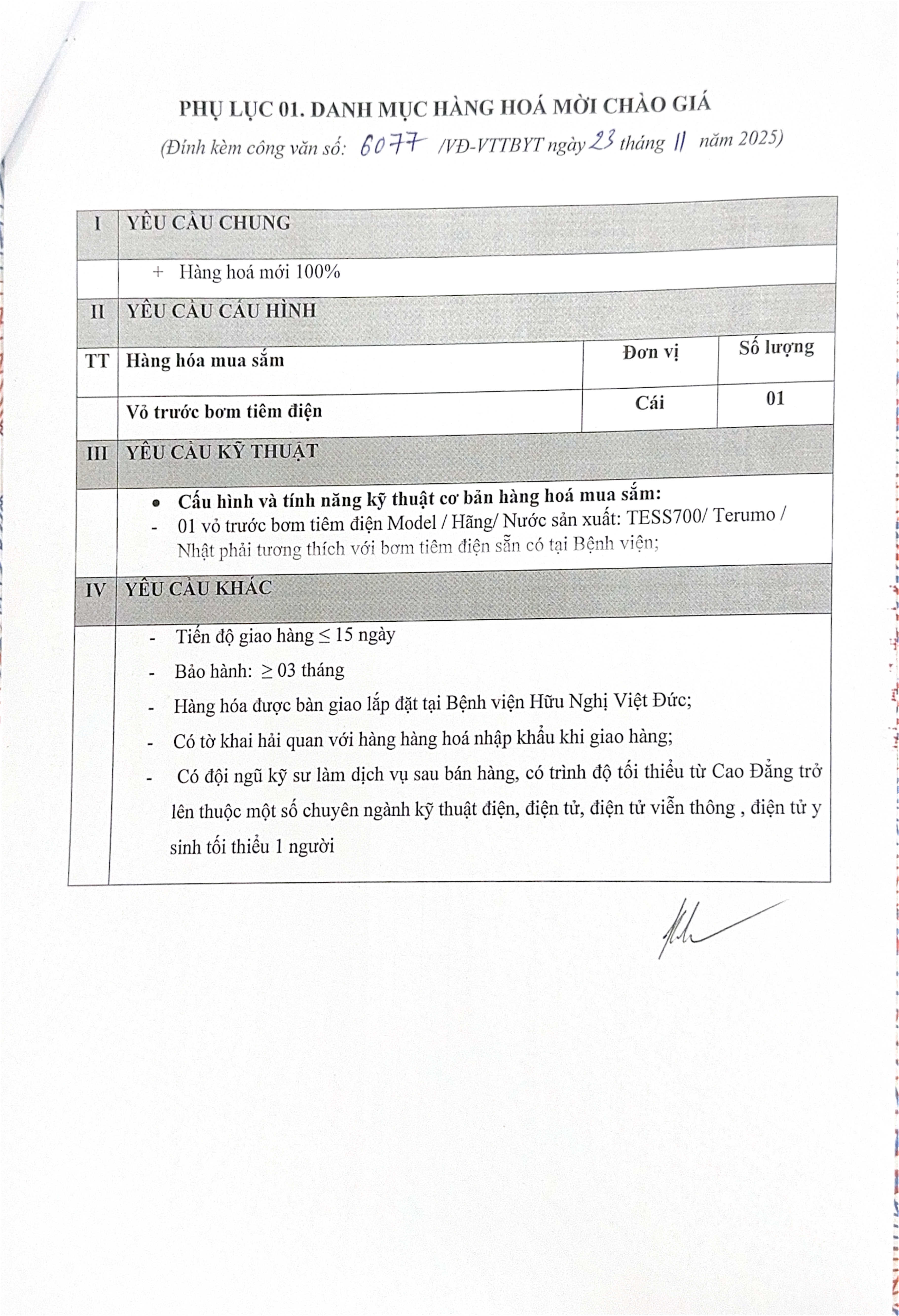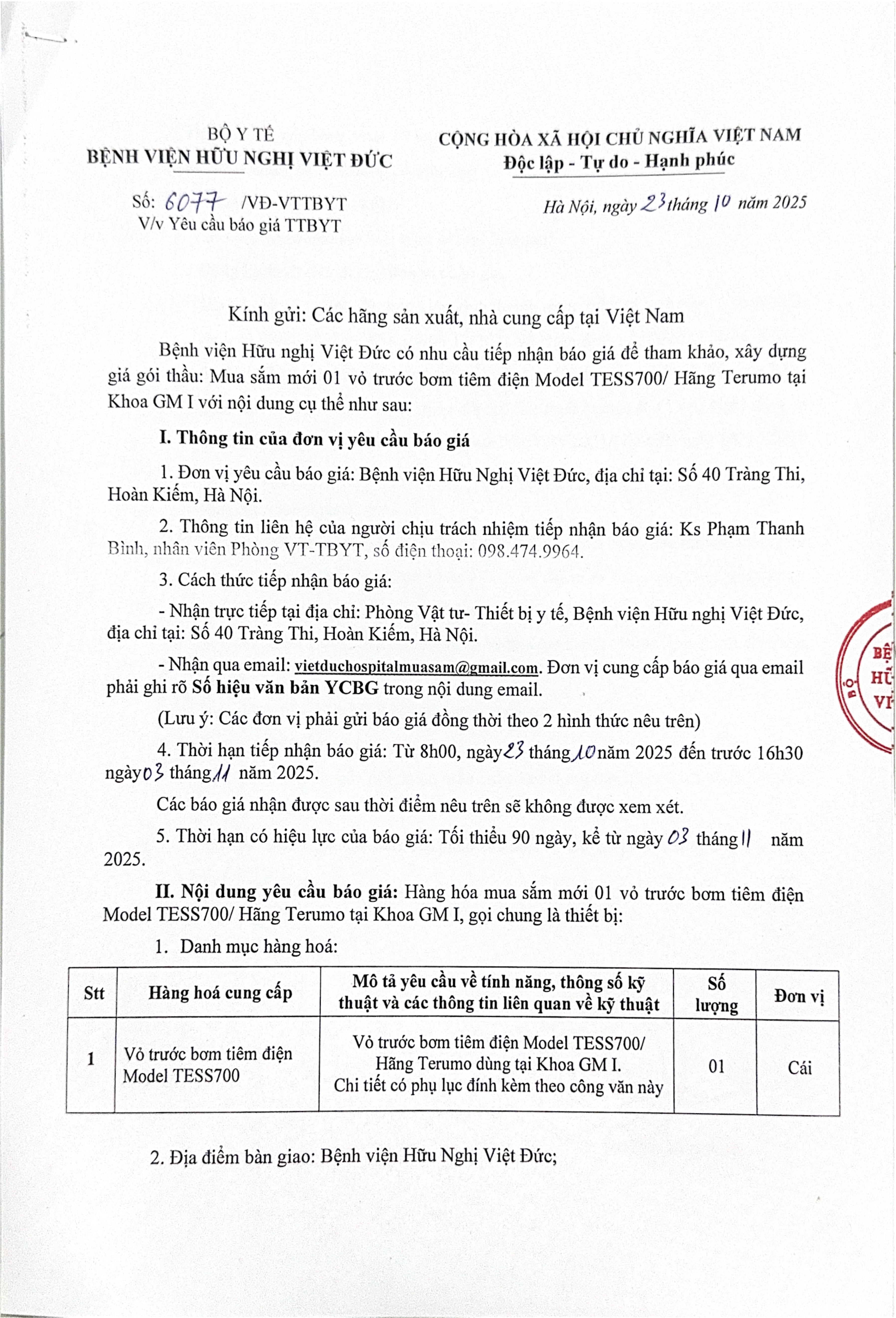 Bệnh viện Hữu nghị Việt Đức có nhu cầu tiếp nhận báo giá để tham khảo, xây dựng giá gói thầu: Mua sắm mới 01 vỏ trước bơm tiêm điện Model TESS700/ Hãng Terumo tại Khoa GM I với nội dung cụ thể như sau: