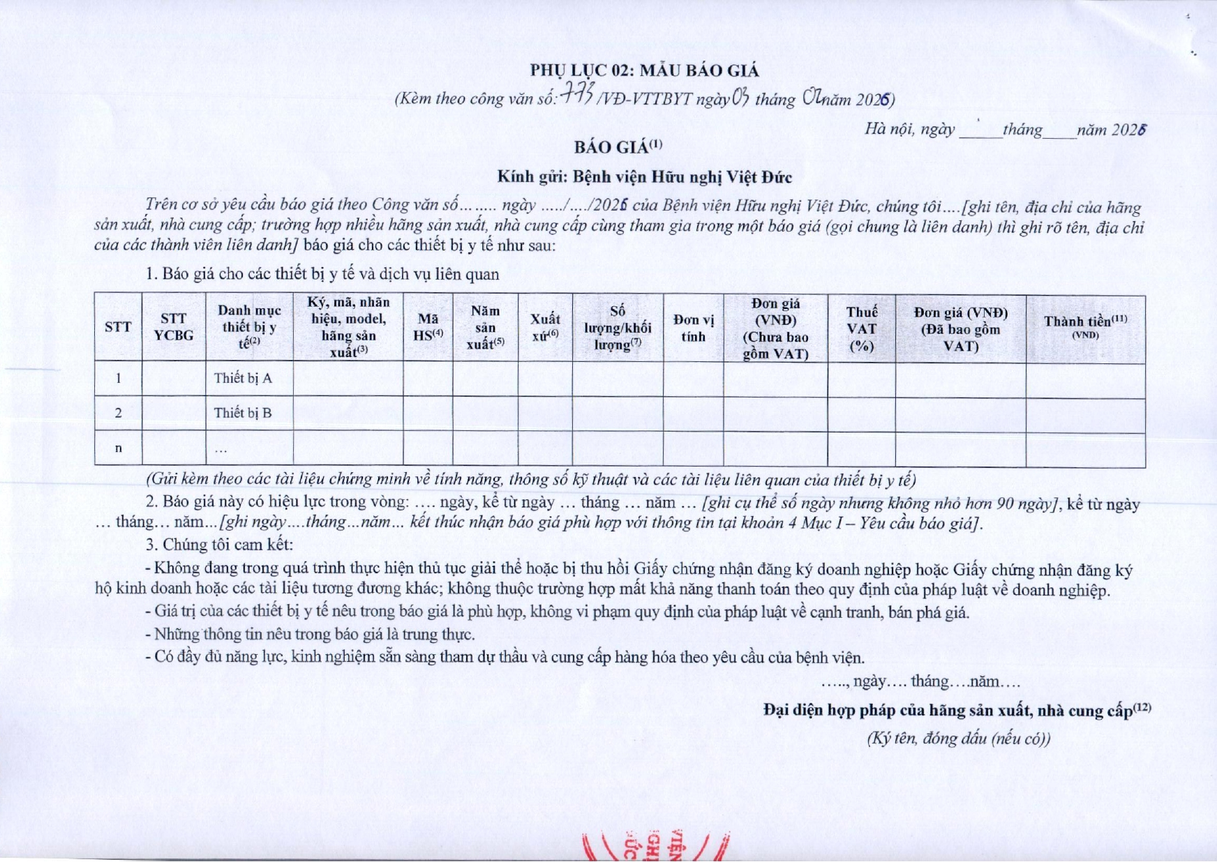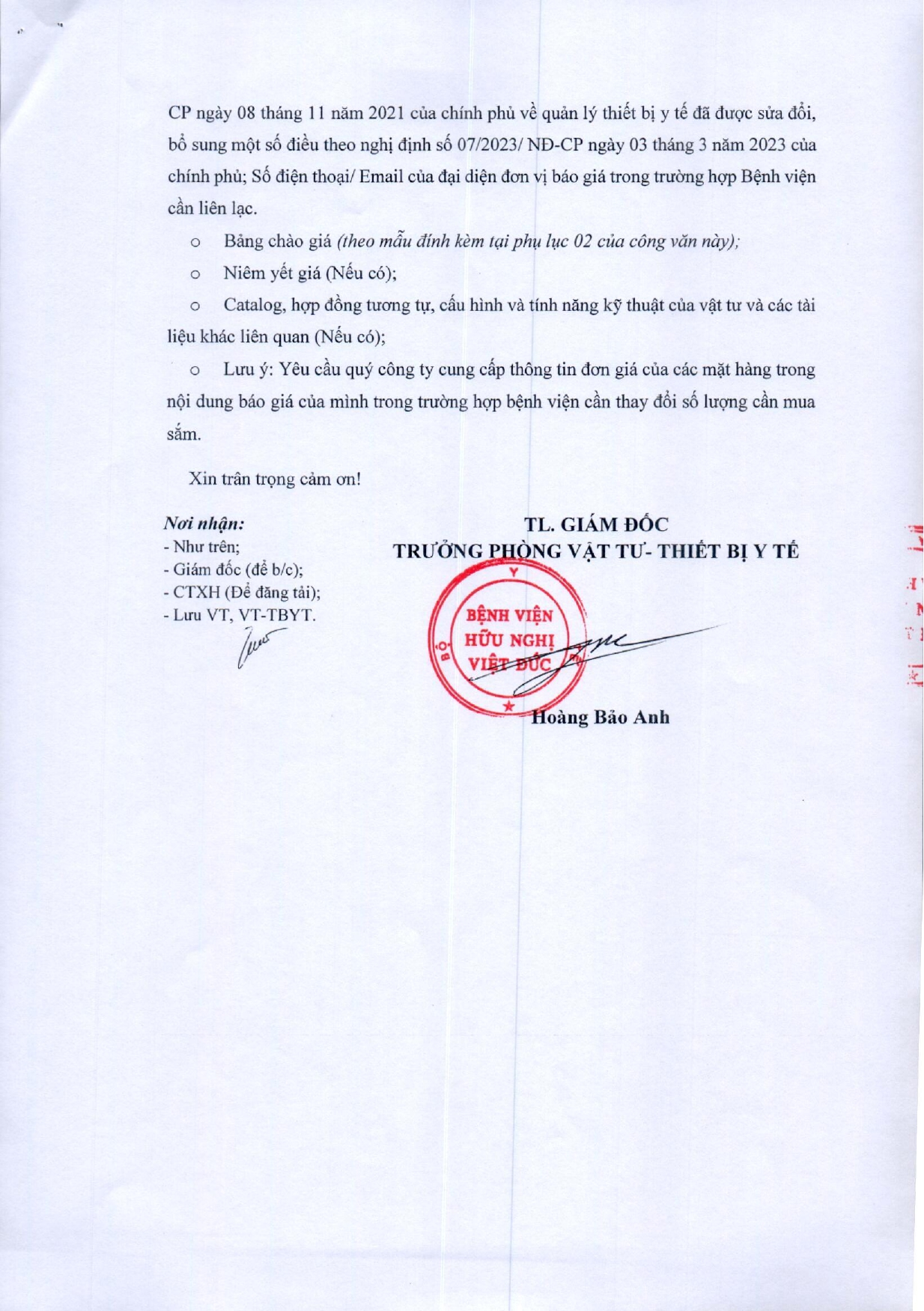 Bệnh viện Hữu nghị Việt Đức mời chào báo giá vật tư y tế