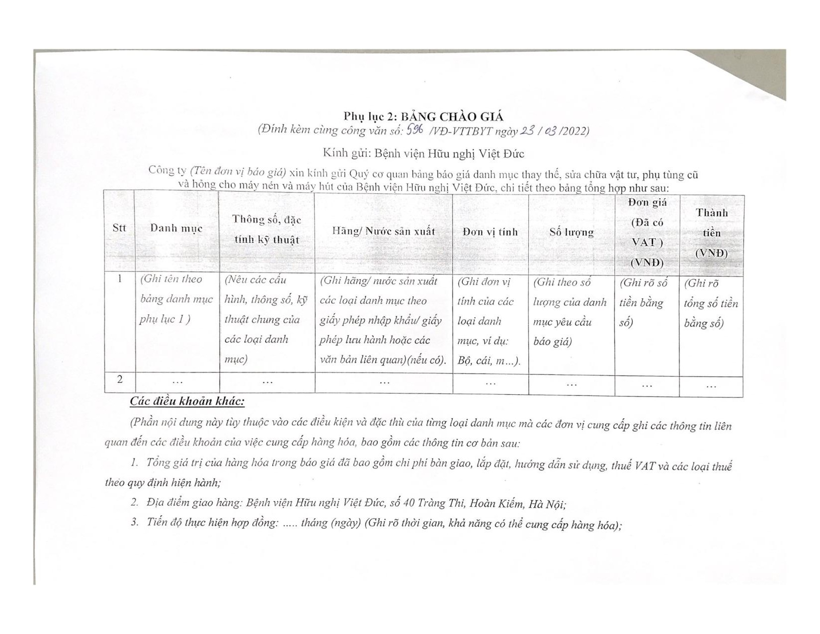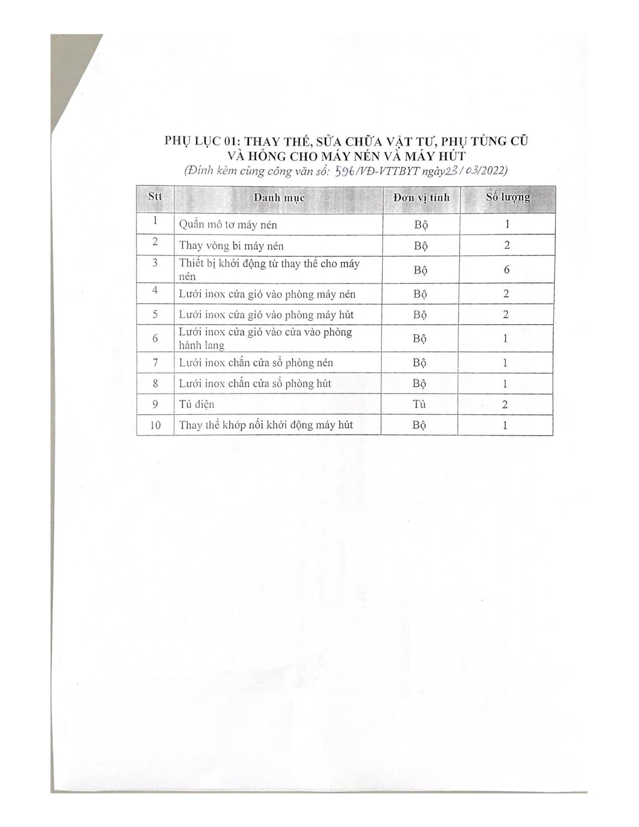 phụ tùng cũ và hỏng cho máy nén và máy hút để phục vụ công tác chuyên môn của Bệnh viện. Để có cơ sở xây dựng giá dự toán, Bệnh viện Hữu nghị Việt Đức kính mời các đơn vị, doanh nghiệp kinh doanh có khả năng thay thế, sửa chữa vật tư, phụ tùng cũ và hỏng cho máy nén và máy hút chào giá theo Phụ lục 1 đính kèm.