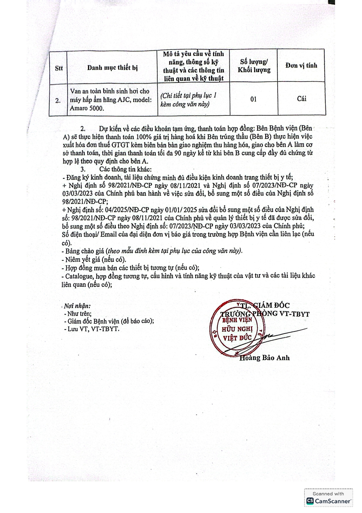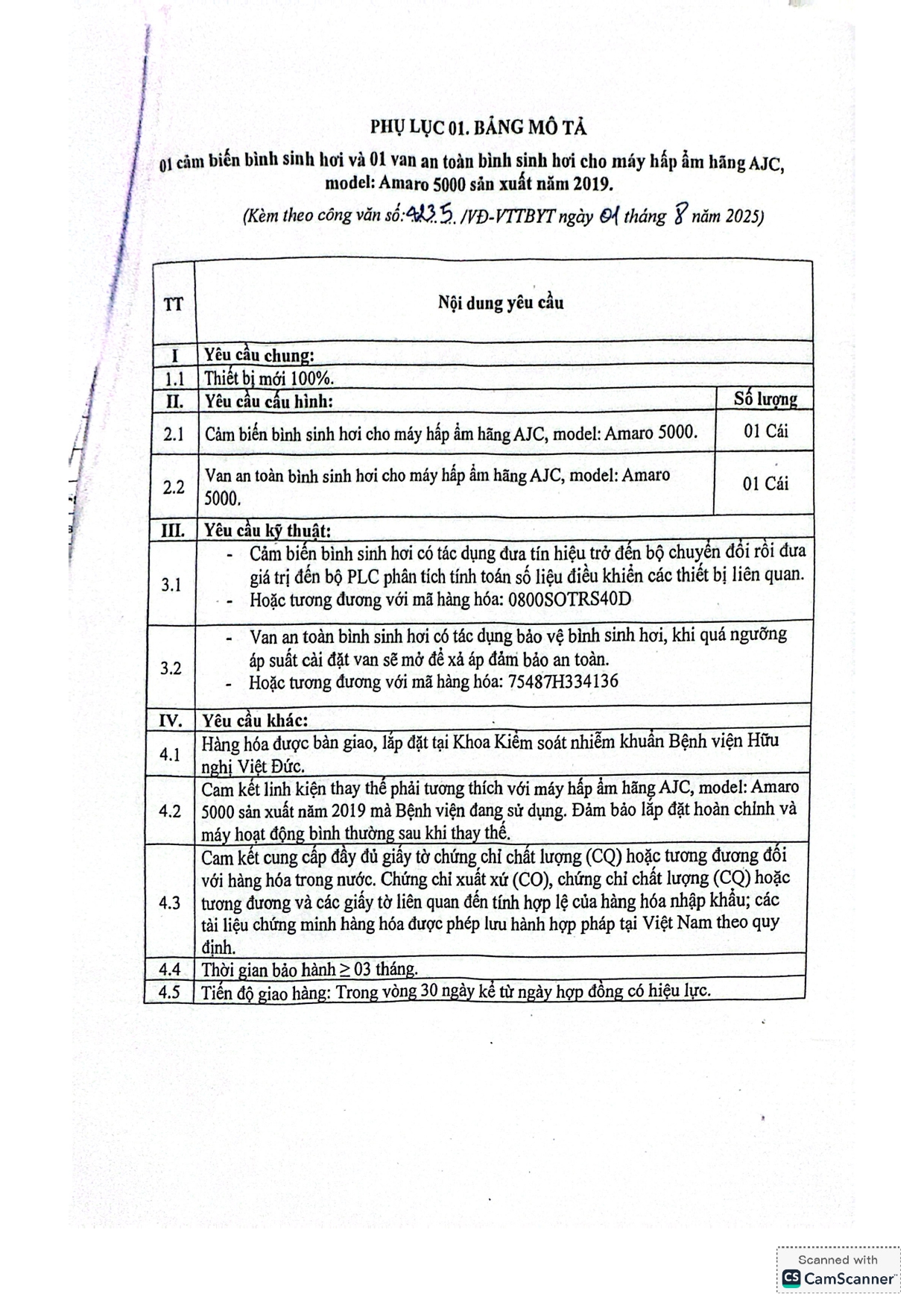 Bệnh viện Hữu nghị Việt Đức mời chào giá 01 cảm biến bình sinh hơi và 01 van an toàn bình sinh hơi cho máy hấp ẩm hãng AJC, model: Amaro 5000 sản xuất năm 2019