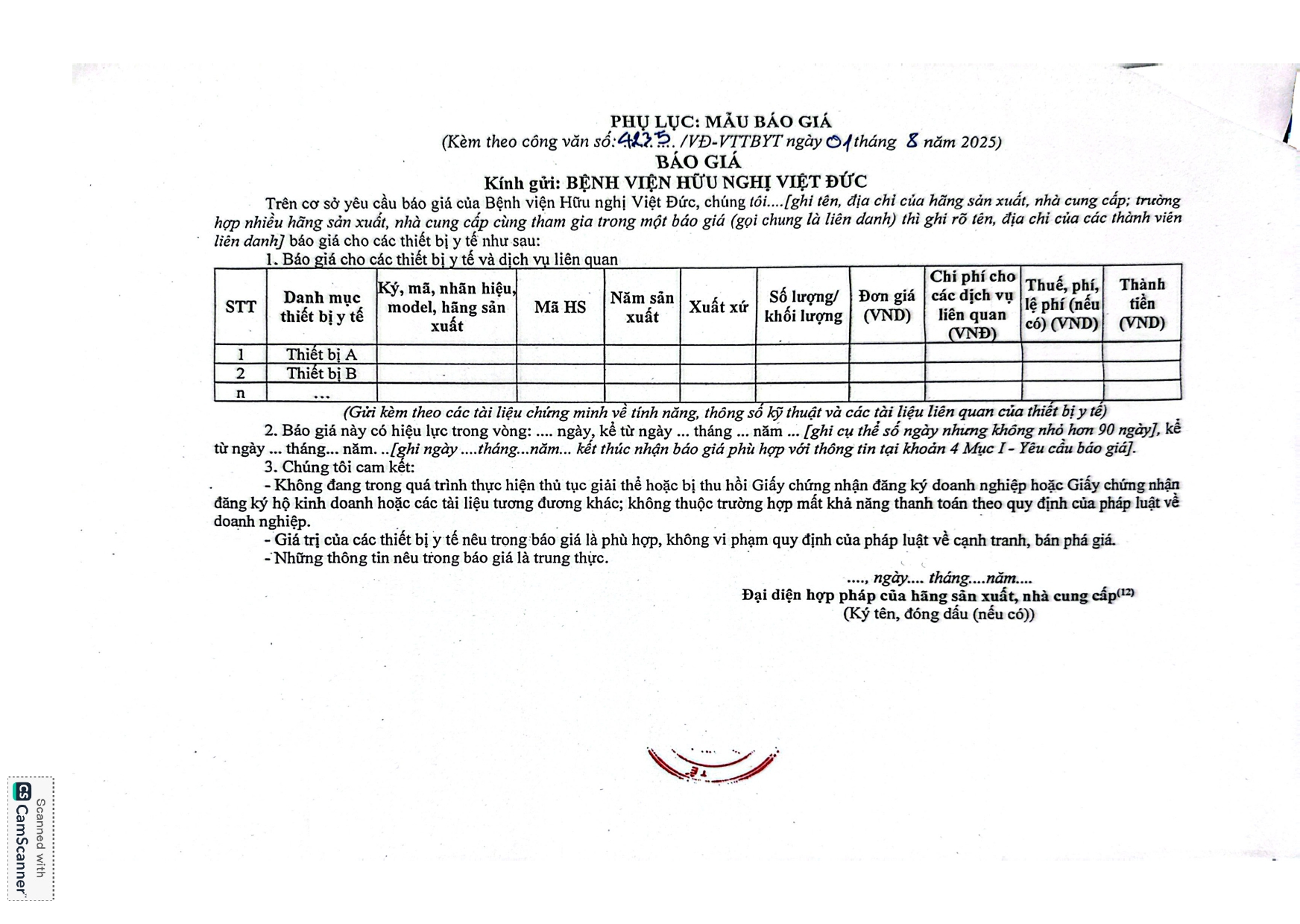 Bệnh viện Hữu nghị Việt Đức có nhu cầu tiếp nhận báo giá để tham khảo, xây dựng giá gói thầu, làm cơ sở tổ chức lựa chọn nhà thầu cho hồ sơ mua sắm linh kiện, phụ kiện, vật tư thay thế sử dụng cho trang thiết bị y tế với nội dung cụ thể như sau: