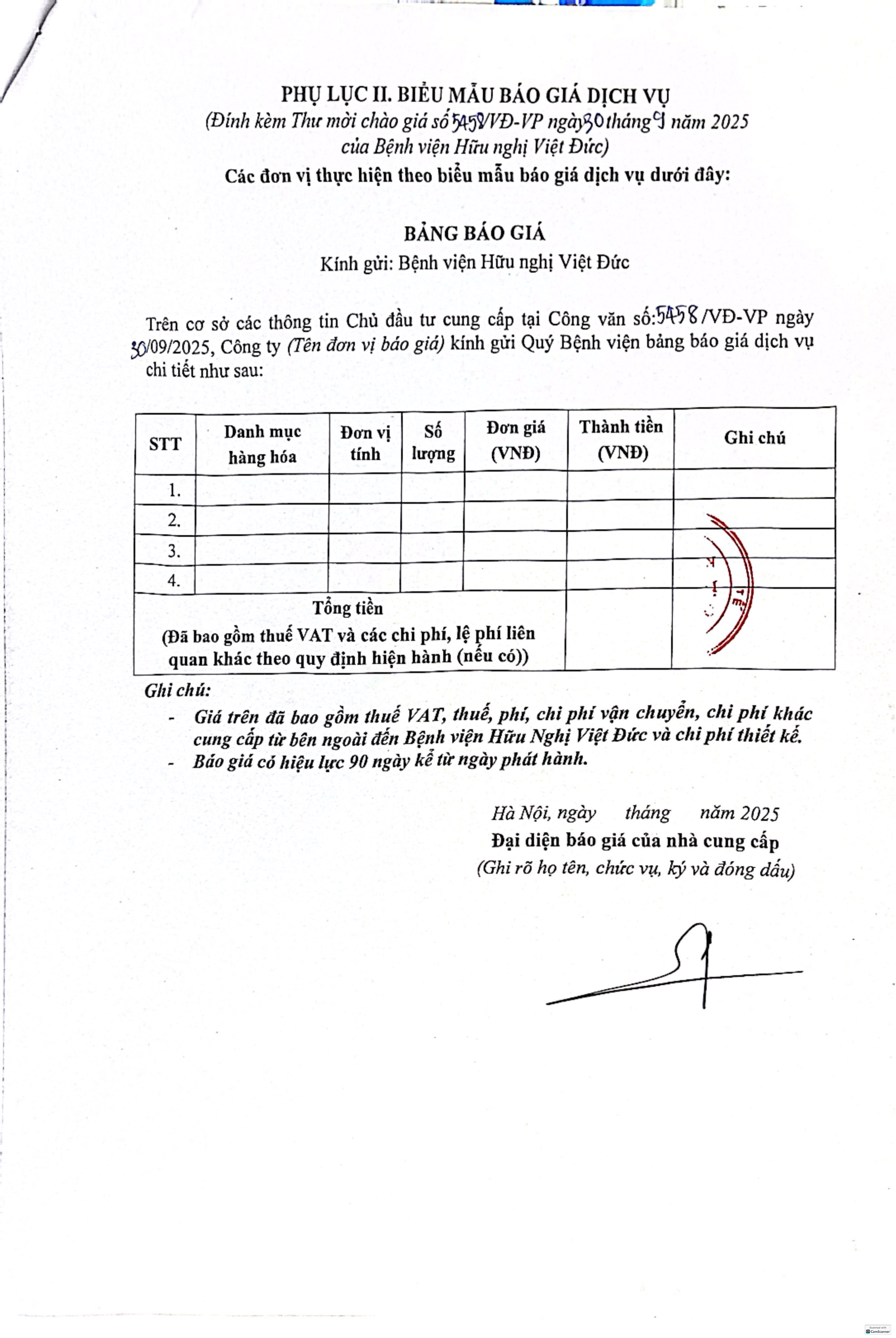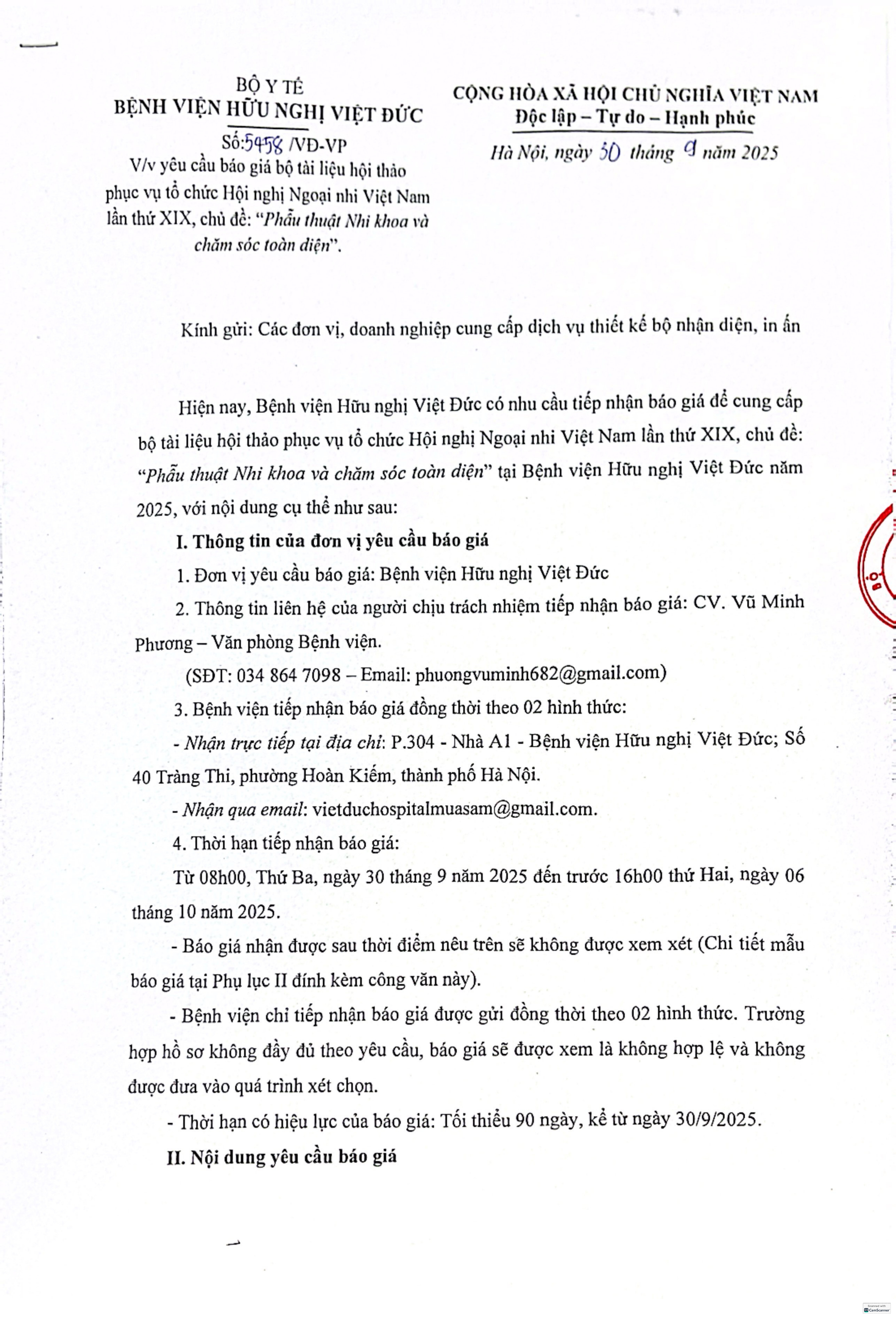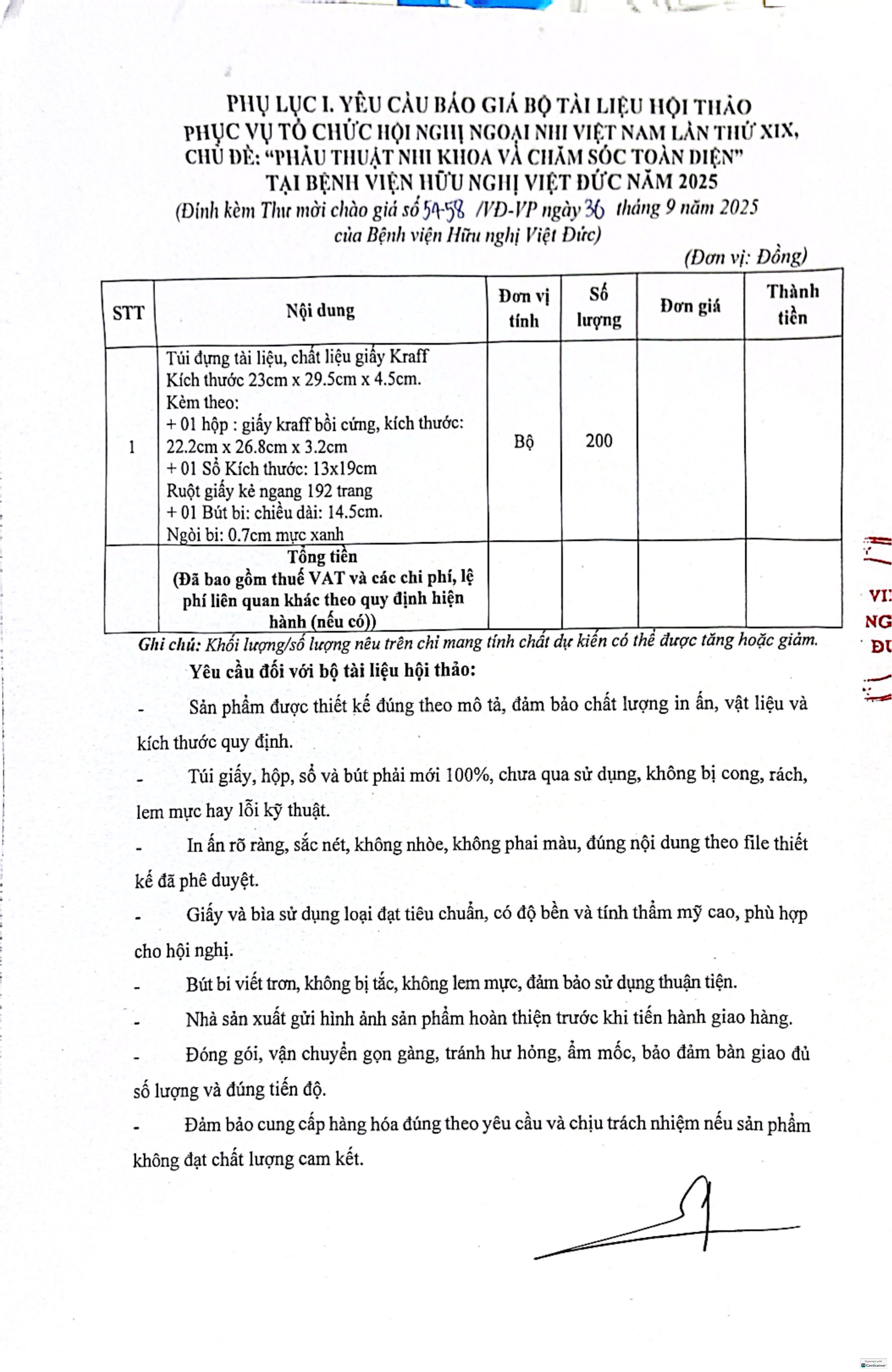 Hiện nay, Bệnh viện Hữu nghị Việt Đức có nhu cầu tiếp nhận báo giá để cung cấp bộ tài liệu hội thảo phục vụ tổ chức Hội nghị Ngoại nhi Việt Nam lần thứ XIX, chủ đề: “Phẫu thuật Nhi khoa và chăm sóc toàn diện” tại Bệnh viện Hữu nghị Việt Đức năm 2025, với nội dung cụ thể như sau: