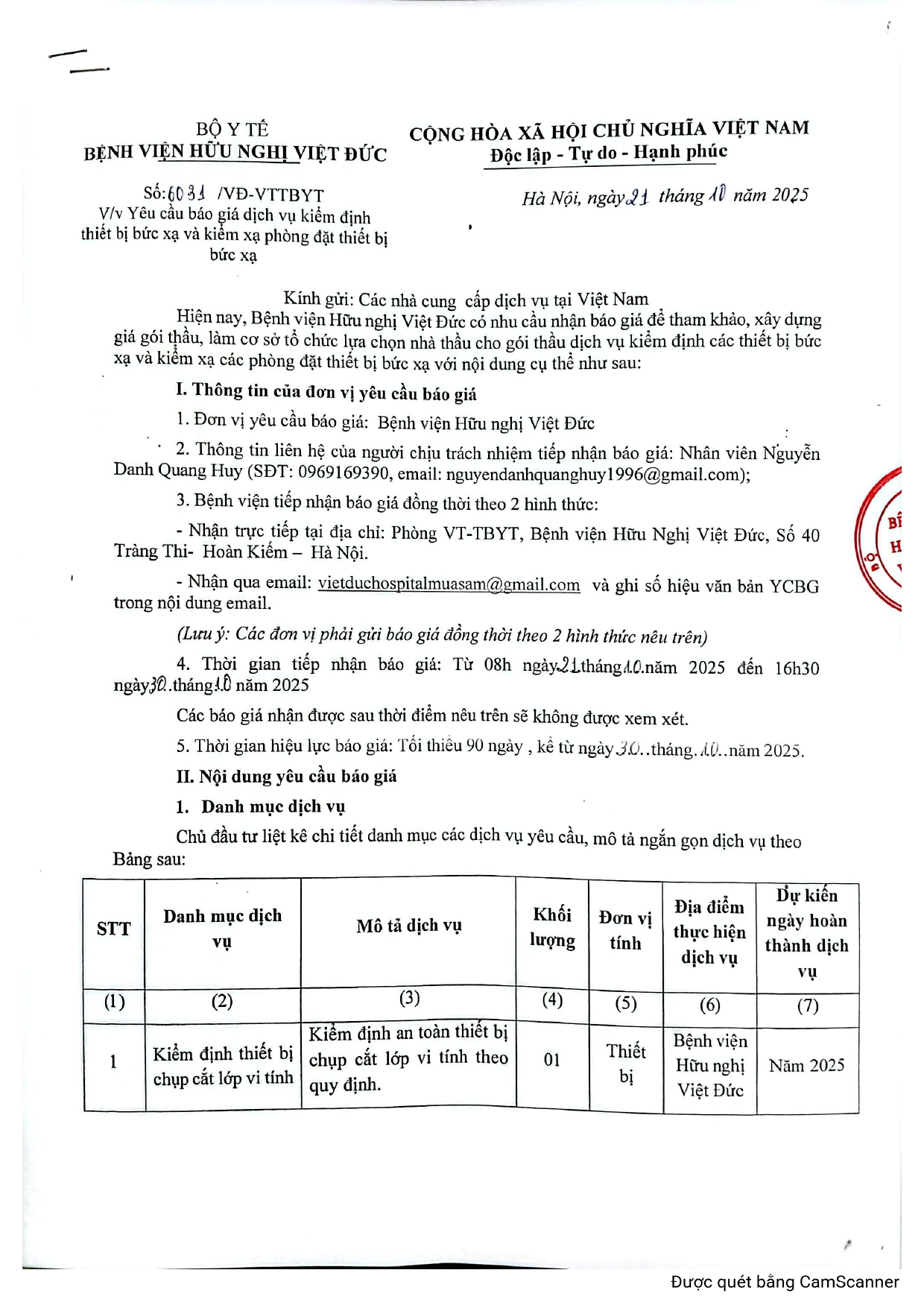 Bệnh viện Hữu Nghị Việt Đức đang có nhu cầu tiếp nhận báo giá để tham khảo xây dựng giá gói thầu làm cơ sở tổ chức lựa chọn nhà thầu cho gói thầu: Cung cấp dịch vụ sửa chữa 01 khoan xương y tế Model BJQ 1103B tại Khoa GM I với nội dung cụ thể như sau: