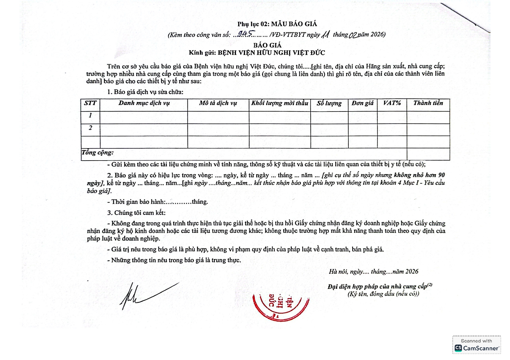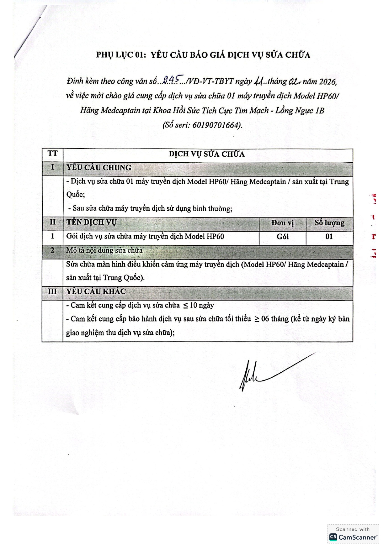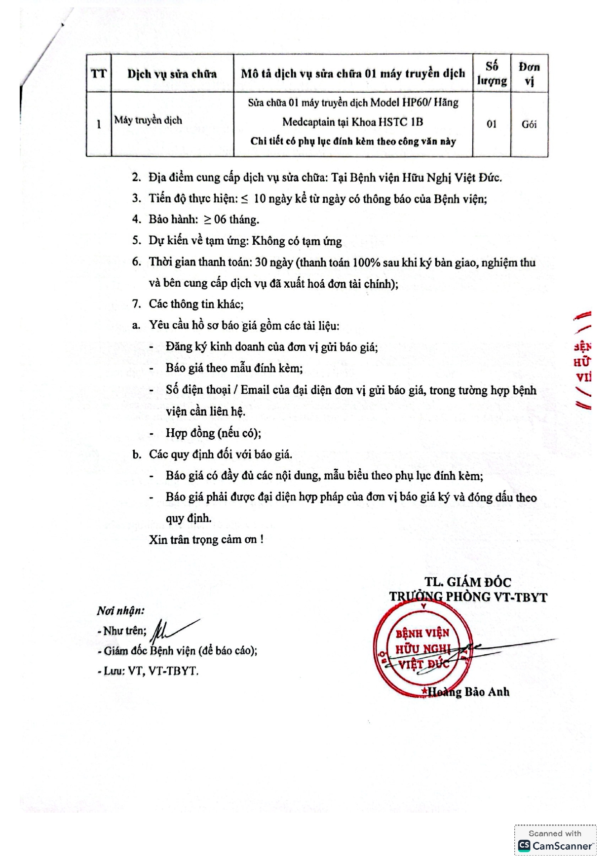 Bệnh viện Hữu Nghị Việt Đức đang có nhu cầu tiếp nhận báo giá để tham khảo xây dựng giá gói thầu làm cơ sở tổ chức lựa chọn nhà thầu cho gói thầu: Cung cấp dịch vụ sửa chữa 01 máy truyền dịch Model HP60/ Hãng Medcaptain tại Khoa Hồi Sức Tích Cực Tim Mạch Lồng Ngực 1B với nội dung cụ thể như sau: