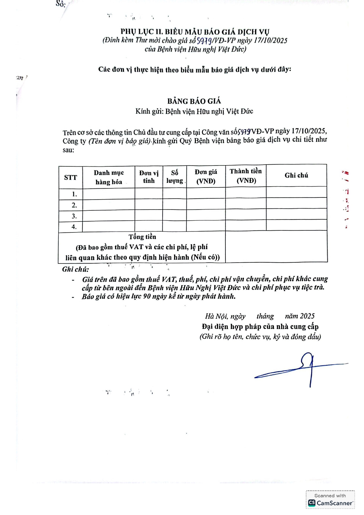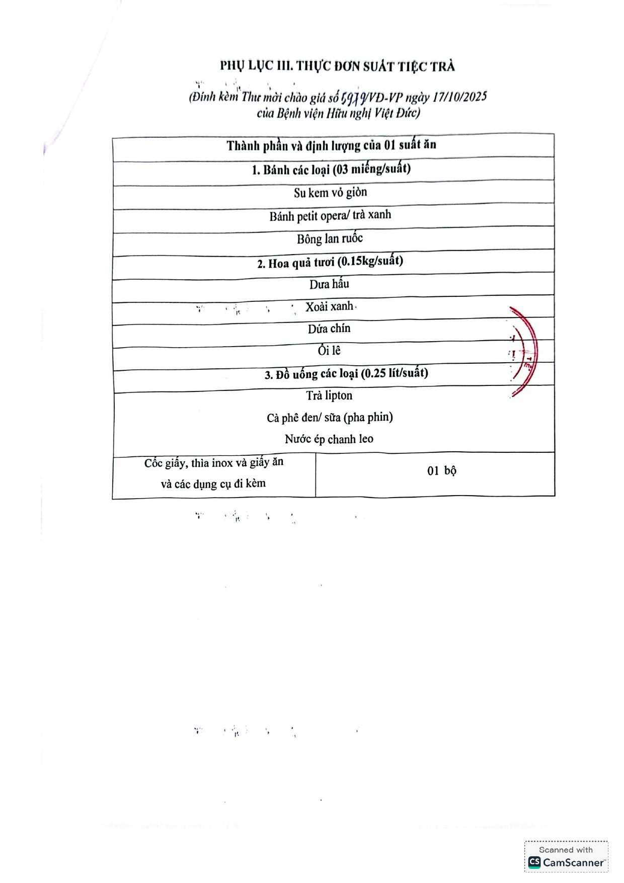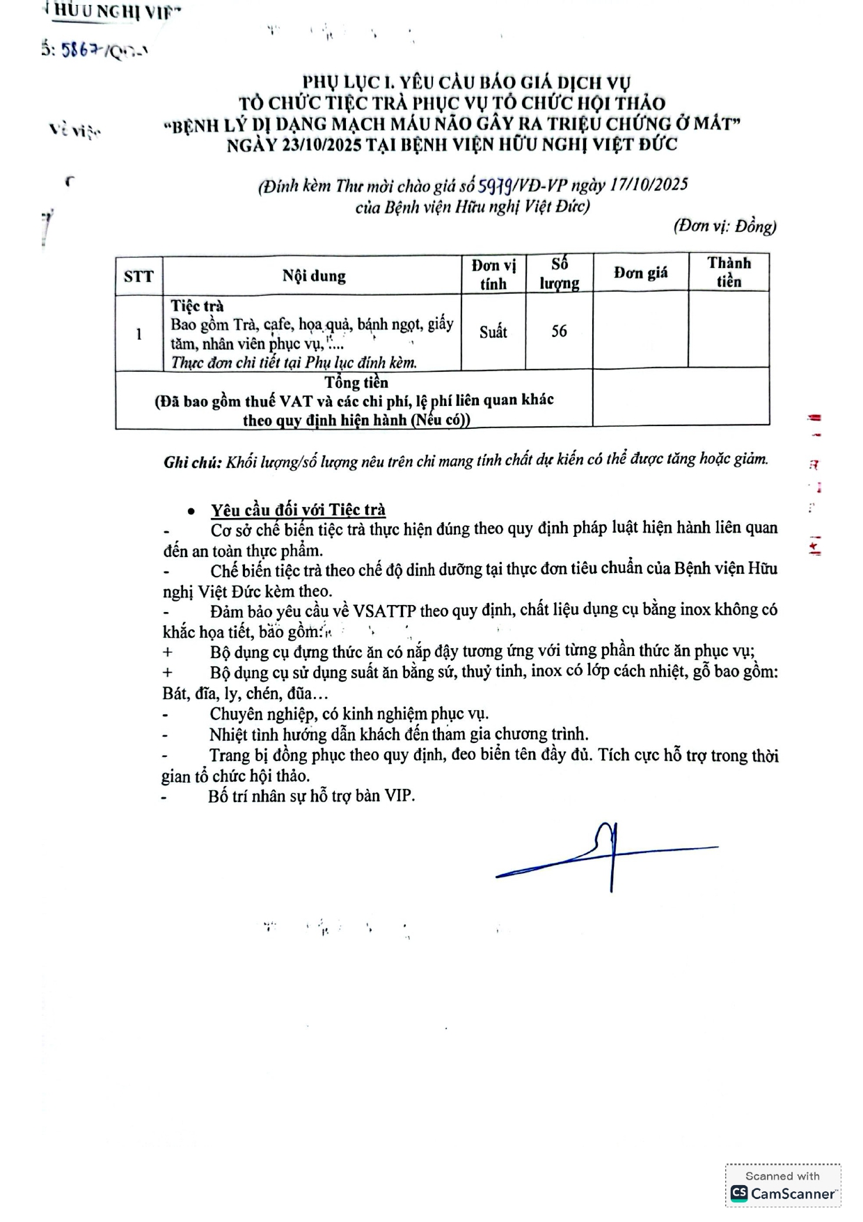 Hiện nay, Bệnh viện Hữu nghị Việt Đức có nhu cầu tiếp nhận báo giá để cung cấp dịch vụ tiệc trà phục vụ tổ chức hội thảo “Bệnh lý dị dạng mạch máu não gây ra triệu chứng ở mắt” ngày 23/10/2025 tại Bệnh viện Hữu nghị Việt Đức, với nội dung cụ thể như sau: