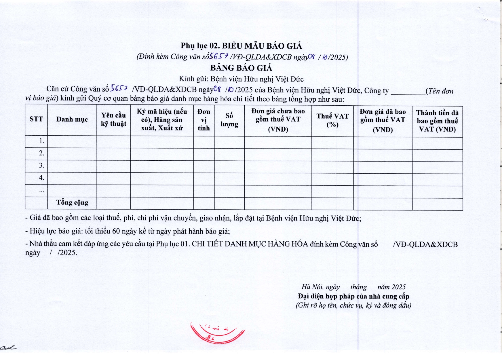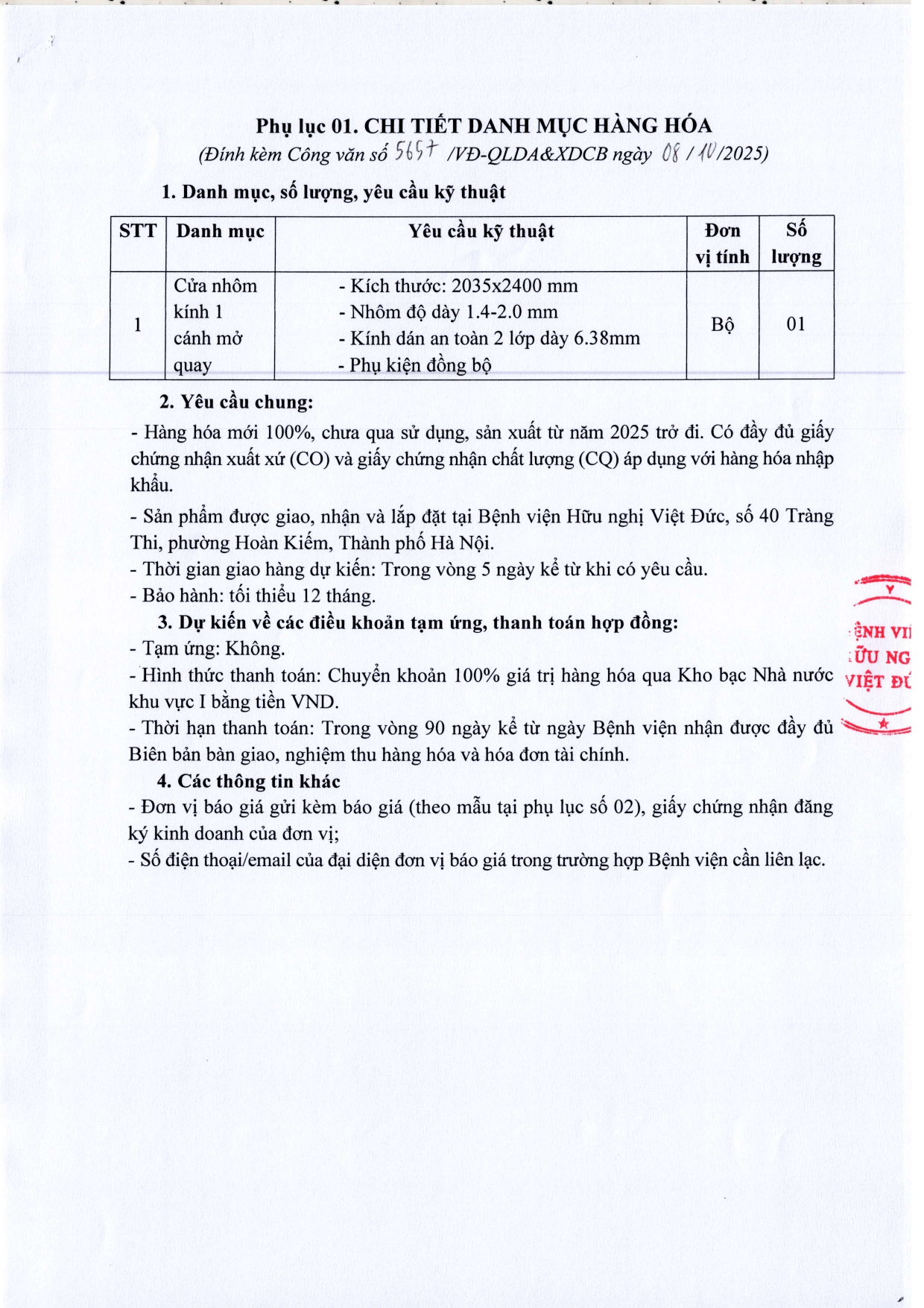 Hiện nay, Bệnh viện Hữu nghị Việt Đức có nhu cầu mua sắm cửa nhôm kính 1 cánh mở quay. Để có cơ sở tham khảo giá mặt hàng cửa nhôm kính 1 cánh mở quay trên thị trường, Bệnh viện Hữu nghị Việt Đức kính mời các đơn vị có khả năng cung cấp báo giá mặt hàng trên với nội dung cụ thể như sau: