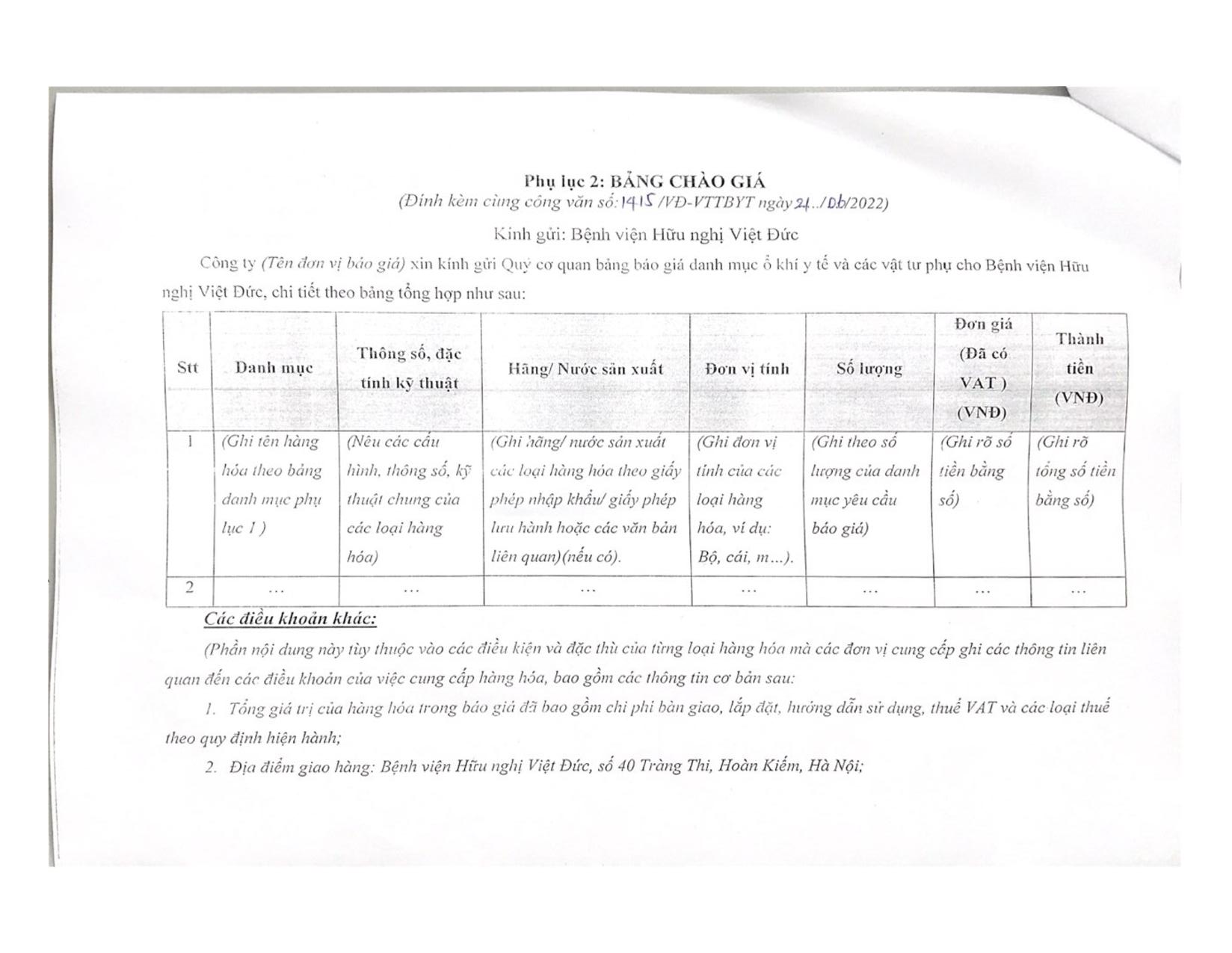Bệnh viện Hữu nghị Việt Đức mời chào giá cung cấp mua sắm, lắp đặt ổ khí y tế và các vật tư phụ