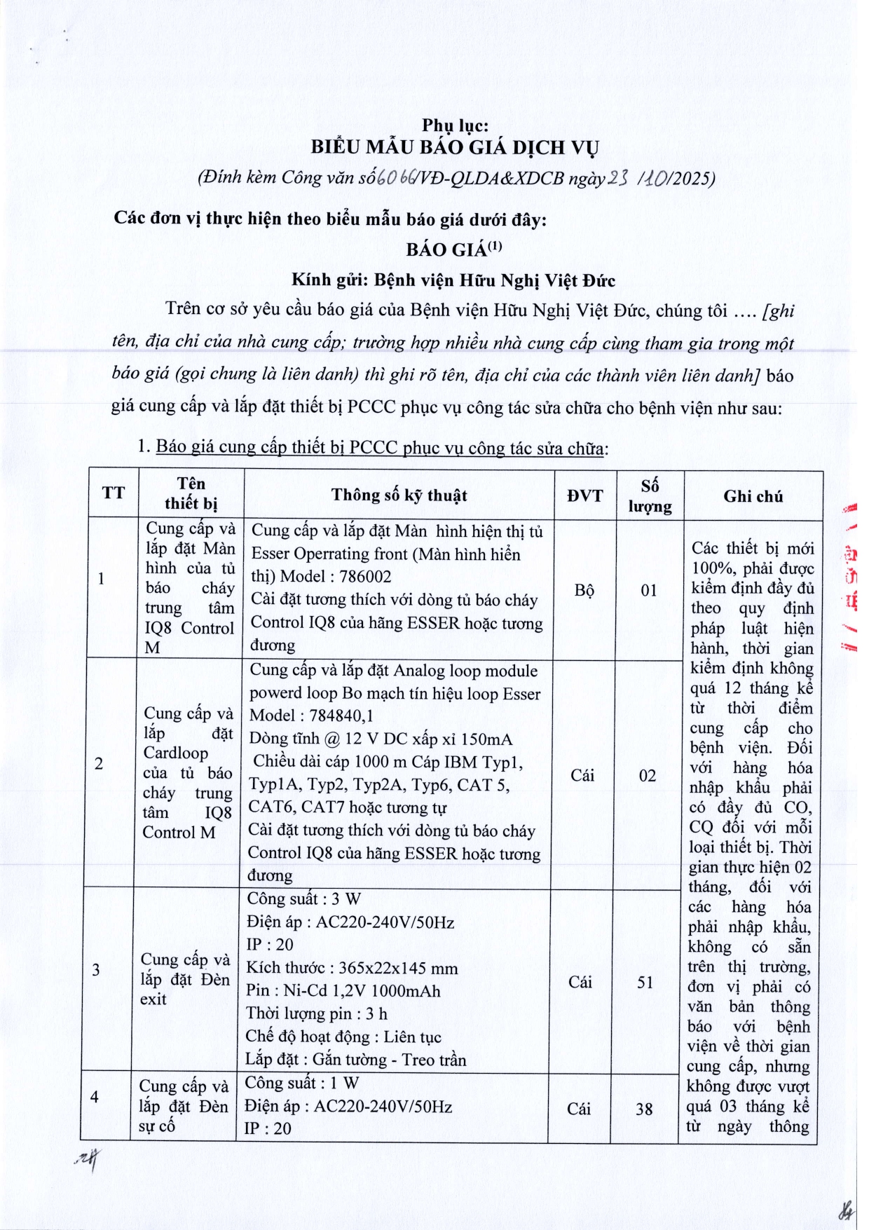 Bệnh viện Hữu nghị Việt Đức mời chào giá cung cấp và lắp đặt thiết bị PCCC phục vụ công tác sửa chữa cho nhà D của bệnh viện