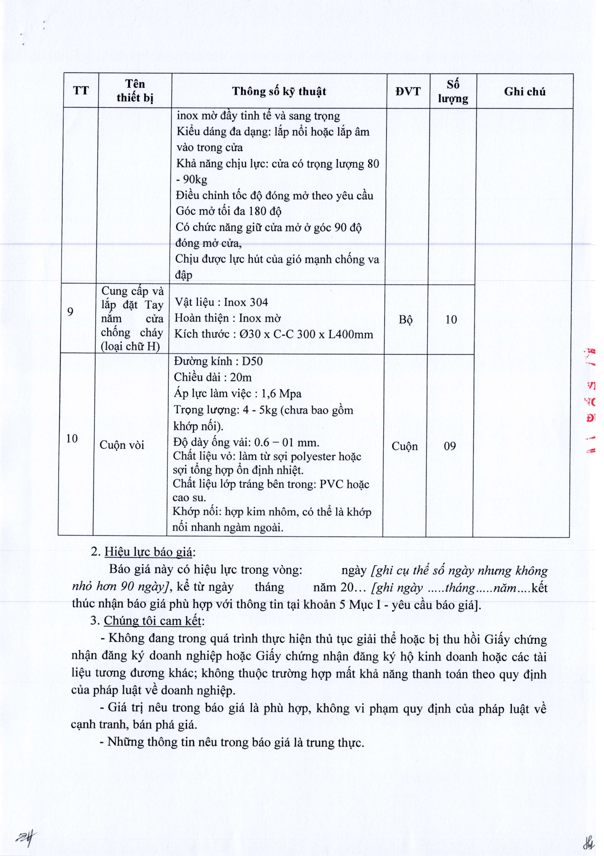 Hiện nay, Bệnh viện có nhu cầu tiếp nhận báo giá để tham khảo, xây dựng giá, làm cơ sở tổ chức lựa chọn đơn vị cho hạng mục cung cấp và lắp đặt thiết bị PCCC phục vụ công tác sửa chữa cho nhà D của bệnh viện với nội dung cụ thể như sau: