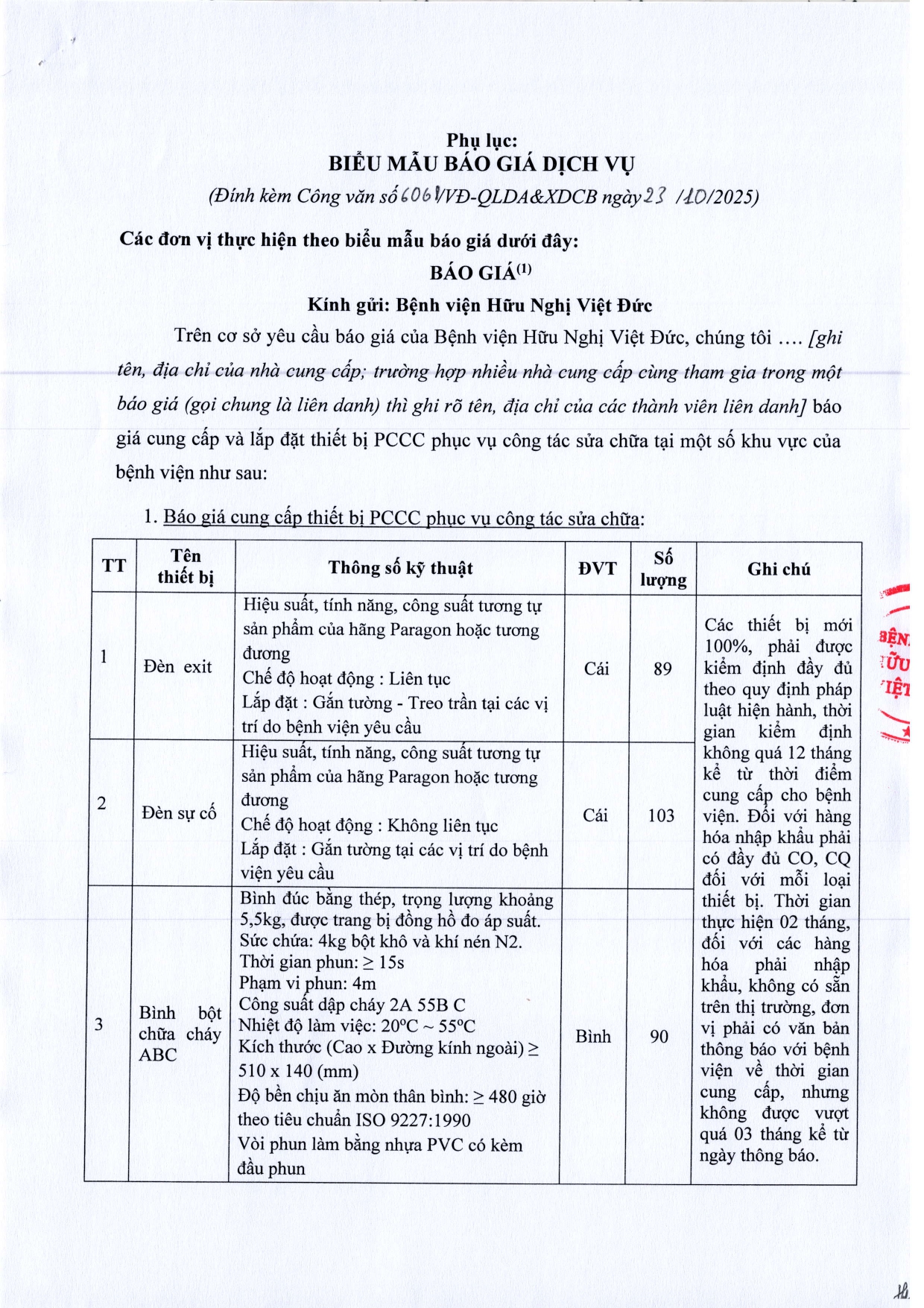 Bệnh viện Hữu nghị Việt Đức mời chào giá cung cấp và lắp đặt thiết bị PCCC phục vụ công tác sửa chữa tại một số khu vực của bệnh viện