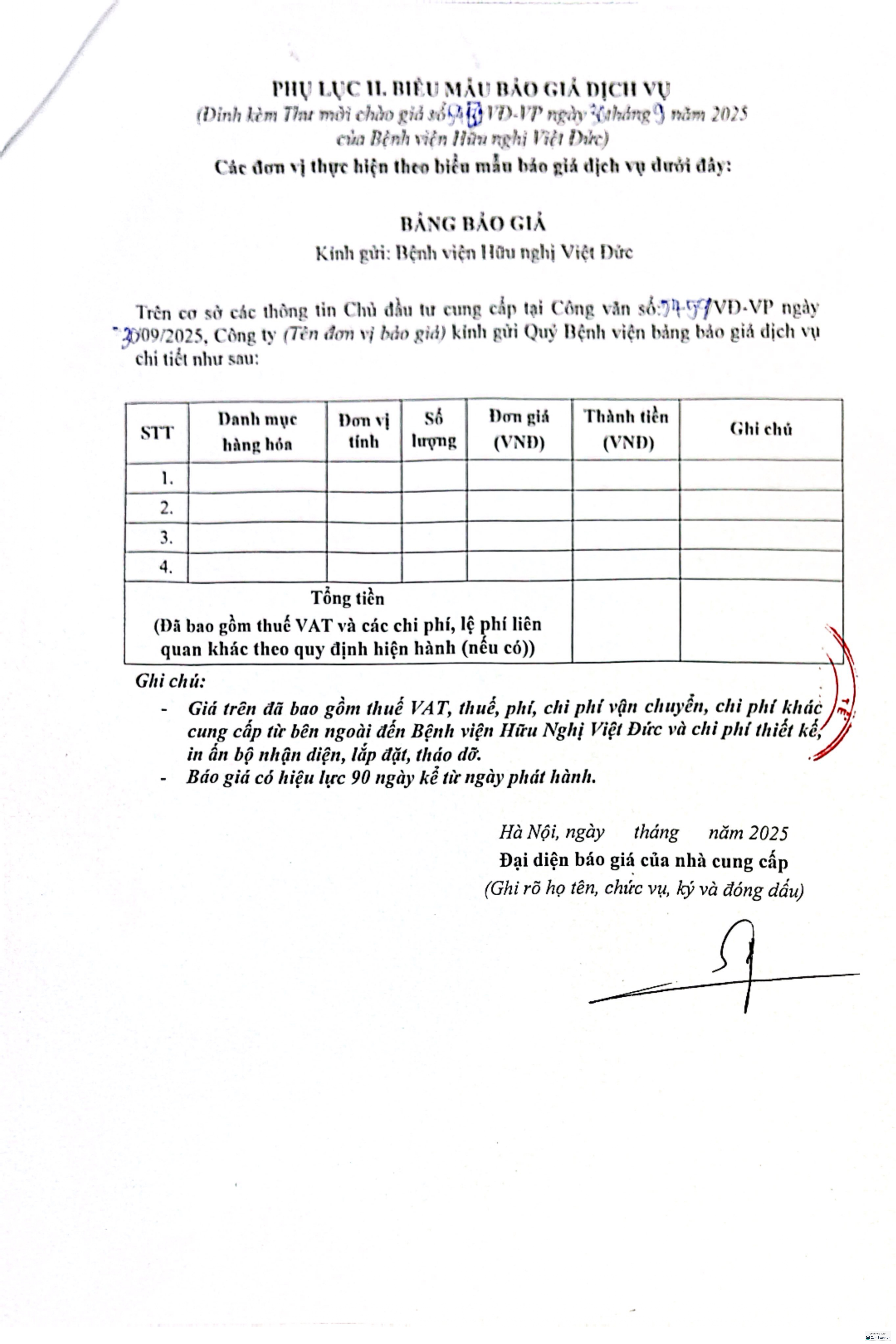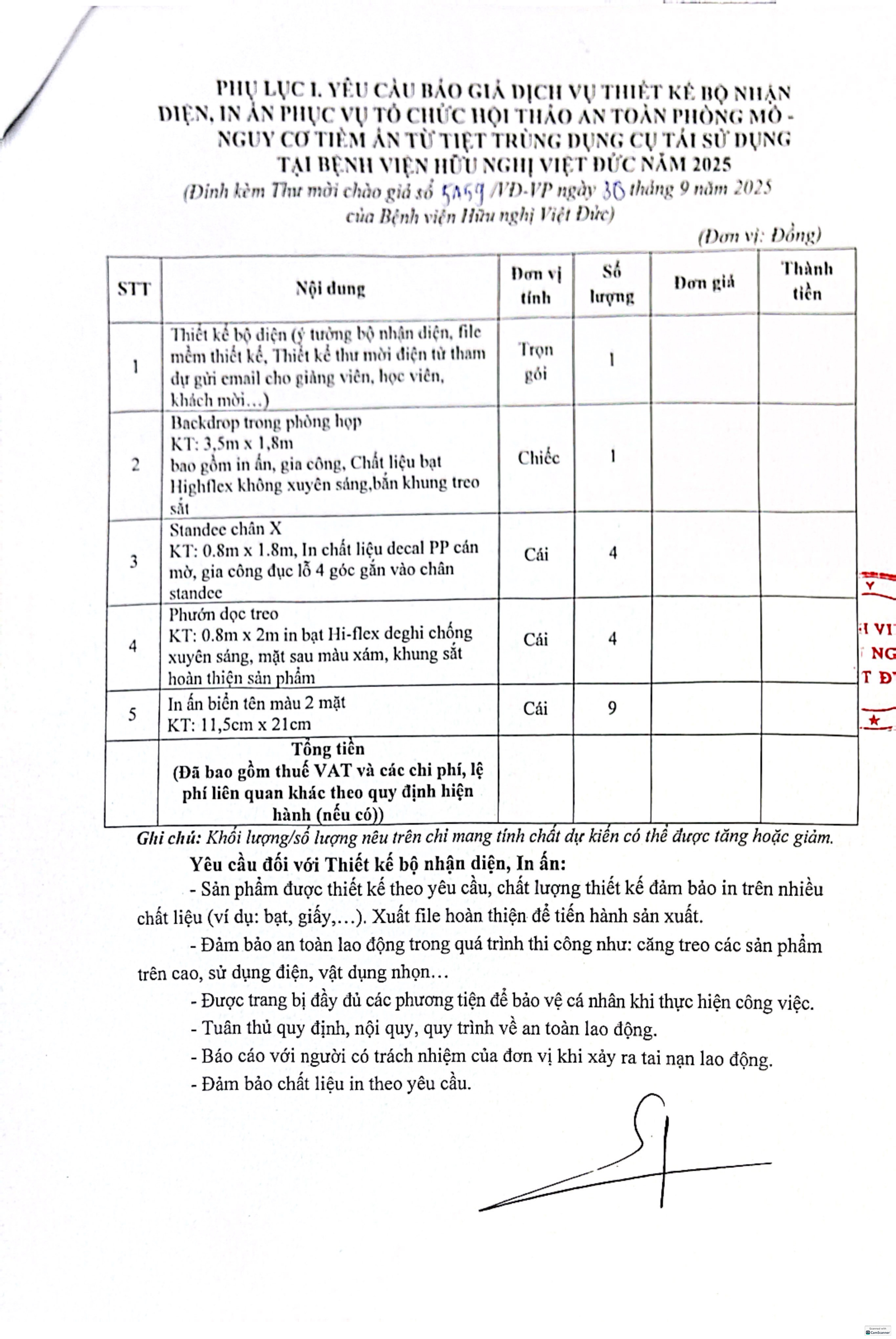 Hiện nay, Bệnh viện Hữu nghị Việt Đức có nhu cầu tiếp nhận báo giá để cung cấp dịch vụ thiết kế bộ nhận diện, in ấn phục vụ tổ chức Hội thảo: “An toàn phòng mổ – Nguy cơ tiềm ẩn từ tiệt trùng dụng cụ tái sử dụng” tại Bệnh viện Hữu nghị Việt Đức năm 2025, với nội dung cụ thể như sau: