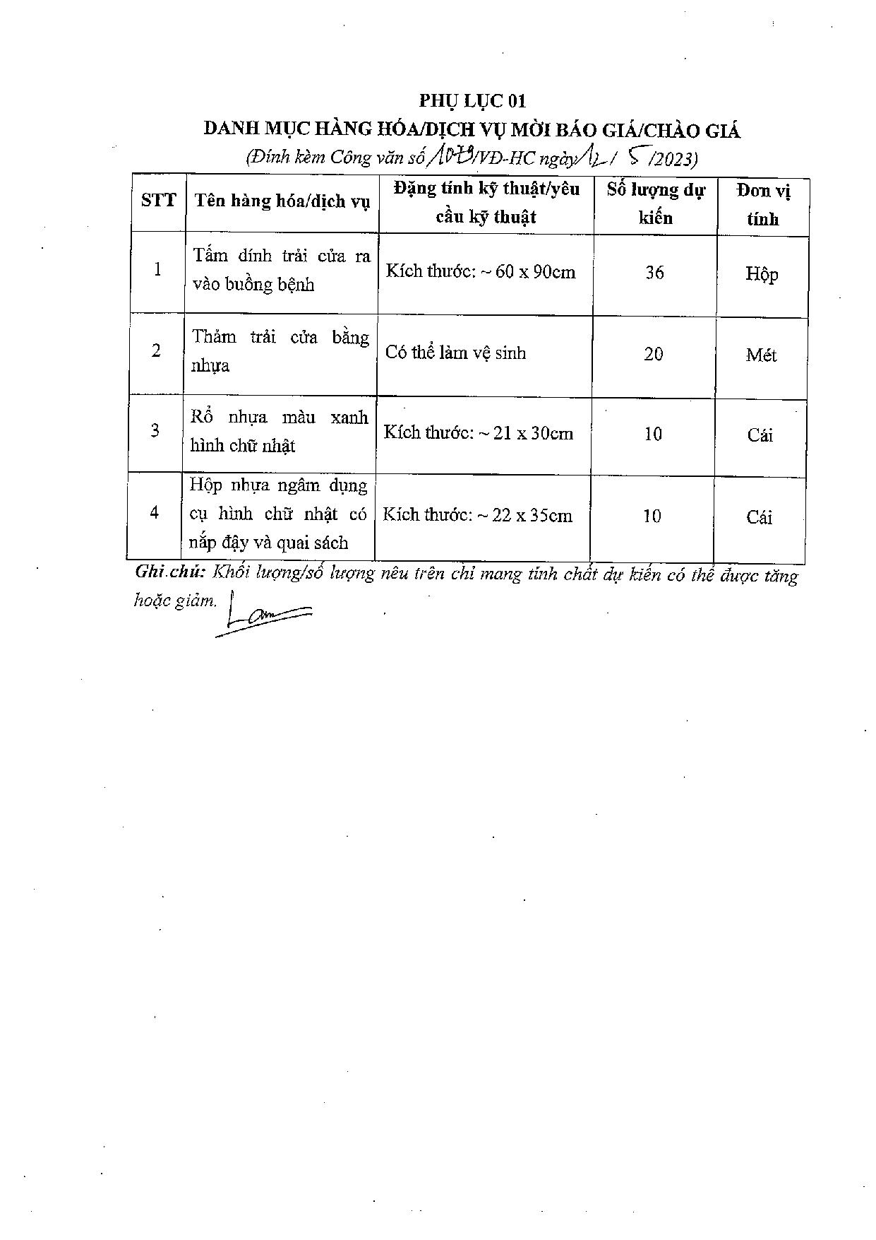 Hiện nay, Bệnh viện Hữu nghị Việt Đức có nhu cầu mua một số hàng hóa cho khoa cho khoa HSTC1 để phục vụ công tác chuyên môn. Để có cơ sở tham khảo giá các hàng hóa trên thị trường, kính mời các Đơn vị có khả năng cung cấp, chào/báo giá cho bệnh viện (chi tiết danh mục, số lượng được giới thiệu tại phụ lục 01 kèm theo).
